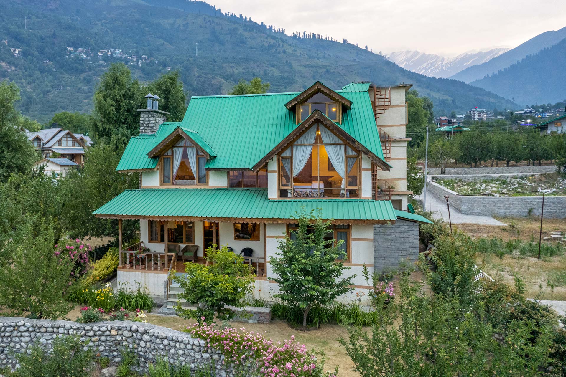 Nestled among apple orchards with stunning views of the Himalayas, the villa o...