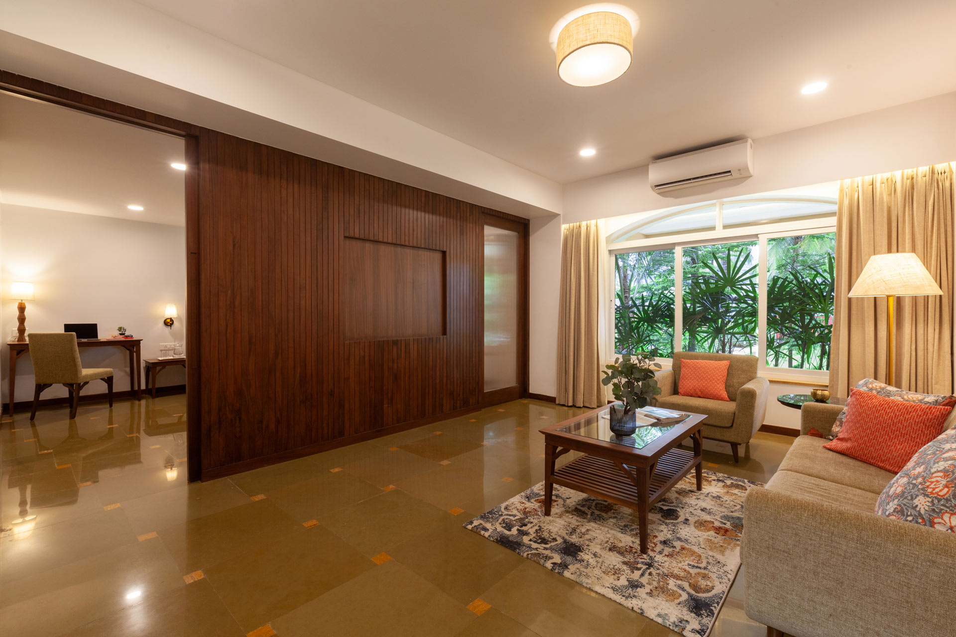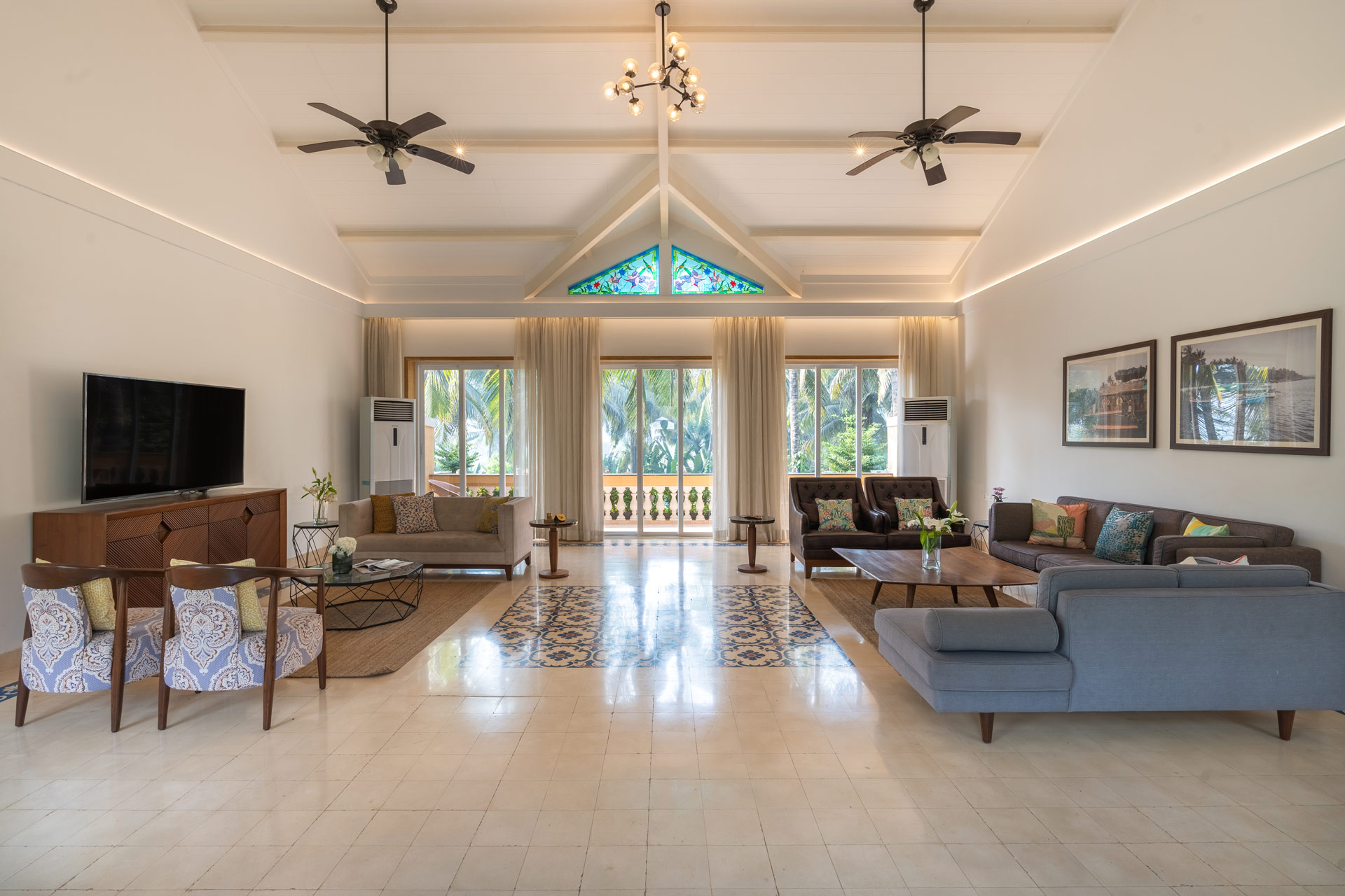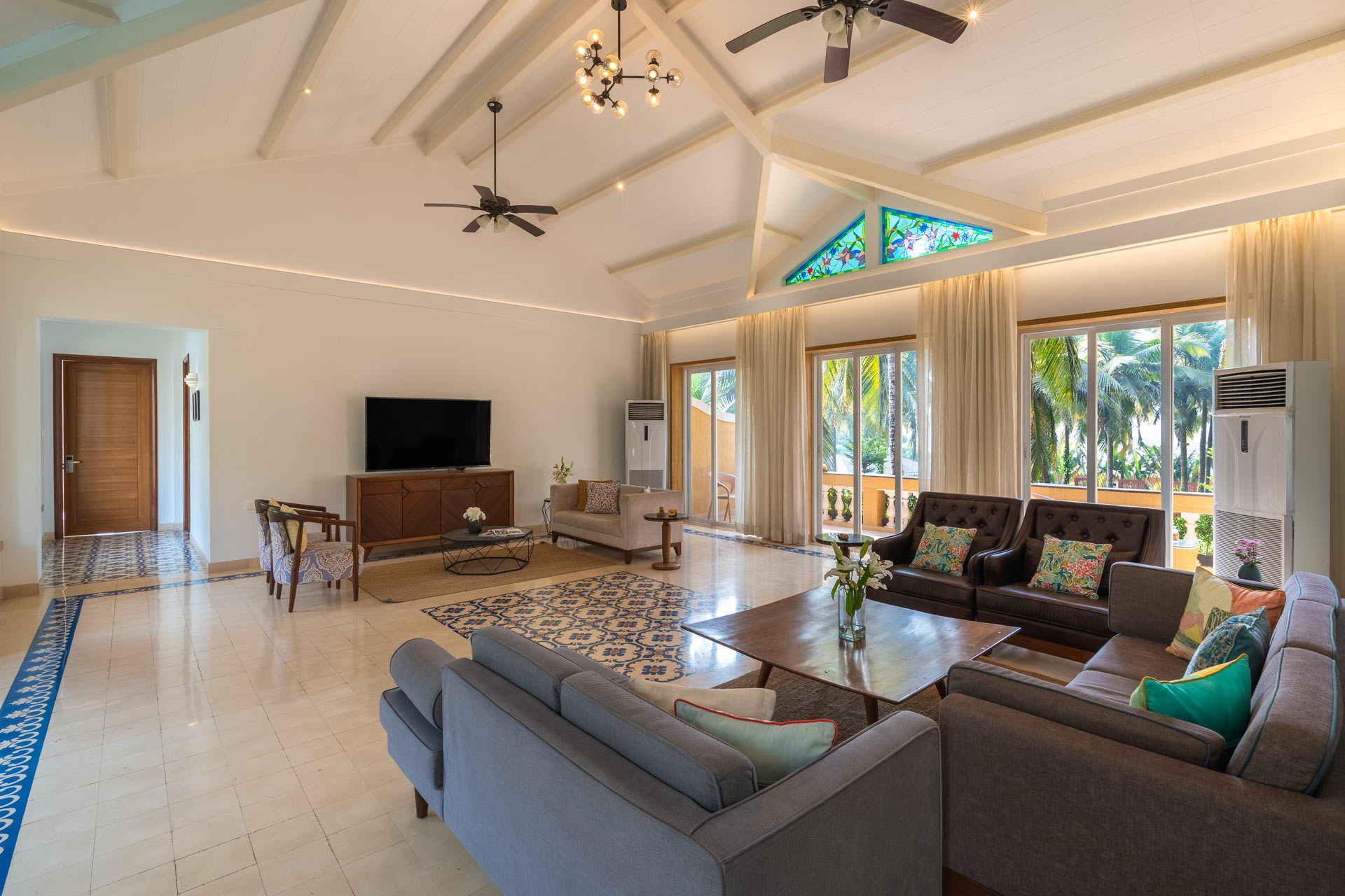 – The living room is equipped with several modern amenities, including a widescreen television, 2 tower ACs, and couch-style seating that can accommodate up to 15-20 people comfortably.
