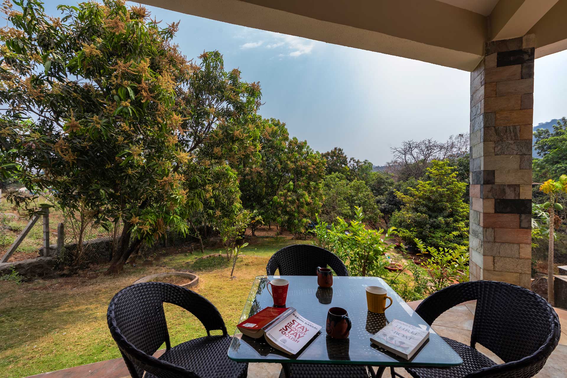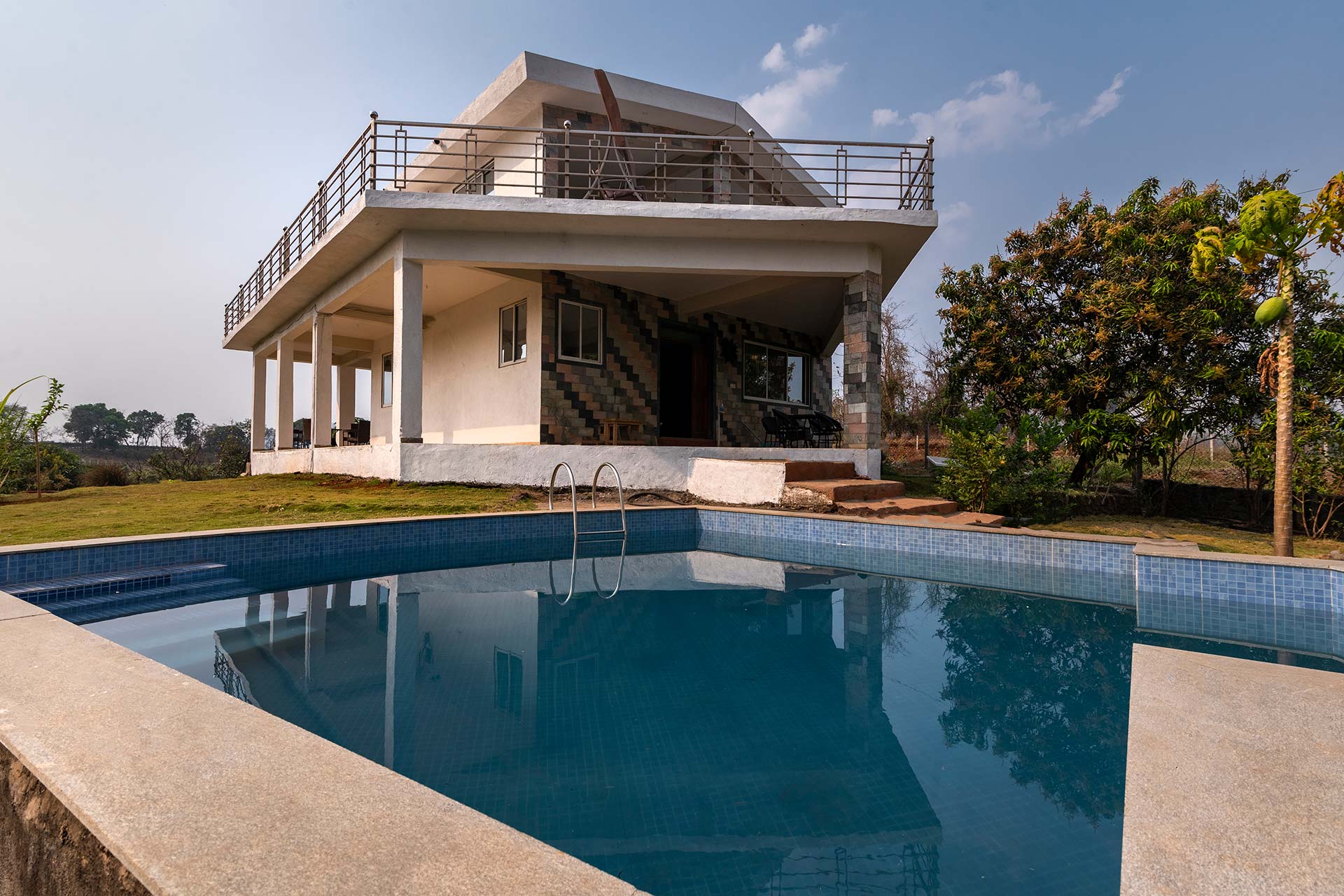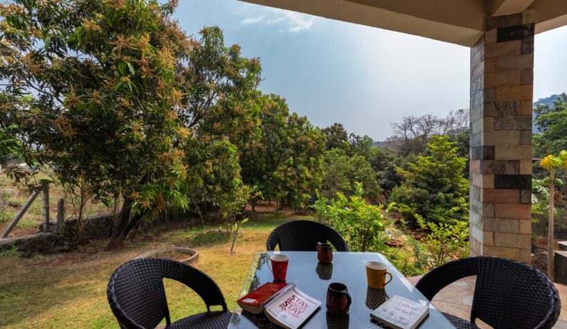 Set foot through the brown doors for a relaxing and rejuvenating getaway amidst endless greenery. Located in the serene town of Karjat, this quaint villa is nestled in a cosy nook, swathed in incredible landscapes and a refreshing breeze. It offers spacious indoor spaces, tastefully furnished with modern conveniences to ensure your utmost comfort. Seamlessly opening up to the outdoors, the home features lush green lawns and gardens and is situated by the river. Guests can take a lazy stroll by the river, enjoy a splash in the private swimming pool and savour the breathtaking views that are bound to surround them.