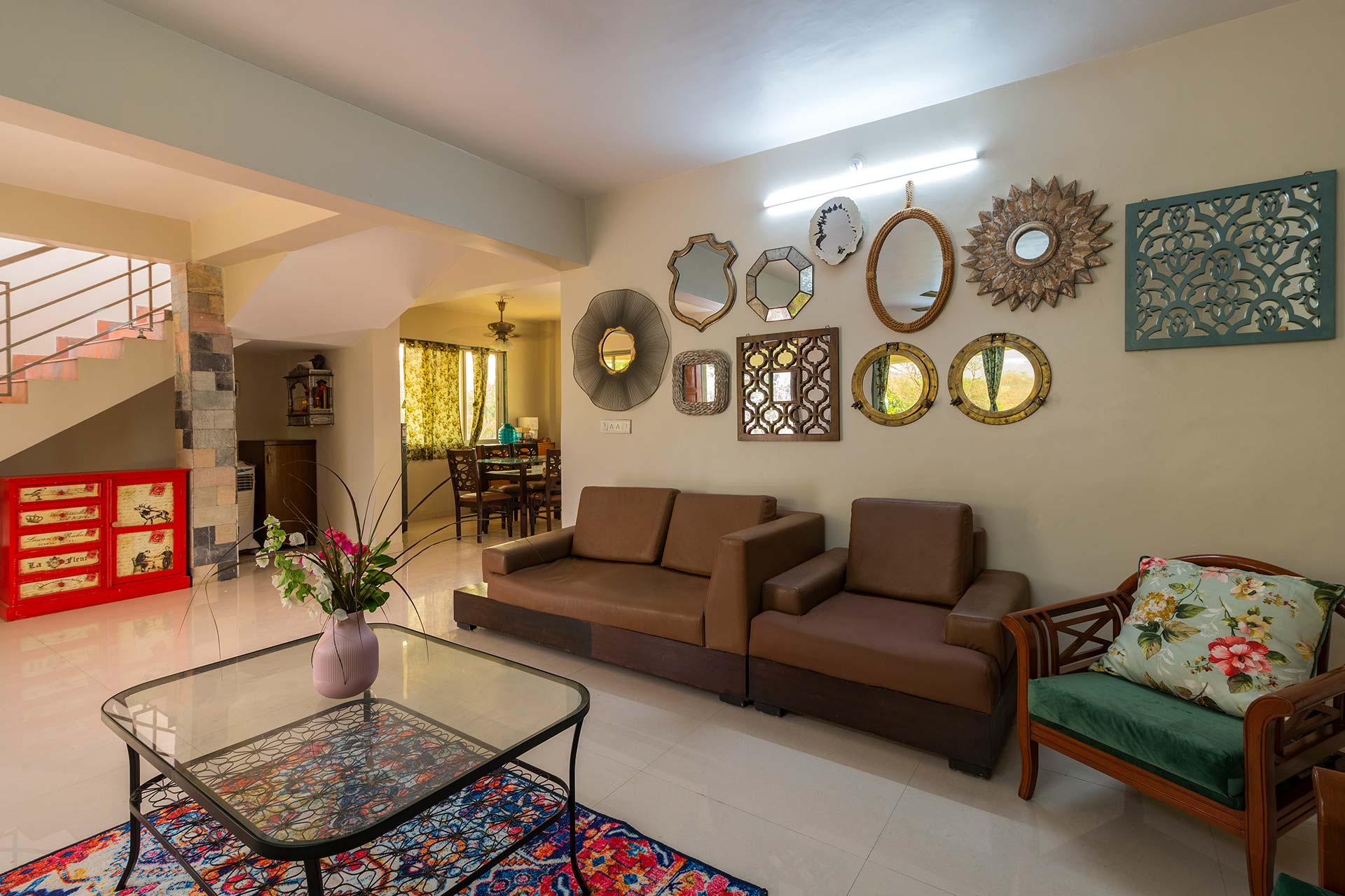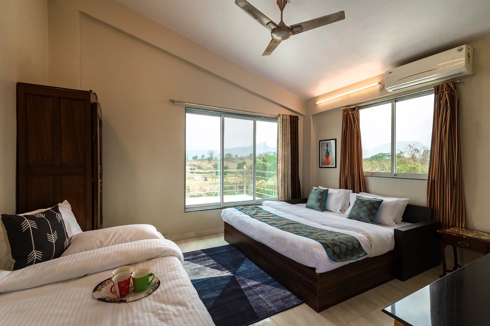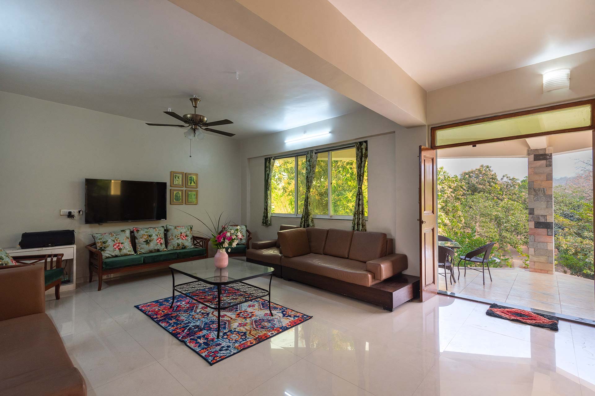 Set foot through the brown doors for a relaxing and rejuvenating getaway amidst endless greenery. Located in the serene town of Karjat, this quaint villa is nestled in a cosy nook, swathed in incredible landscapes and a refreshing breeze. It offers spacious indoor spaces, tastefully furnished with modern conveniences to ensure your utmost comfort. Seamlessly opening up to the outdoors, the home features lush green lawns and gardens and is situated by the river. Guests can take a lazy stroll by the river, enjoy a splash in the private swimming pool and savour the breathtaking views that are bound to surround them.