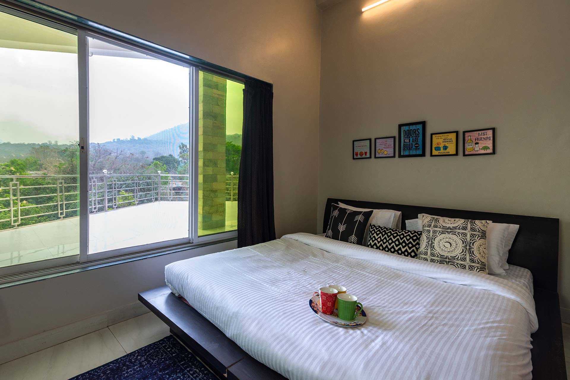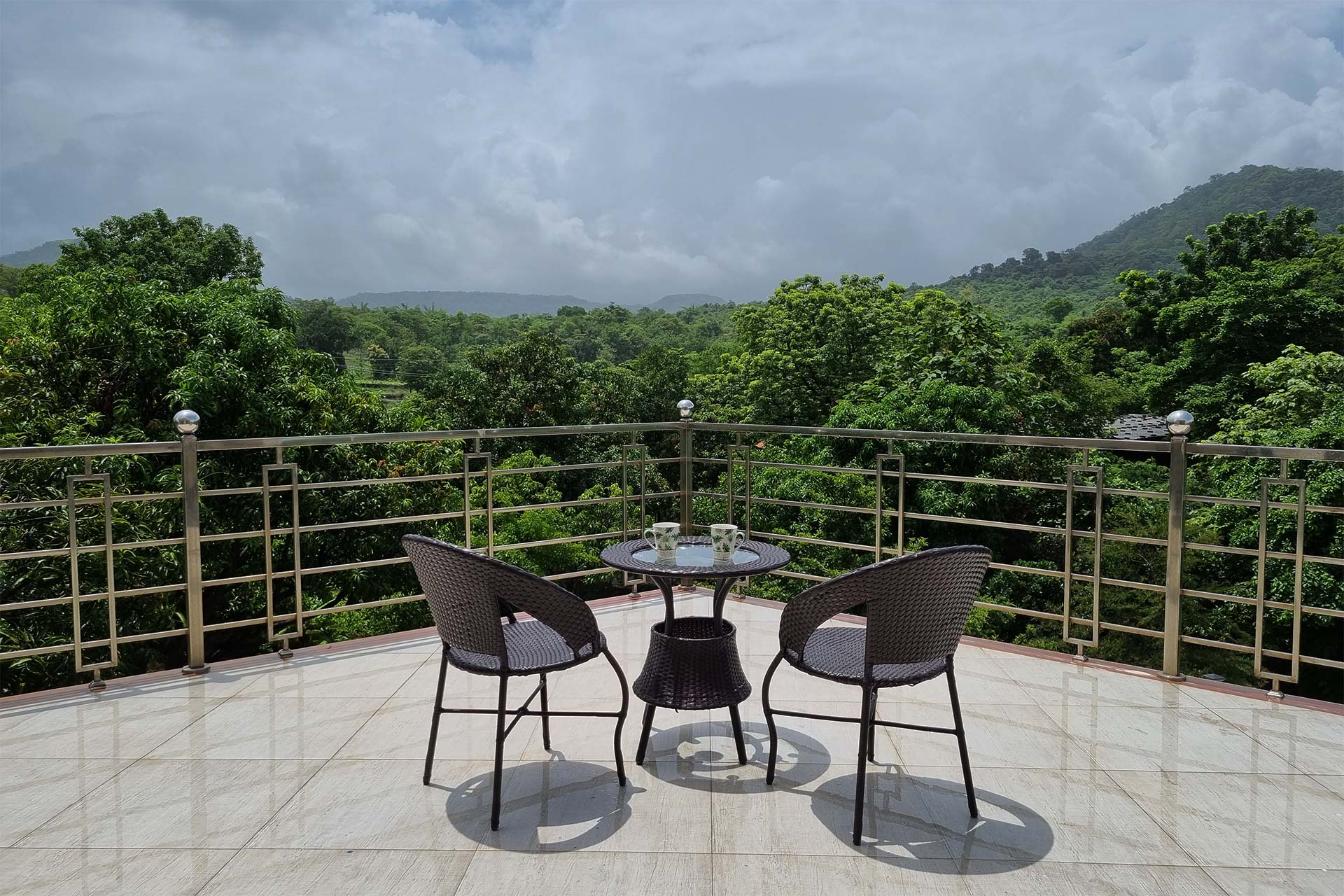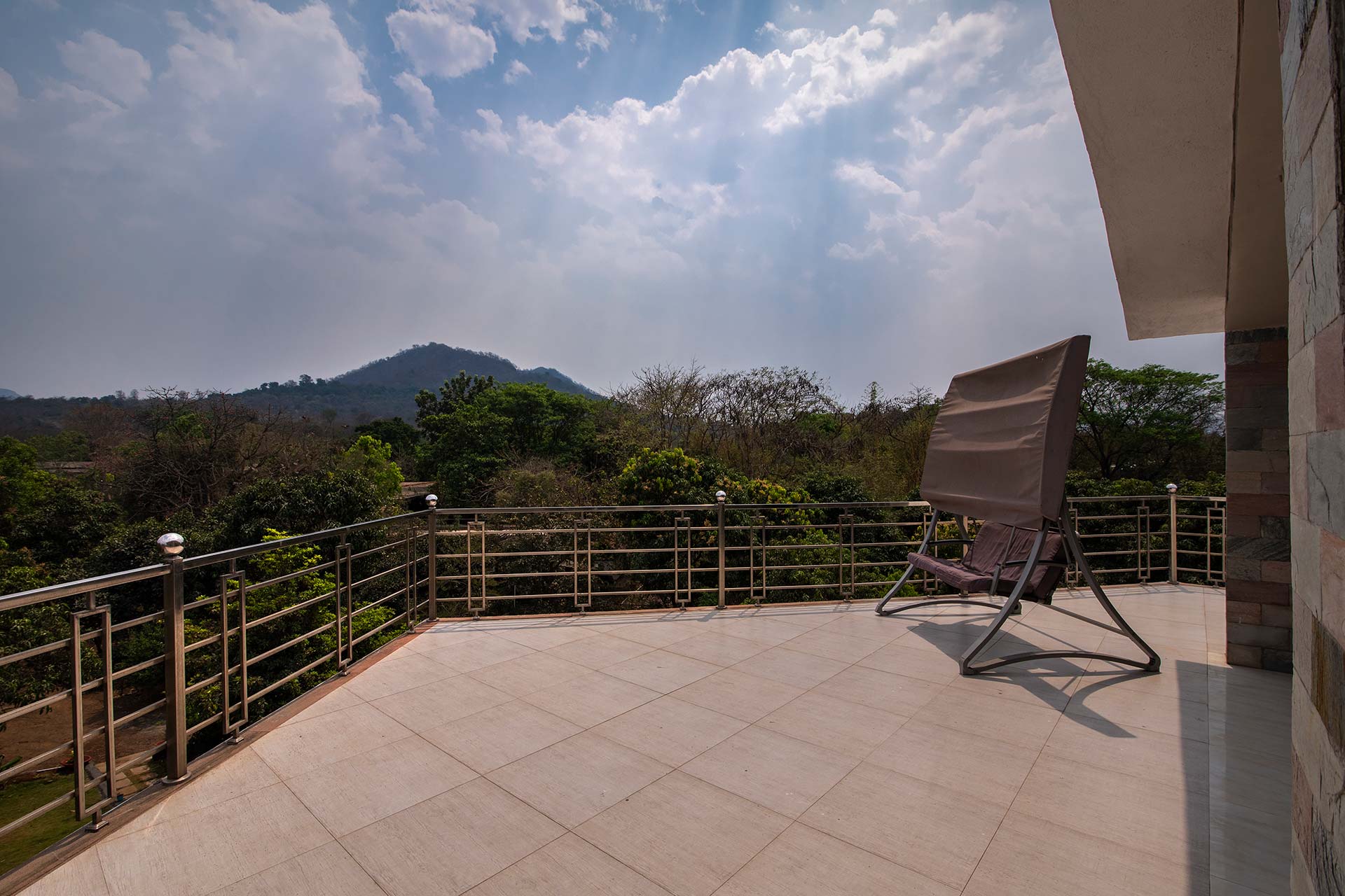 – Guests can soak in the picturesque views from the private terrace, complete with seating arrangements and a swing.