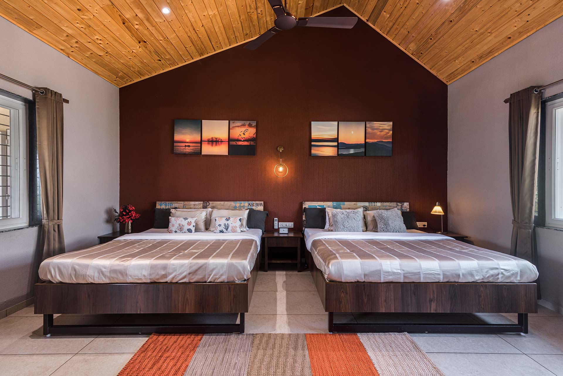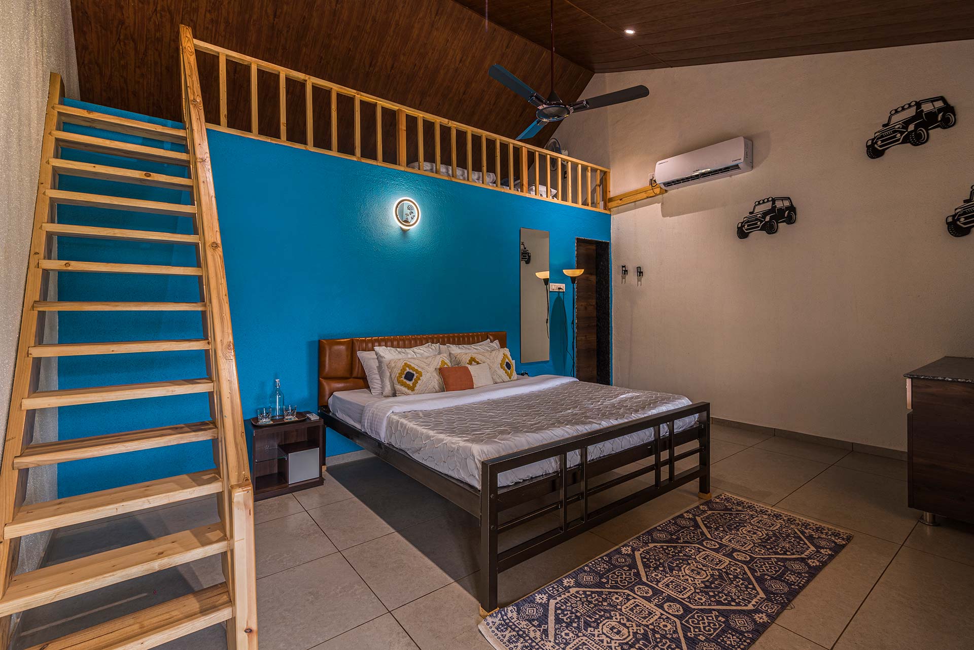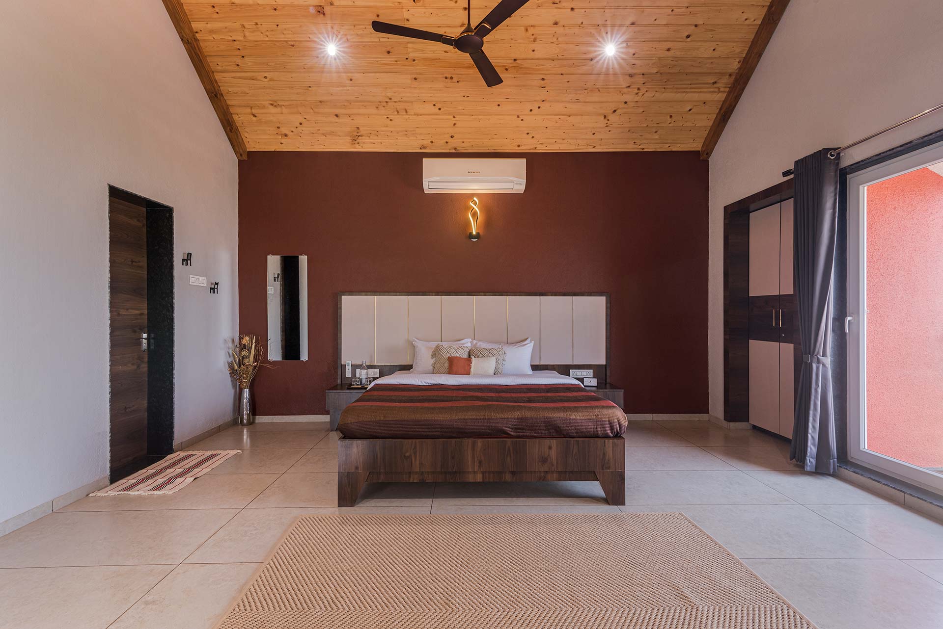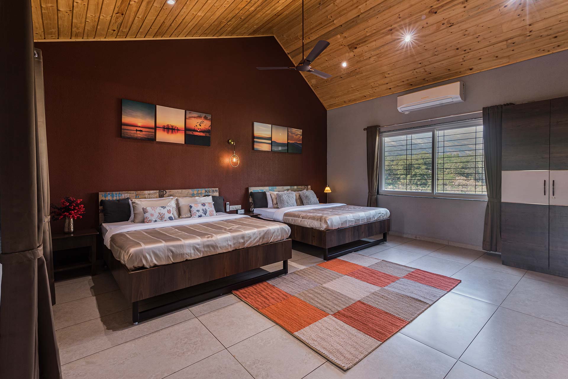 – Each room exuding a warm yet vibrant aura, is replete with a range of modern amenities such as a king-sized bed, extra mattresses, AC, Wi-Fi access, wardrobe, and an electric kettle.
