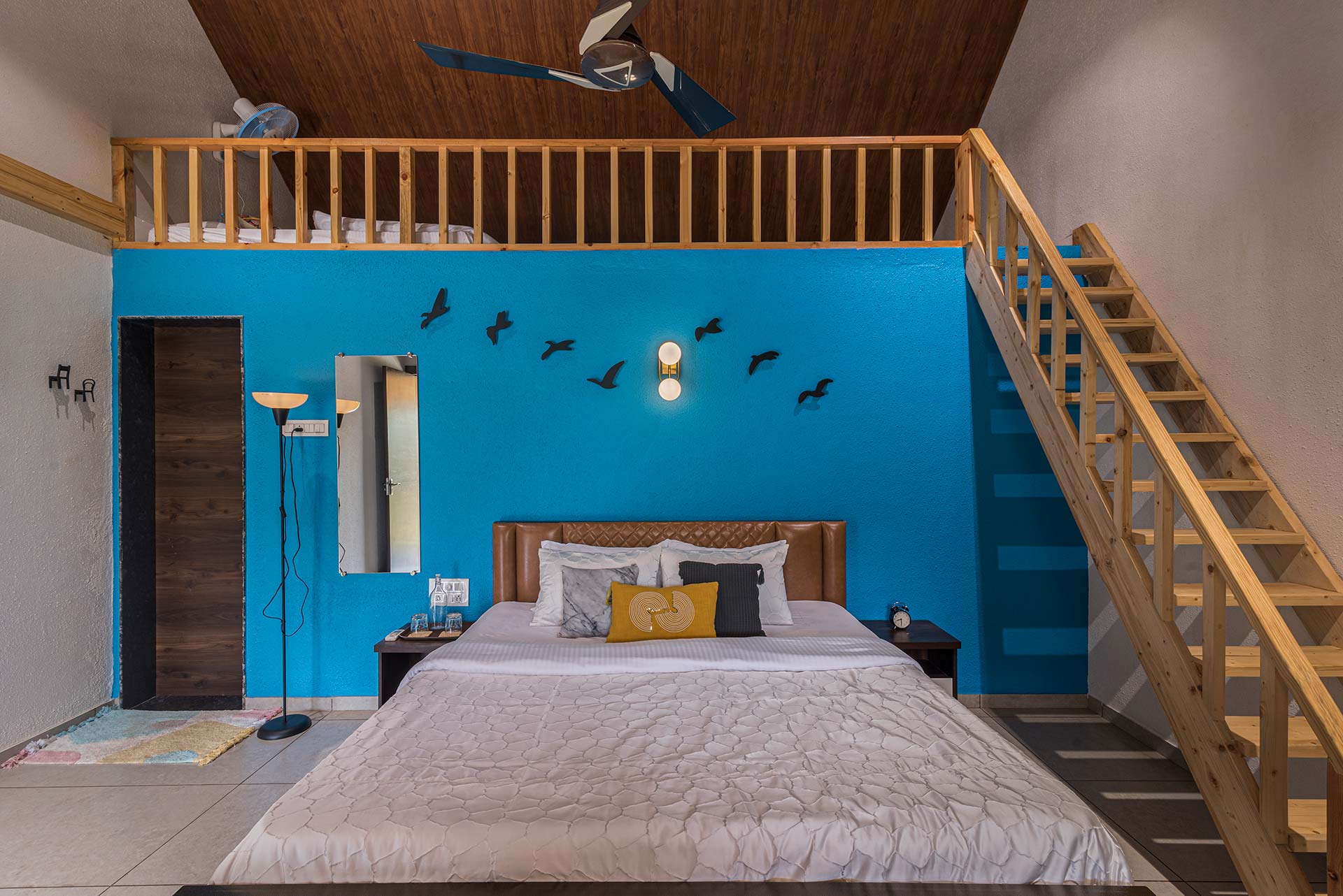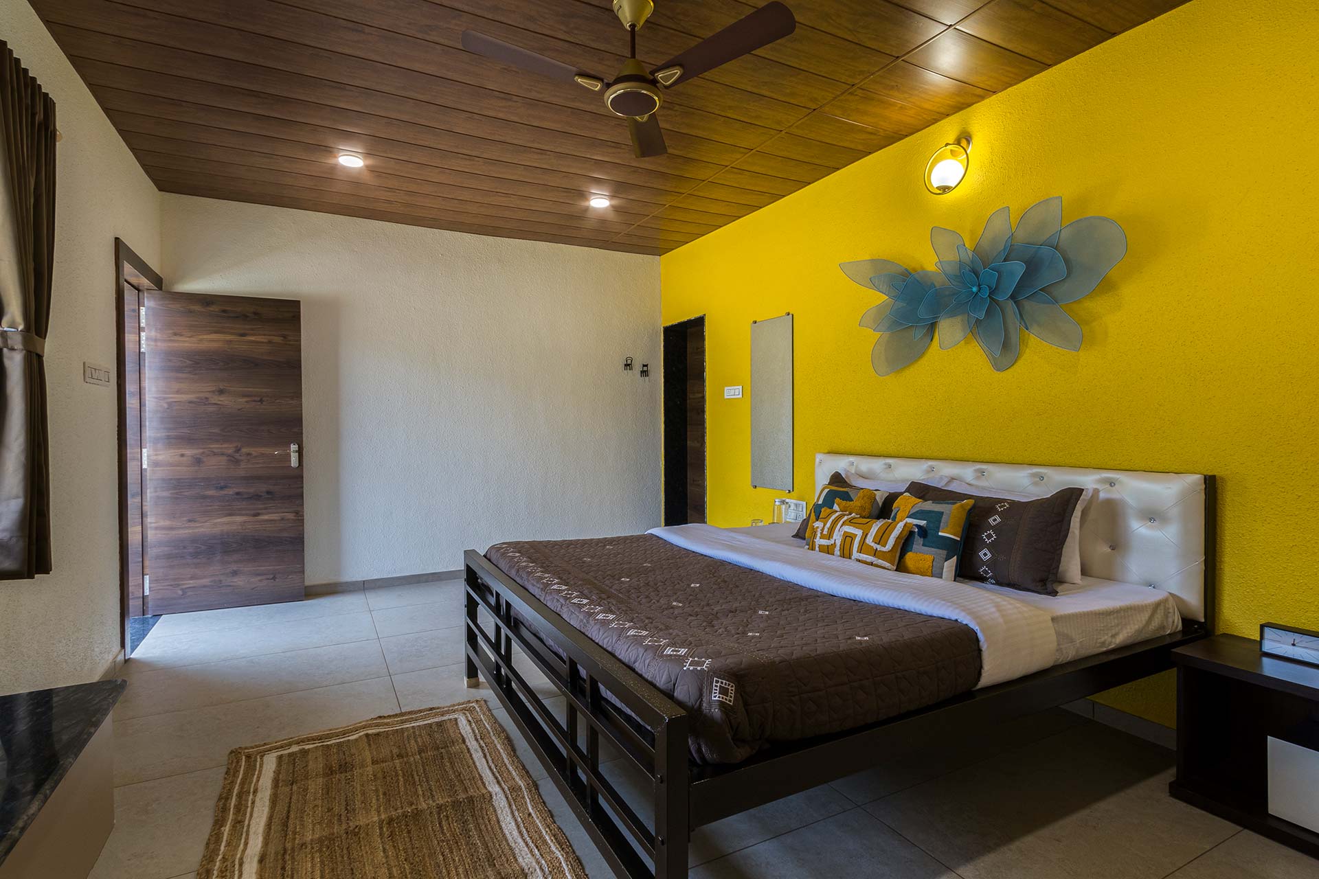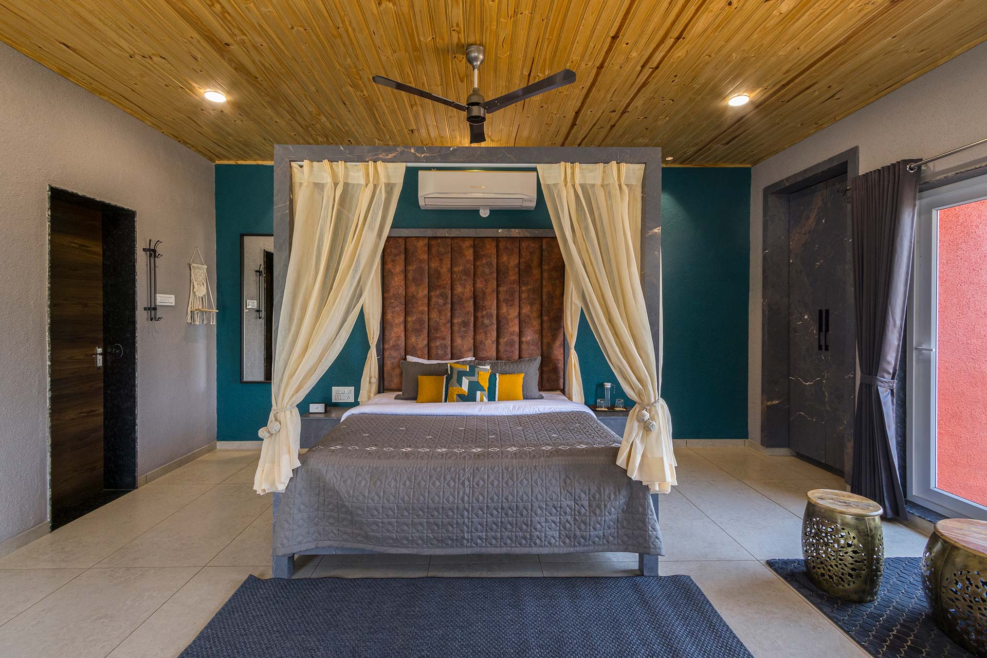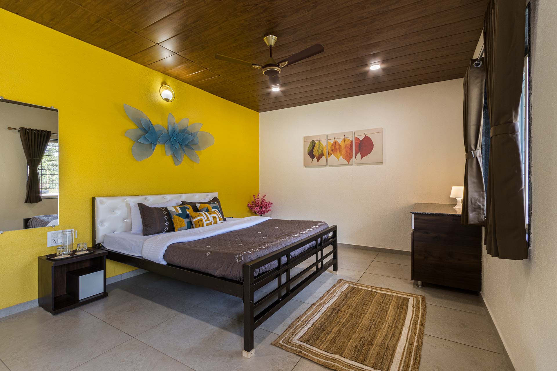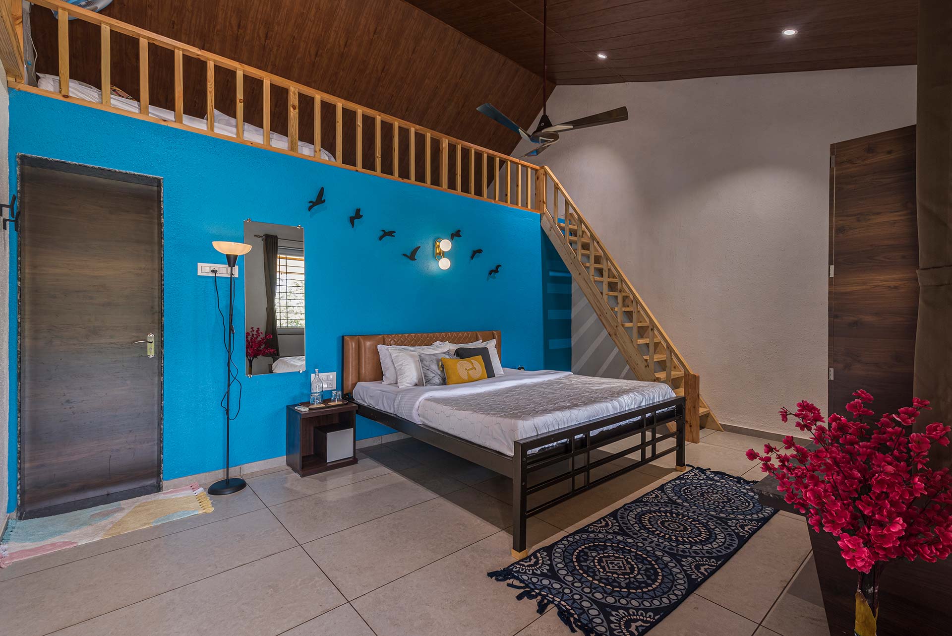 – Each room exuding a warm yet vibrant aura, is replete with a range of modern amenities such as a king-sized bed, extra mattresses, AC, Wi-Fi access, wardrobe, and an electric kettle.