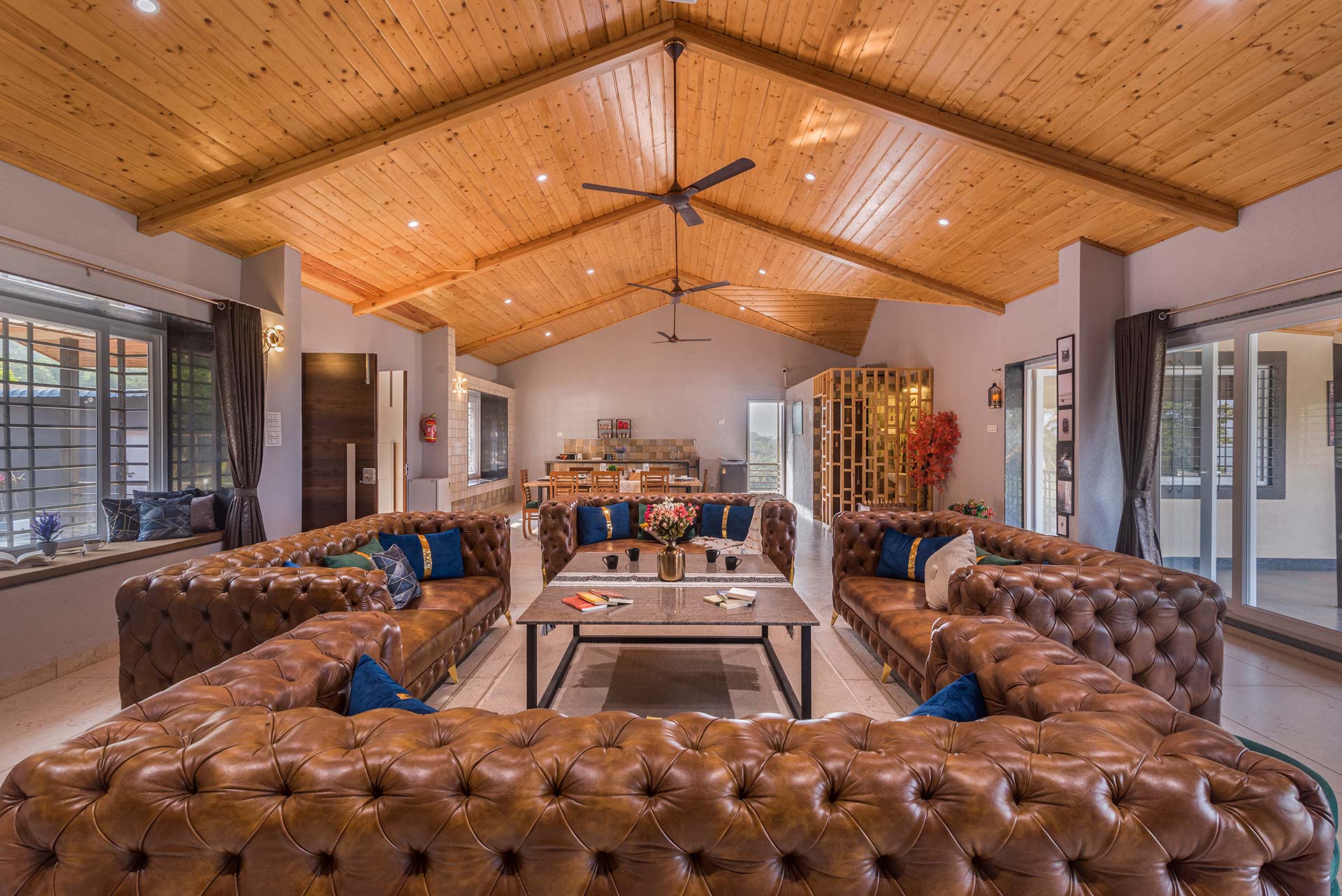 Asanjo Villa offers beautiful and expansive views while resting in the midst of Mulshi’s lush green mountains and surroundings. This family holiday house, which in Sindhi literally translates to “Humara Apna,” allows you to enjoy the splendour of nature in the lap of luxury. You will undoubtedly be charmed by it the moment you approach and see its distinctive façade. In just a few moments, enjoy the warm sun, the descending wispy clouds, and the brisk wind with an al fresco eating arrangement. The décor, which is both calm and captivating, is full of timeless charm and provides a chic yet comfortable setting where you’ll happily spend your holiday.