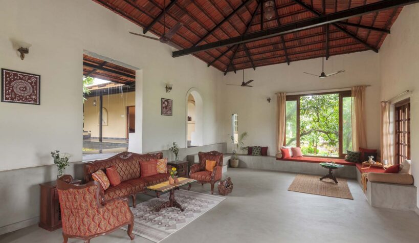 This farm stay offers delightful features that ensure a serene and enjoyable experience. Picture yourself starting your mornings with a refreshing dip in your own private infinity pool. The central courtyard serves as the heart of the property, fostering cherished memories and new friendships. With its vast lush lawn, this abode provides the perfect setting for hosting grand gatherings, whether a family reunion, a special celebration, or a group getaway. Inside, the vintage-rustic interiors have been meticulously designed to exude charm and warmth, transporting you to a bygone era while offering modern comforts.