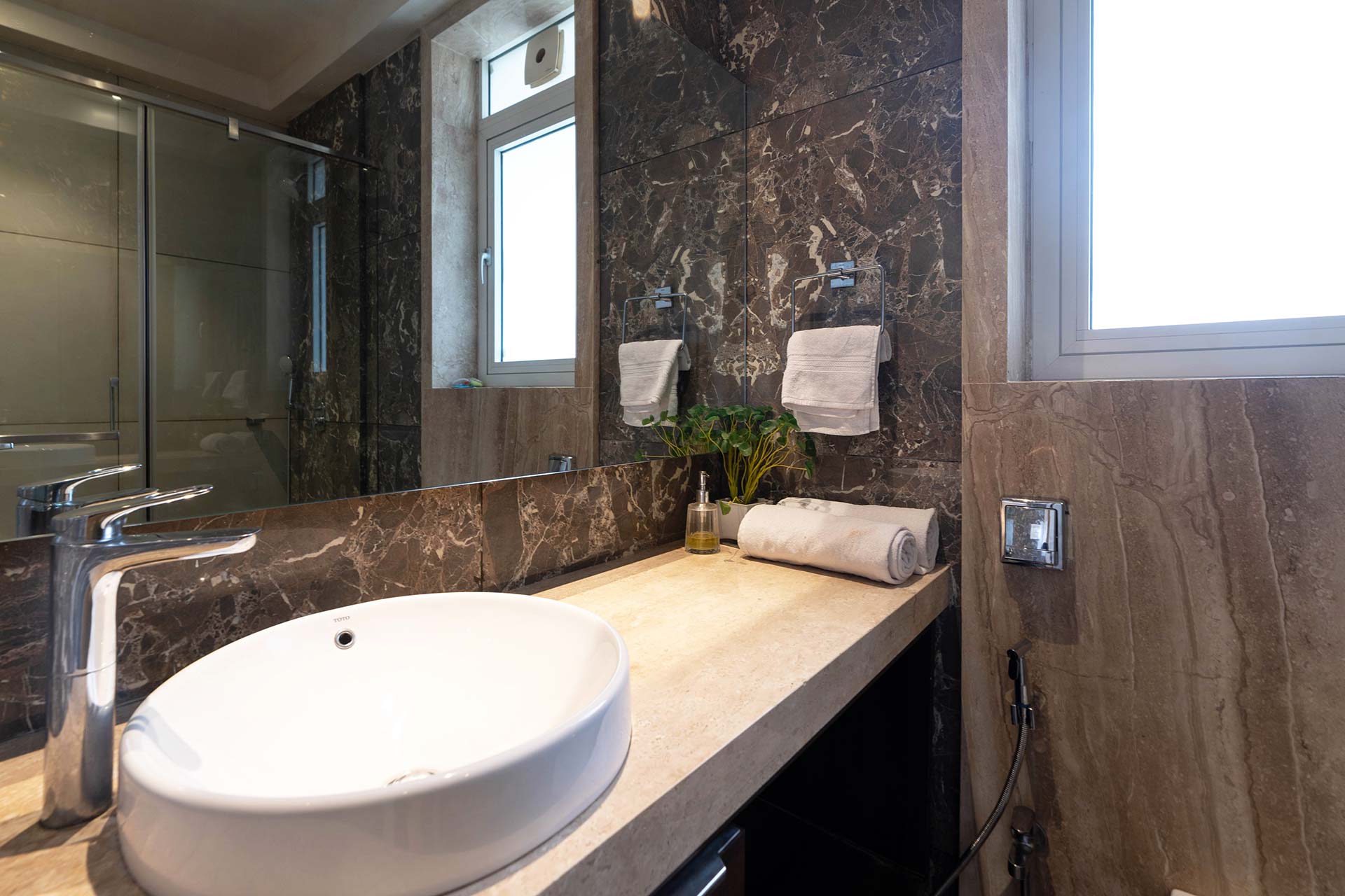 – There are 10 bathrooms – 8 attached and 2 common powder rooms for each unit.
