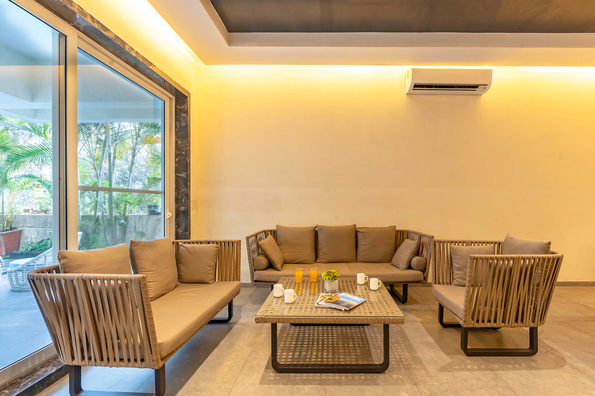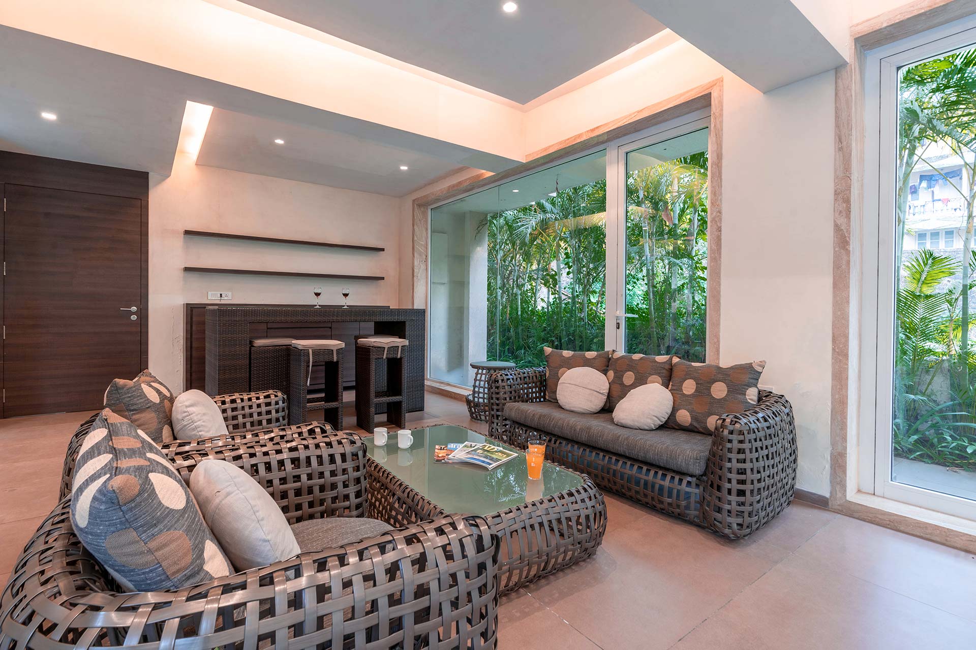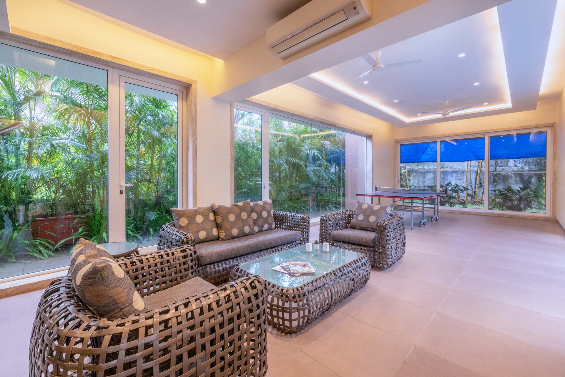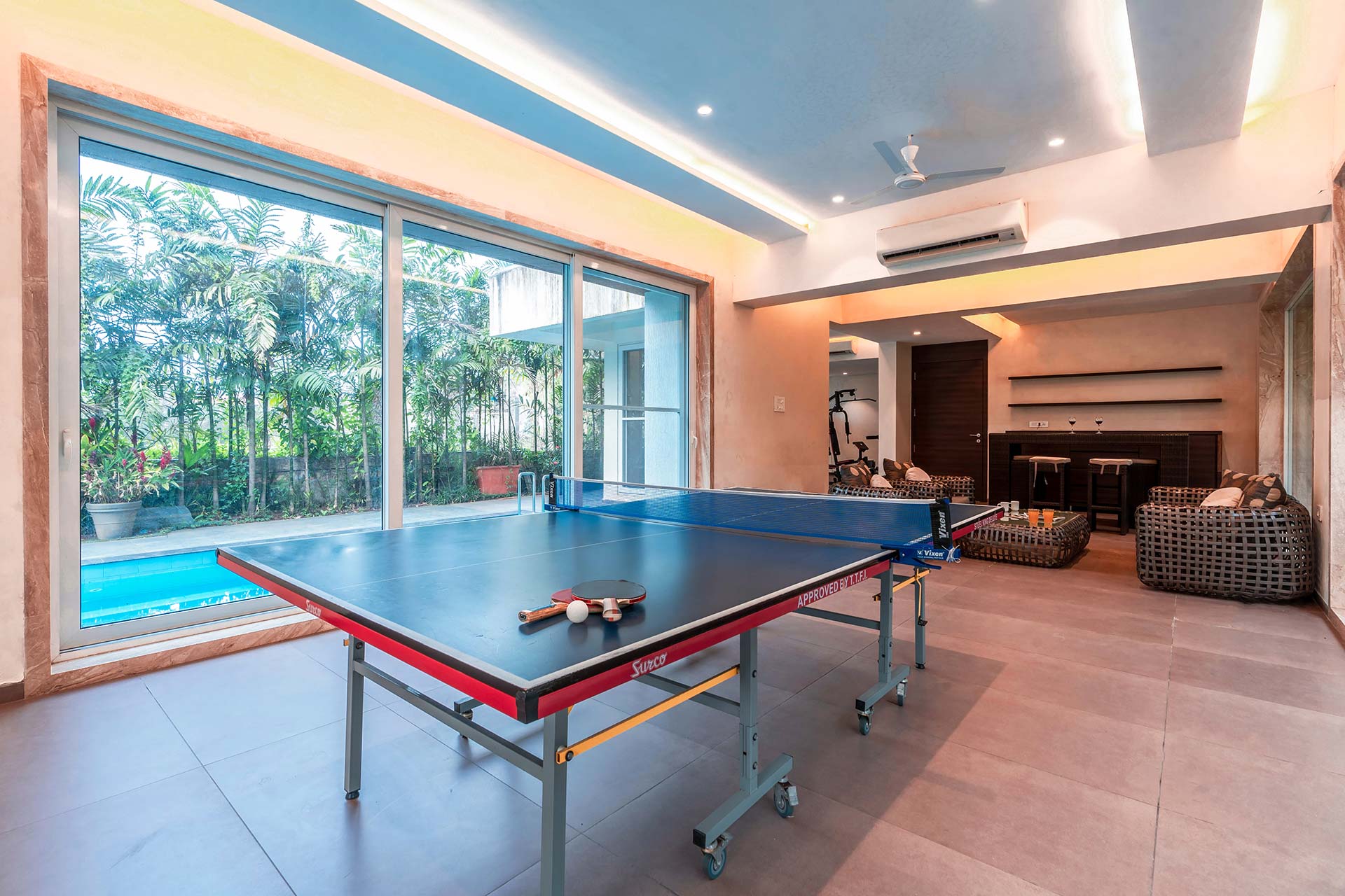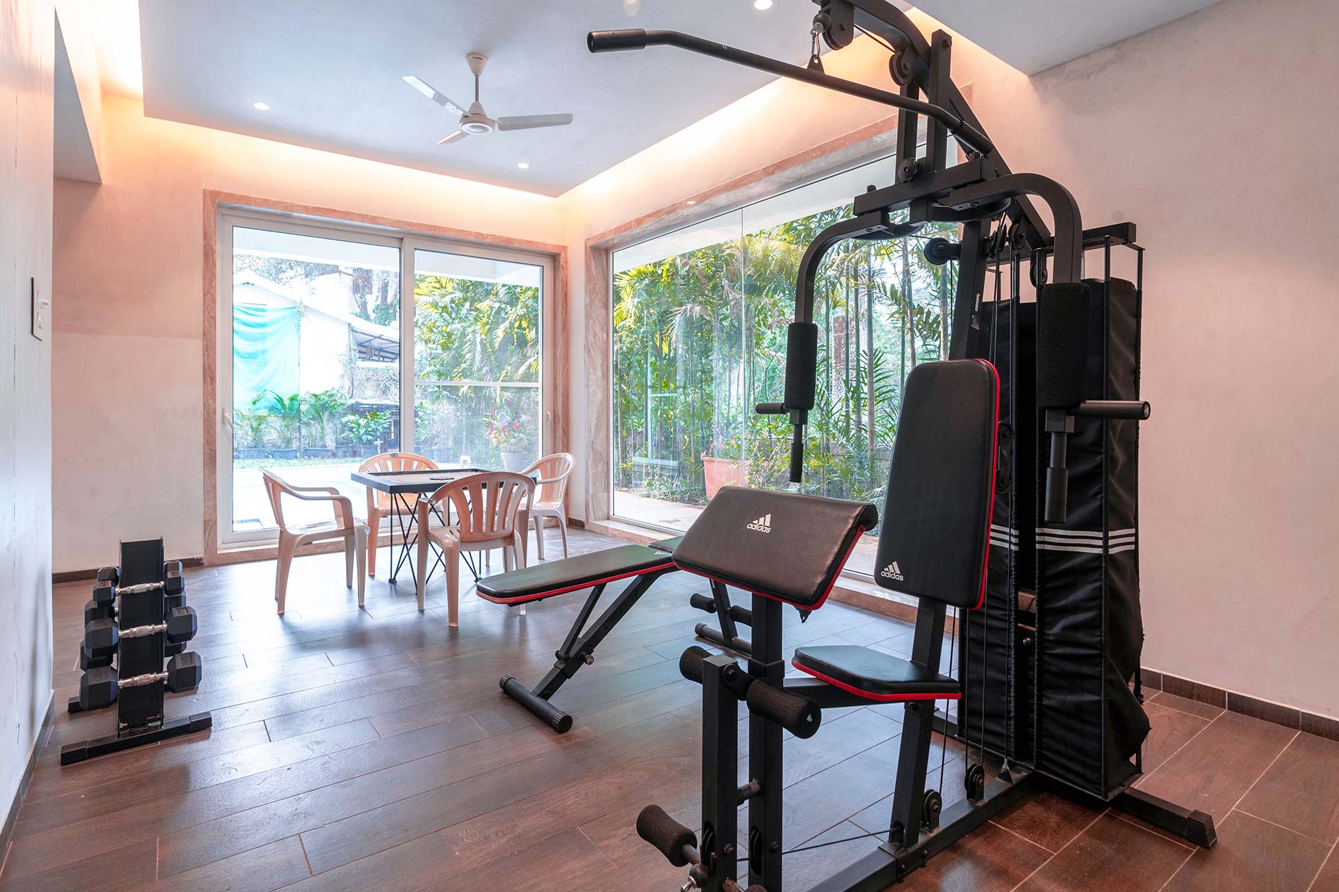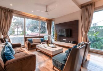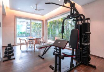One of the most elegant homes we’ve seen, This villa is the perfect place for a luxurious getaway. Its muted interior colours are vibrantly lit, and make for a great backdrop to your holiday. With a Jacuzzi in the bathroom, a swing on the balcony, cosy sofas in the living room, and a beautiful gazebo outside, you will find it hard to pick your favourite spot here. If you would like to sneak in a workout, you may use the gym. This villa is perfect for a stay for a group of around 30 people, and it also offers the opportunity to host an event for up to 100 guests at an additional cost. Well worth a visit, we say!