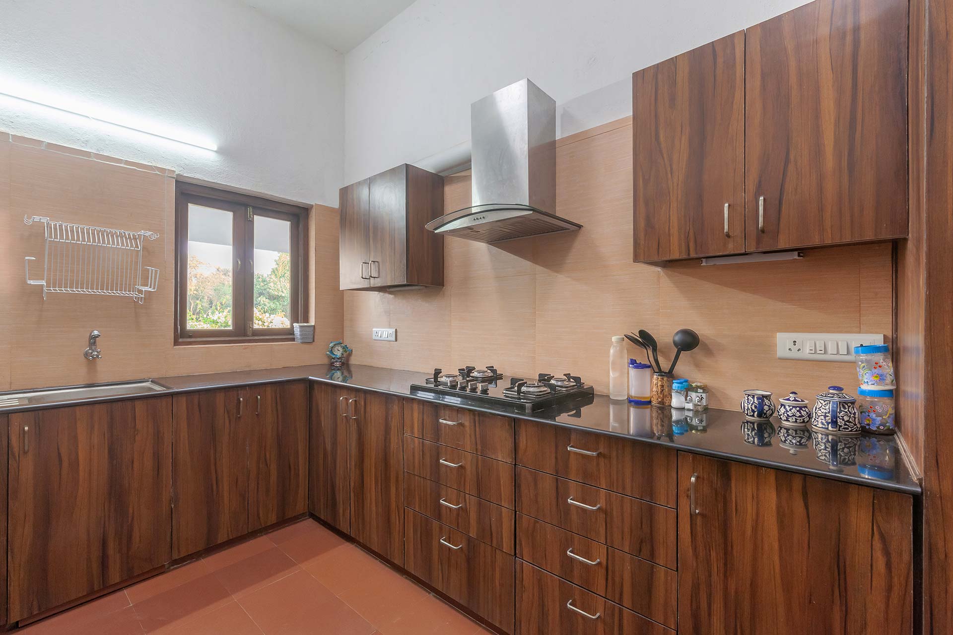 – It is equipped with a microwave, electric kettle, oven, gas stove, refrigerator, water purifier, crockery and cutlery.