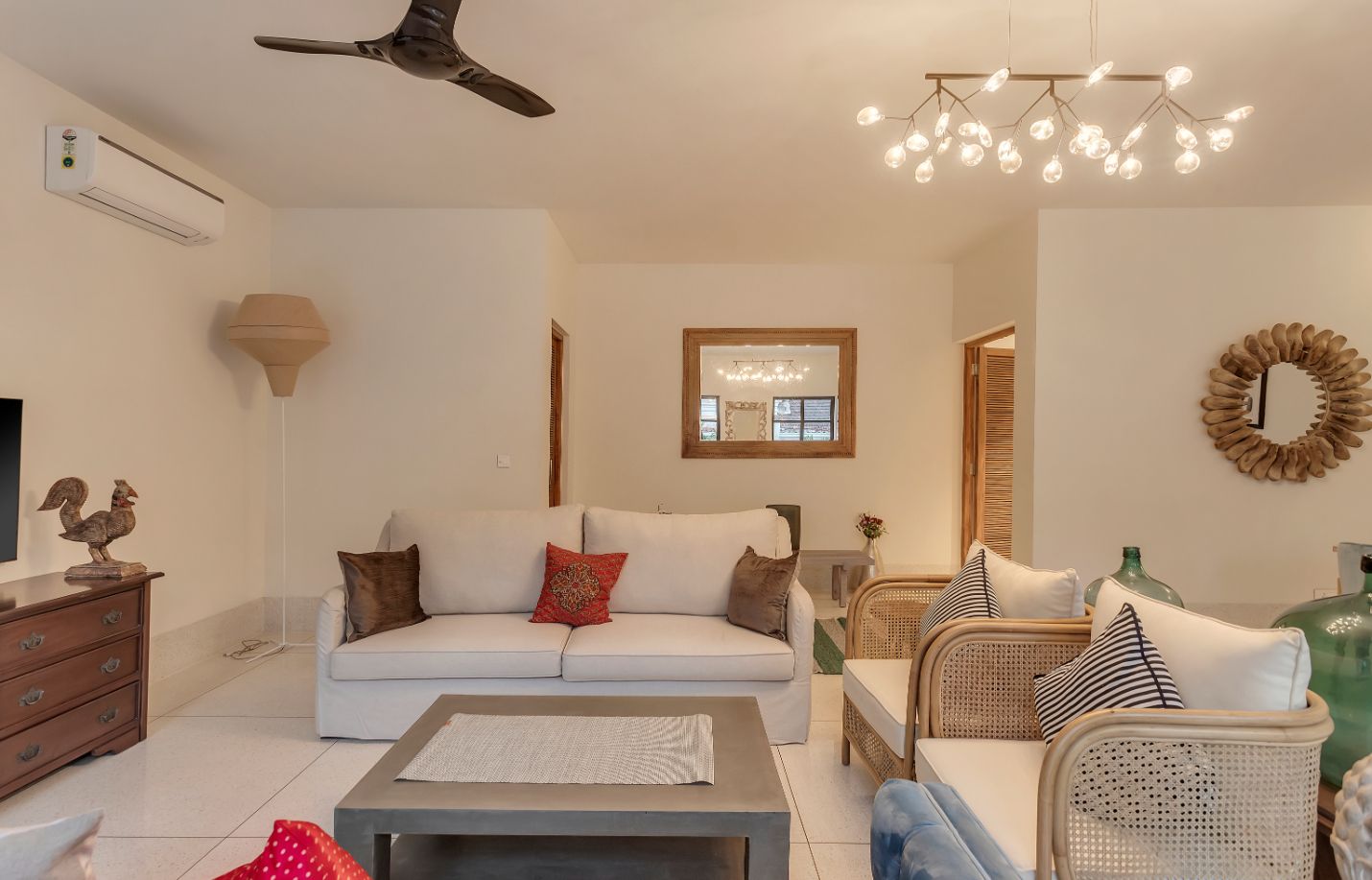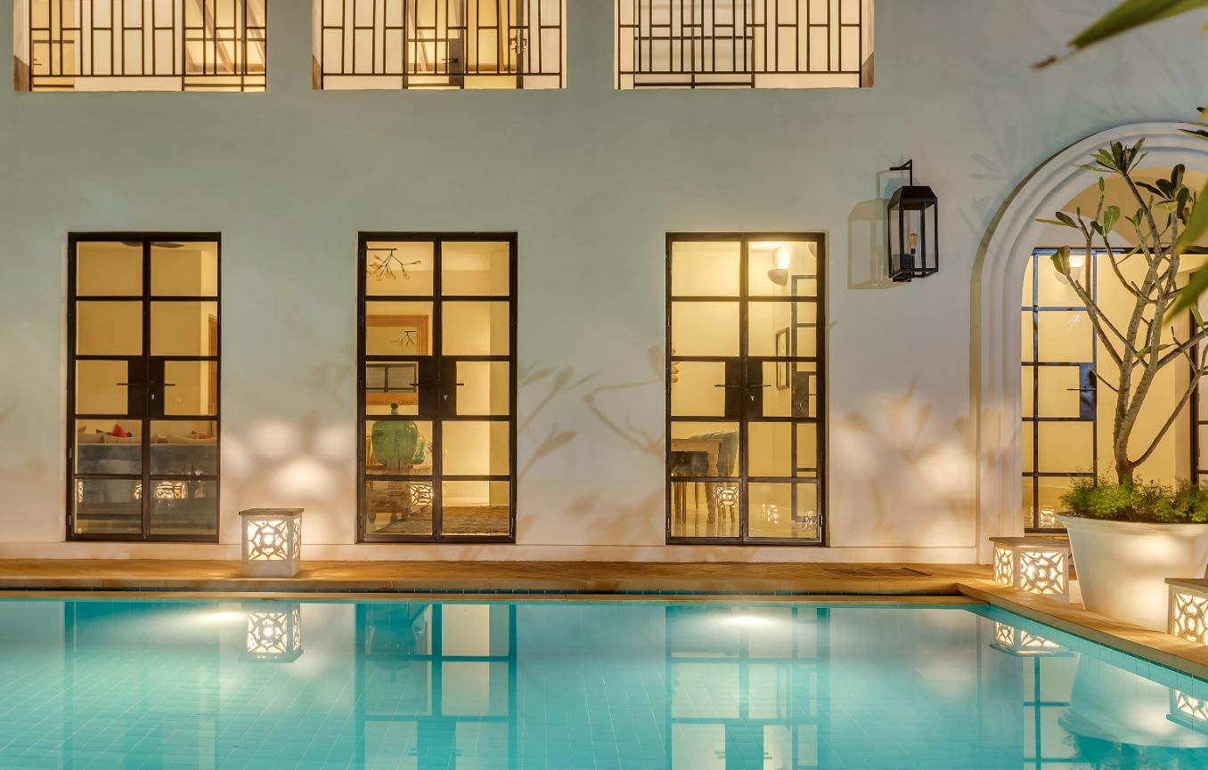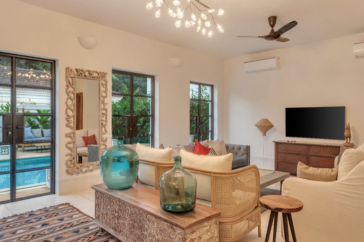 A bright, airy, and tastefully furnished living area offering direct access to the private pool—perfect for unwinding or spending quality time with loved ones.