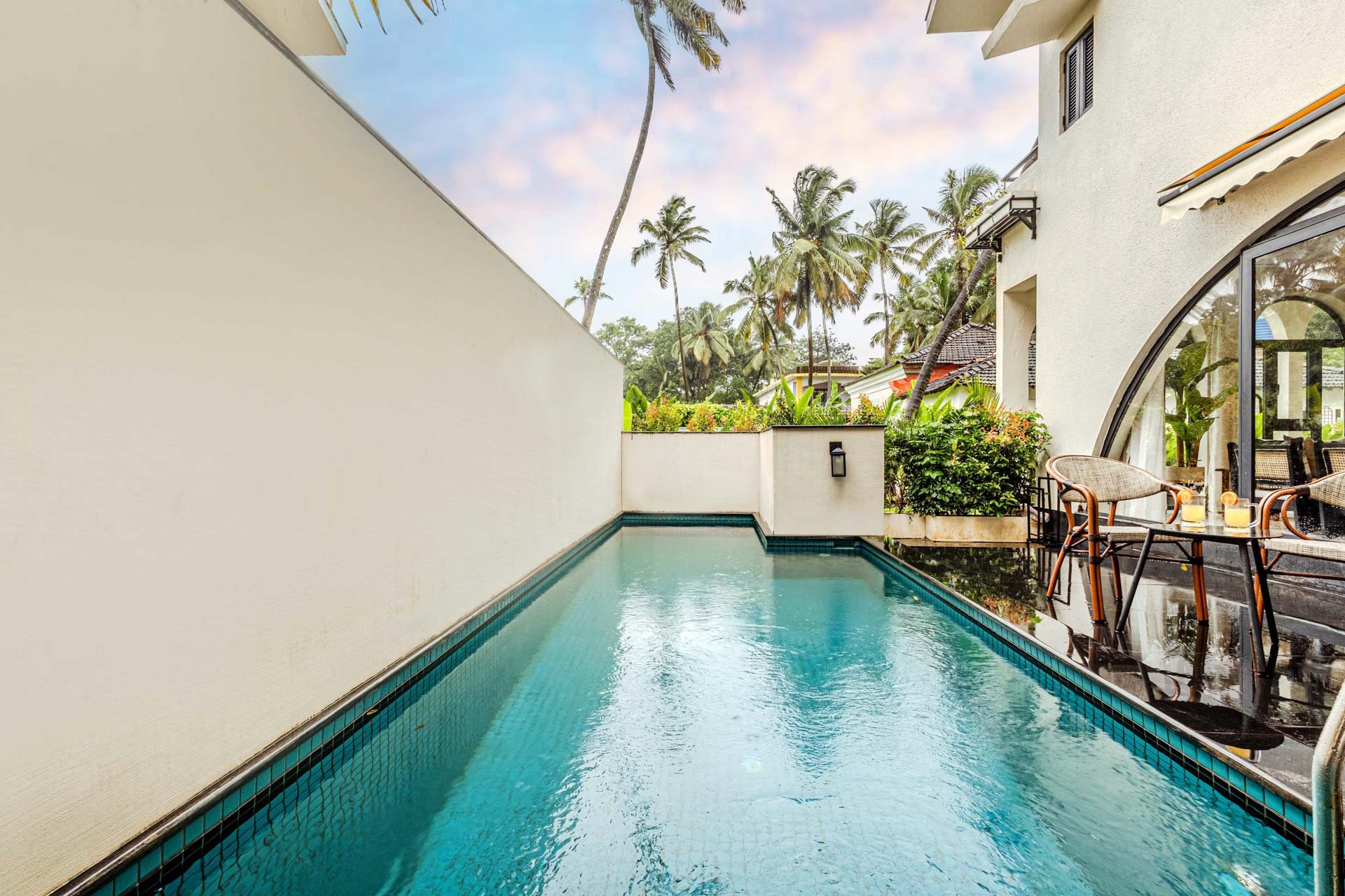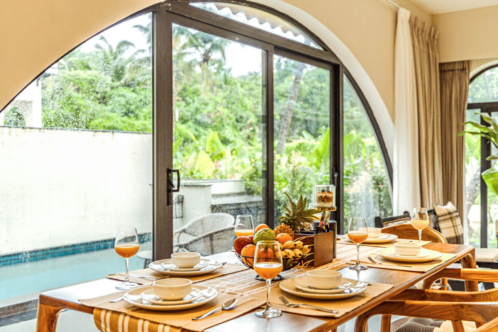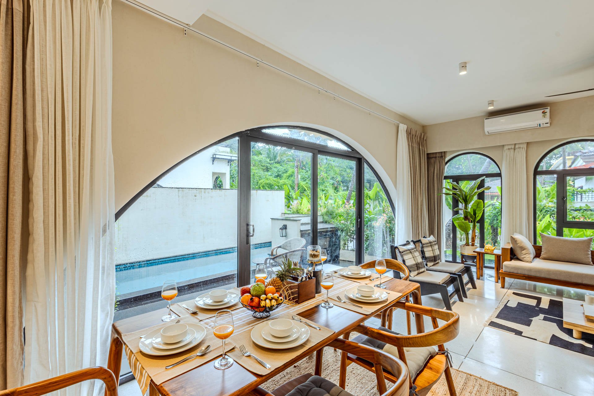 Begin your day with a steaming cup of coffee on the sunlit verandah of Casa Lumina, watching the morning light dance across Siolim’s serene landscapes. After breakfast in the earthy, elegant dining space, take a leisurely swim in the private pool or lounge by the manicured lawn, surrounded by the villa’s lush, picturesque garden. Midday calls for a quiet siesta indoors, where the earthy interiors and elemental grandeur create a naturally calming ambience. Later, venture out to explore Siolim’s charming lanes, vibrant markets, and nearby beaches, returning just in time to catch the golden sunset from your garden seat. Evenings at Casa Lumina are best spent with a home-cooked meal in the villa kitchen, followed by starlit conversations by the pool. Whether you choose to unwind indoors or immerse yourself in the beauty of North Goa, each moment at Casa Lumina flows effortlessly between relaxation and exploration.
