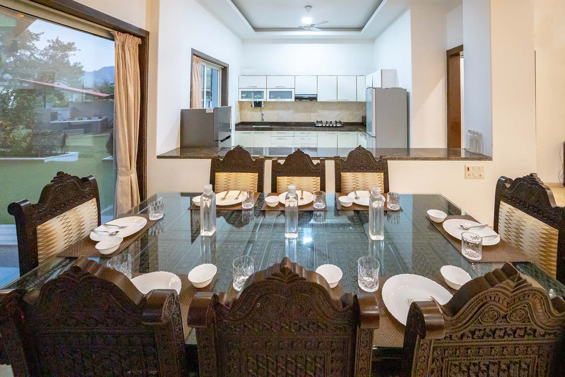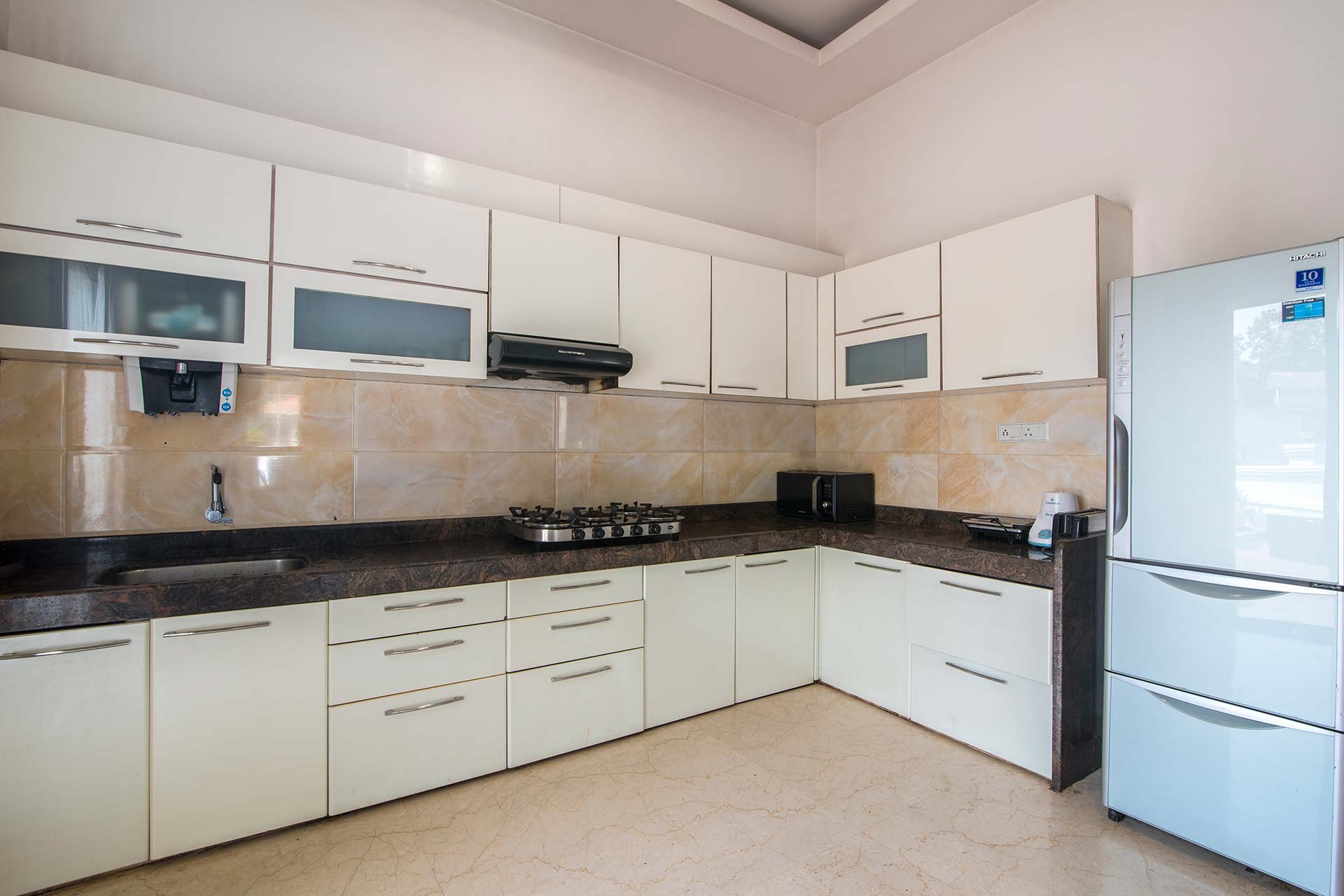 – The kitchen is equipped with a water purifier, crockery, and cutlery.