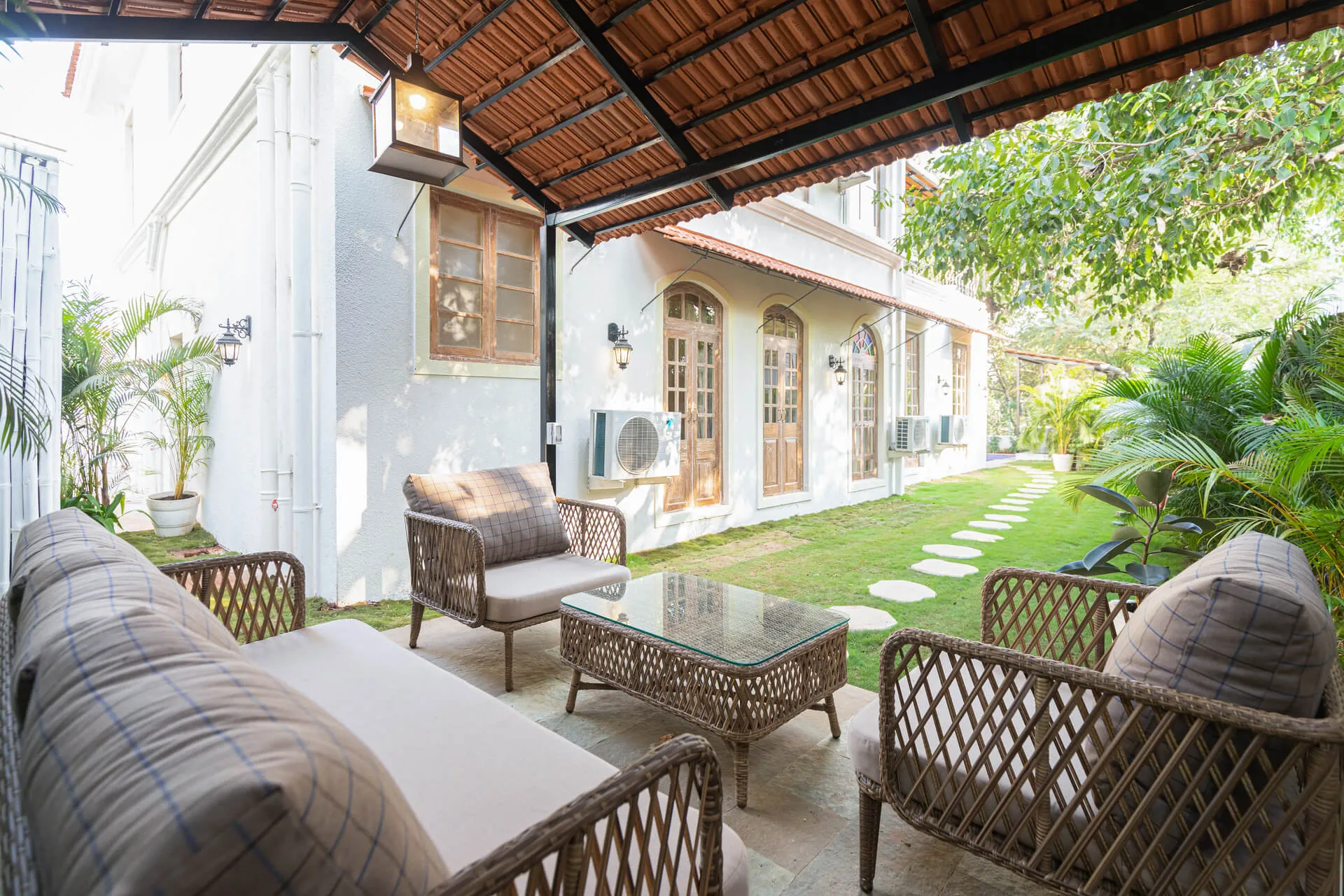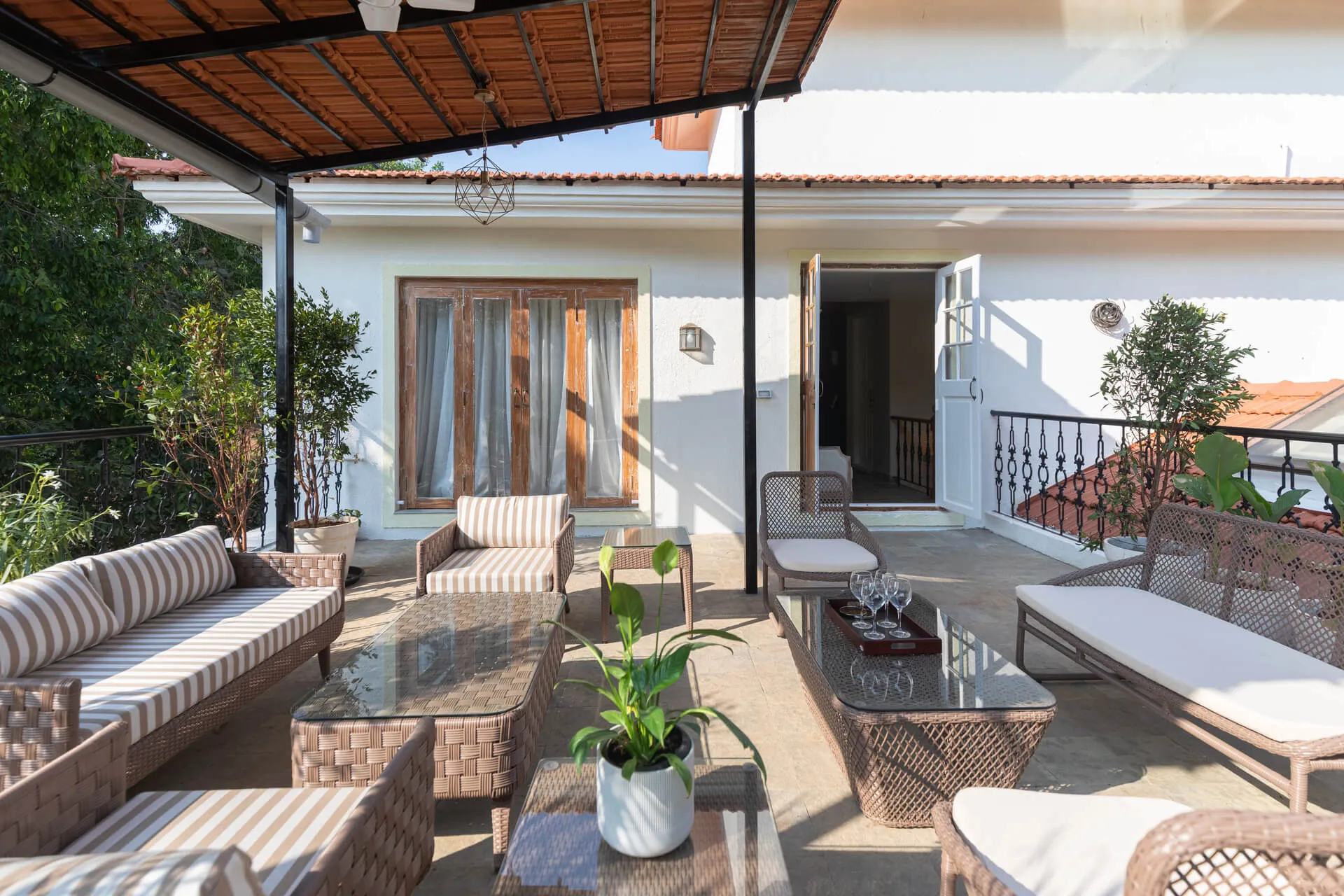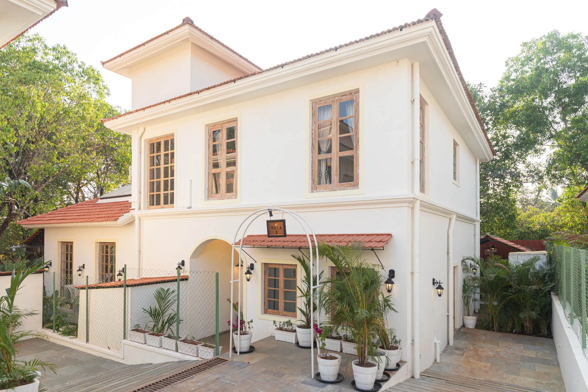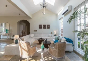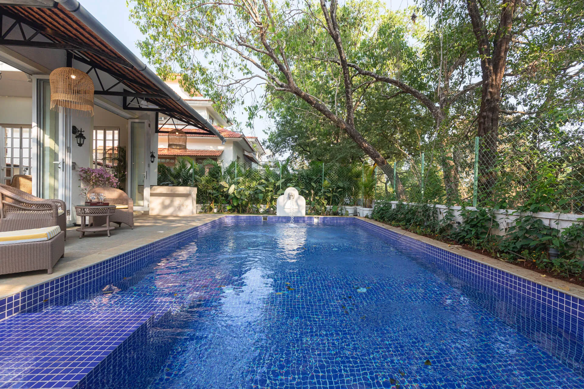 A sanctuary that offers you respite from the hustle and bustle of city life, Colina Villa E boasts a lush environment that is complemented by the Goan-Portuguese architecture. Indoors, earthy tones, rich wooden finishes and warm cane accents give the 3 ensuite bedrooms, the den and the living area a tranquil and calming vibe. Outdoors, the gorgeous cobalt blue pool, flanked by a jacuzzi, sets the stage for a relaxing day as you relish a steady stream of chilled beverages and your favourite nibbles, served by  staff. The gazebo in the garden and the first floor terrace are great spaces for you and your loved ones to sit back and enjoy endless conversations.