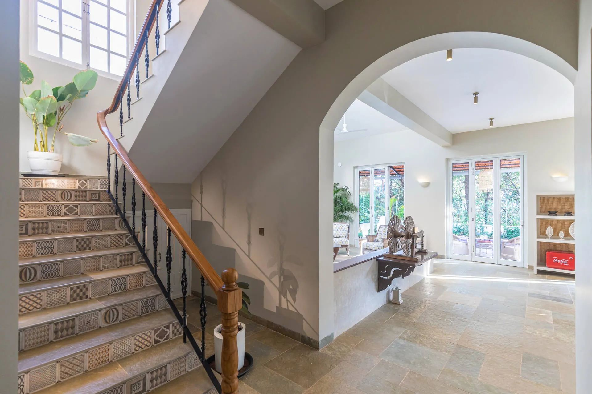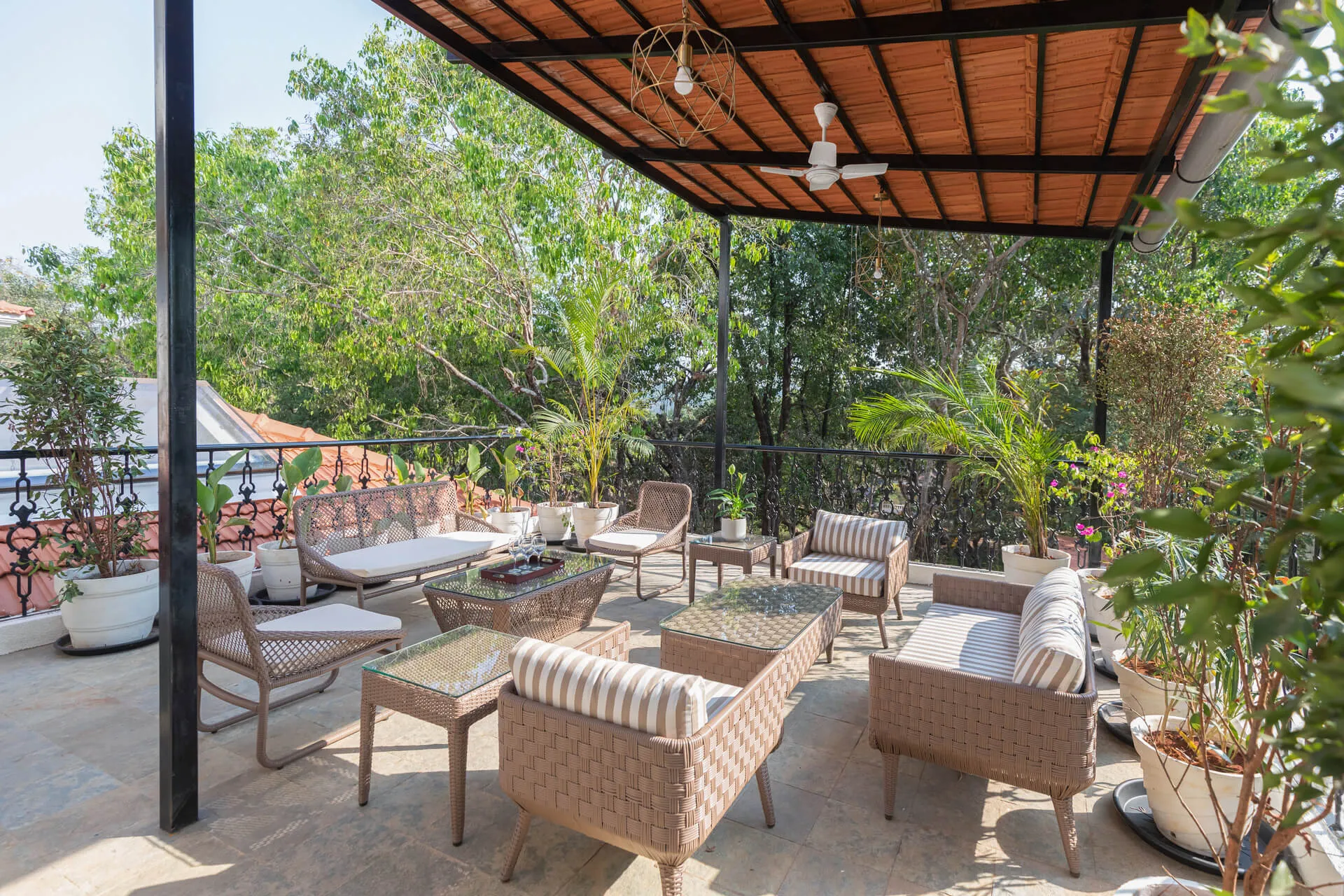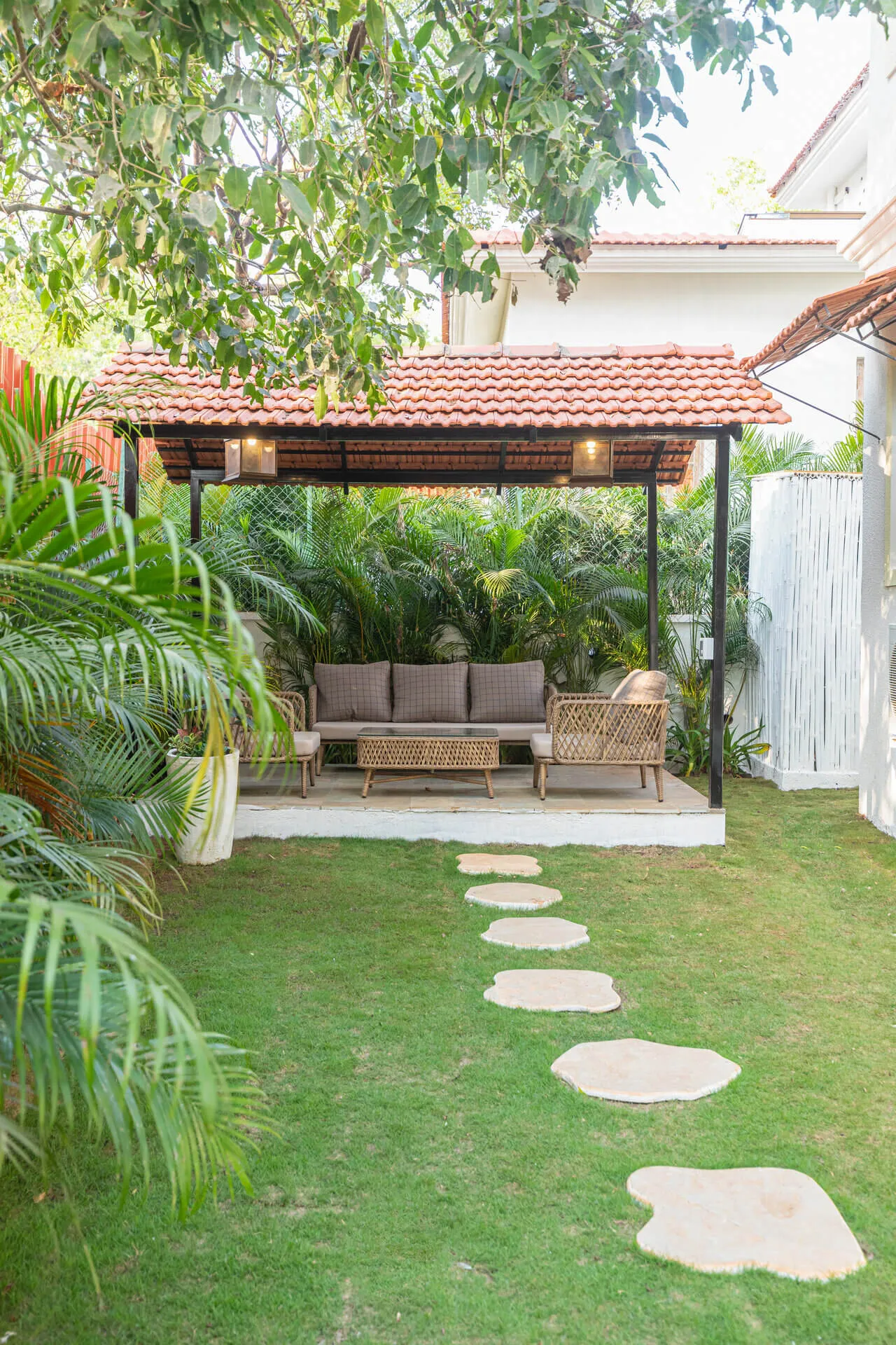 A sanctuary that offers you respite from the hustle and bustle of city life, Colina Villa E boasts a lush environment that is complemented by the Goan-Portuguese architecture. Indoors, earthy tones, rich wooden finishes and warm cane accents give the 3 ensuite bedrooms, the den and the living area a tranquil and calming vibe. Outdoors, the gorgeous cobalt blue pool, flanked by a jacuzzi, sets the stage for a relaxing day as you relish a steady stream of chilled beverages and your favourite nibbles, served by  staff. The gazebo in the garden and the first floor terrace are great spaces for you and your loved ones to sit back and enjoy endless conversations.