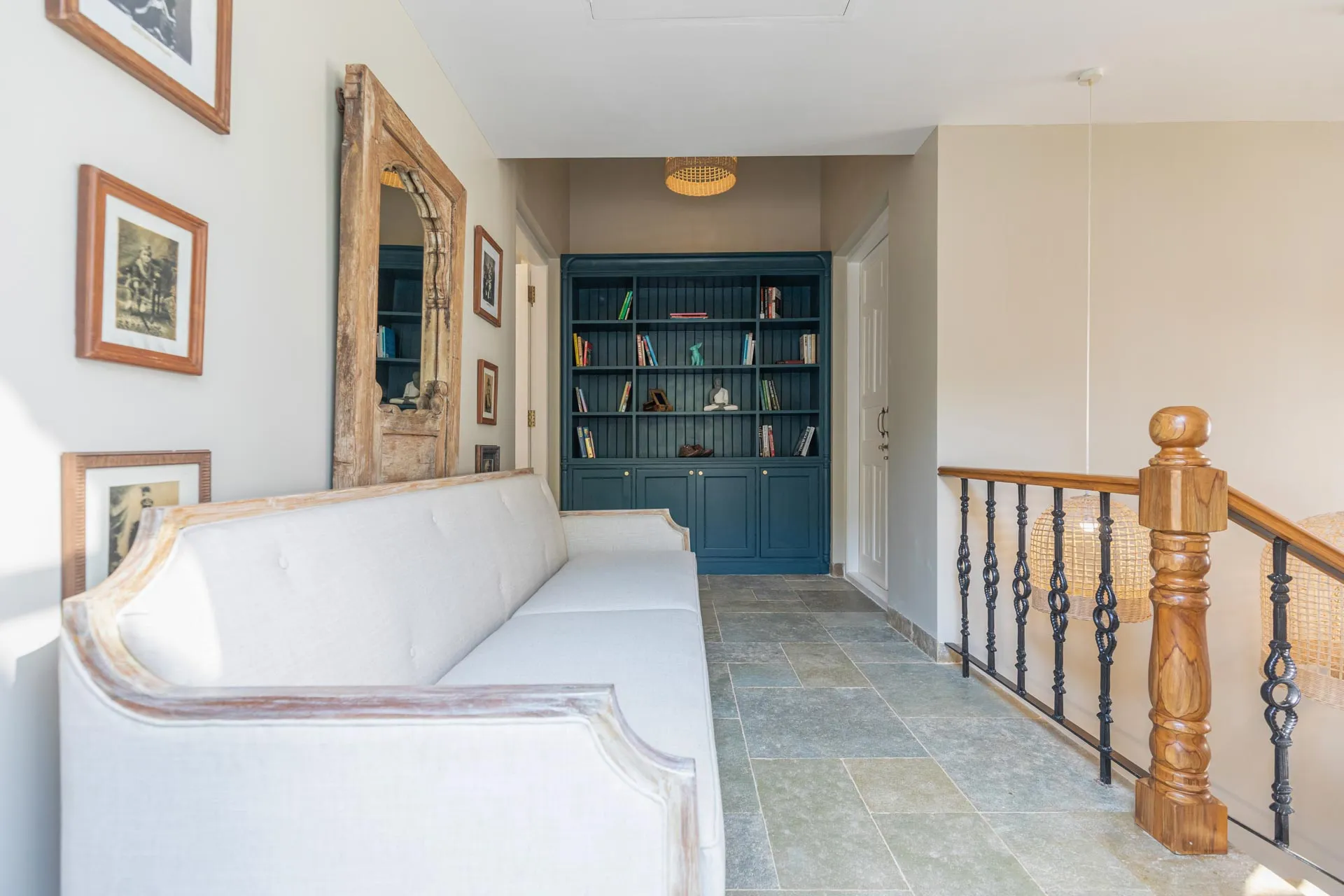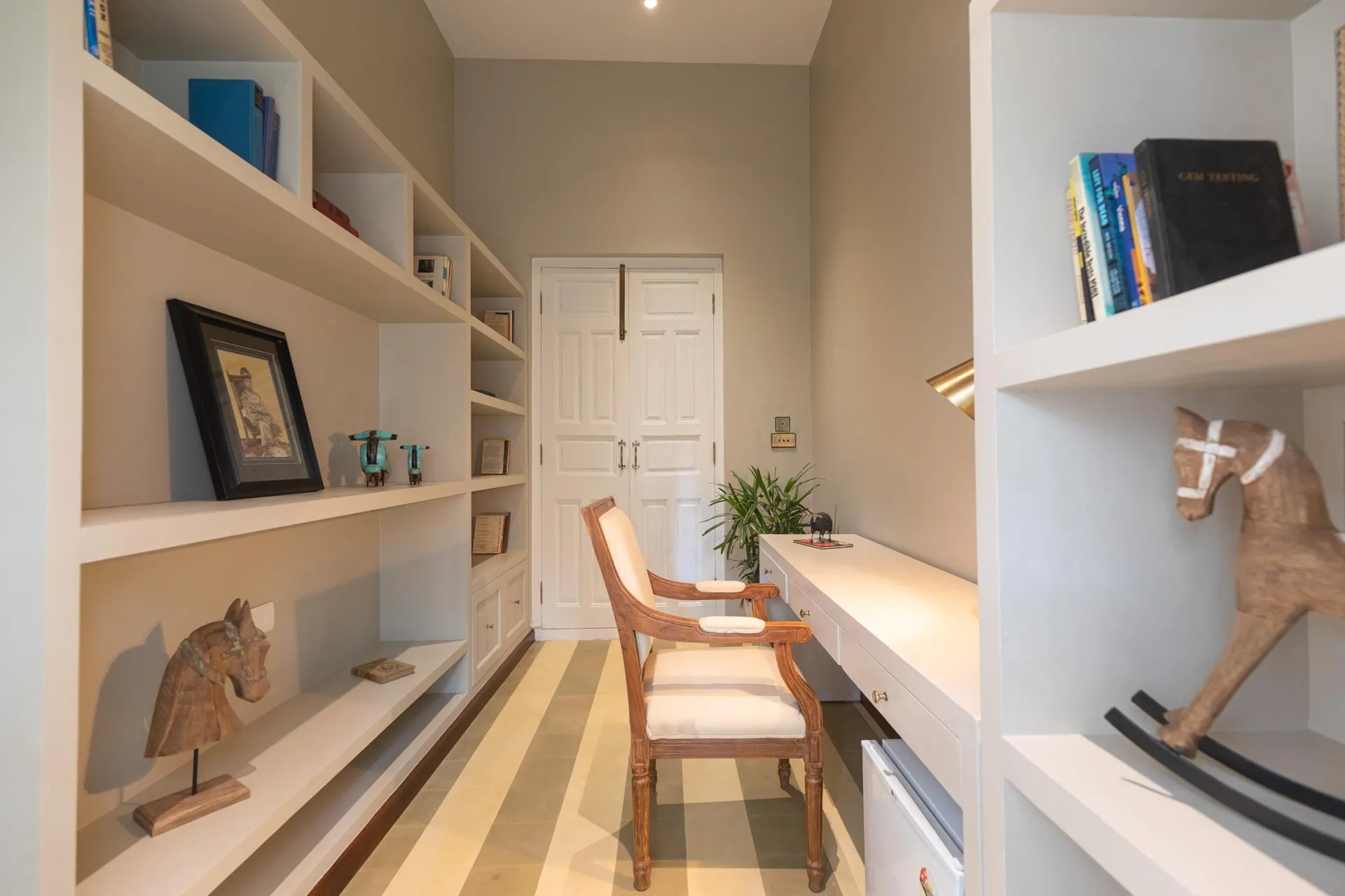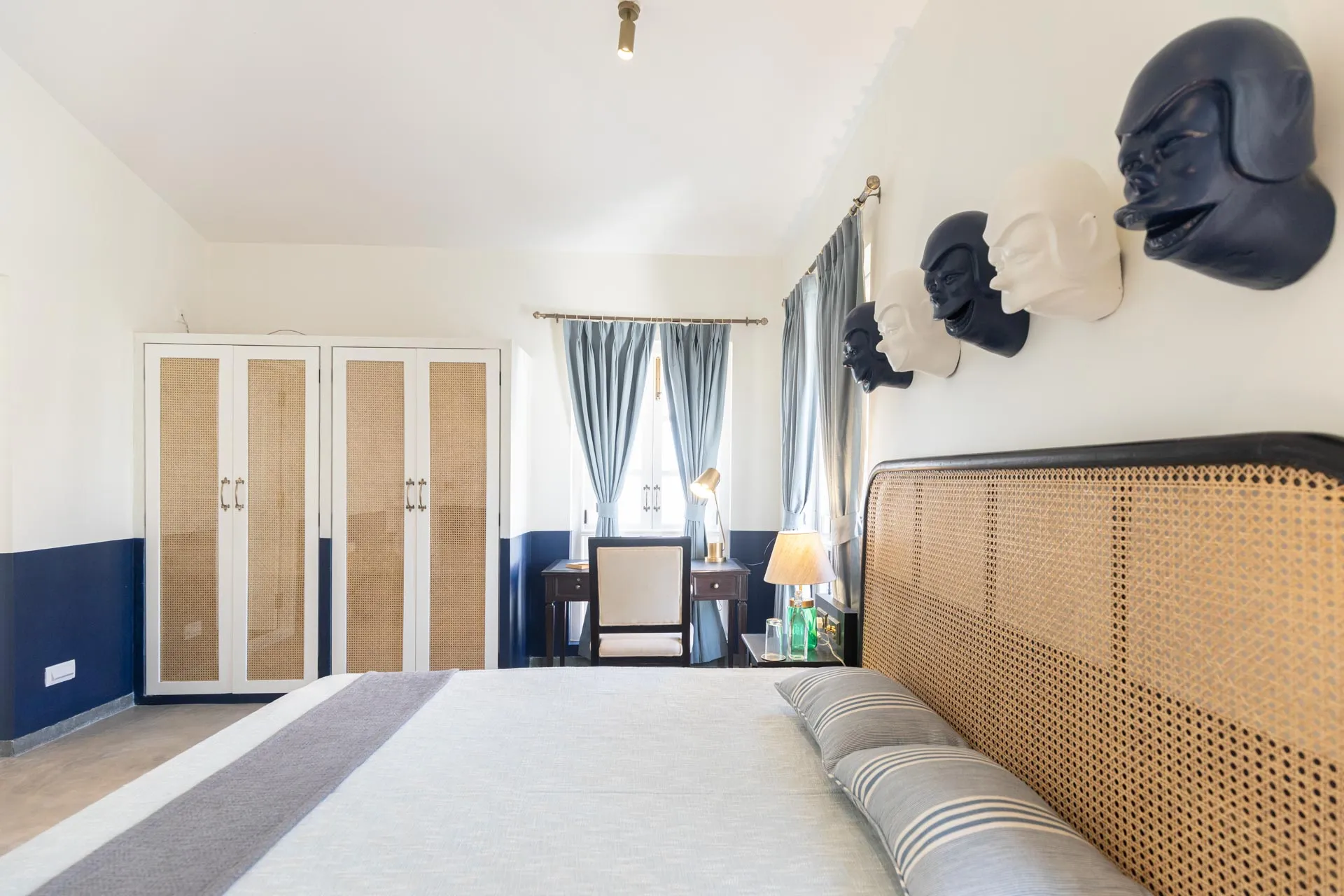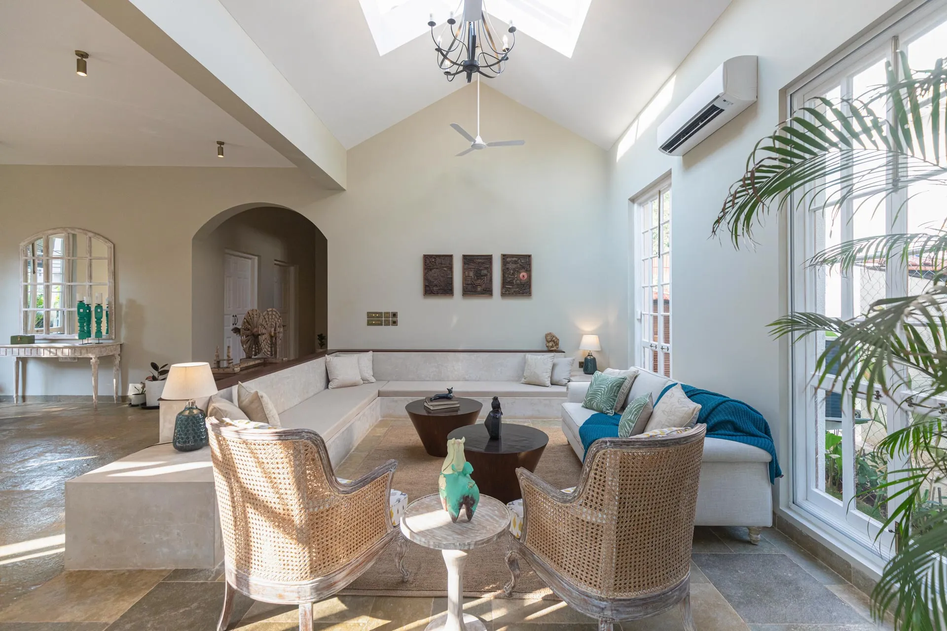 A sanctuary that offers you respite from the hustle and bustle of city life, Colina Villa E boasts a lush environment that is complemented by the Goan-Portuguese architecture. Indoors, earthy tones, rich wooden finishes and warm cane accents give the 3 ensuite bedrooms, the den and the living area a tranquil and calming vibe. Outdoors, the gorgeous cobalt blue pool, flanked by a jacuzzi, sets the stage for a relaxing day as you relish a steady stream of chilled beverages and your favourite nibbles, served by  staff. The gazebo in the garden and the first floor terrace are great spaces for you and your loved ones to sit back and enjoy endless conversations.