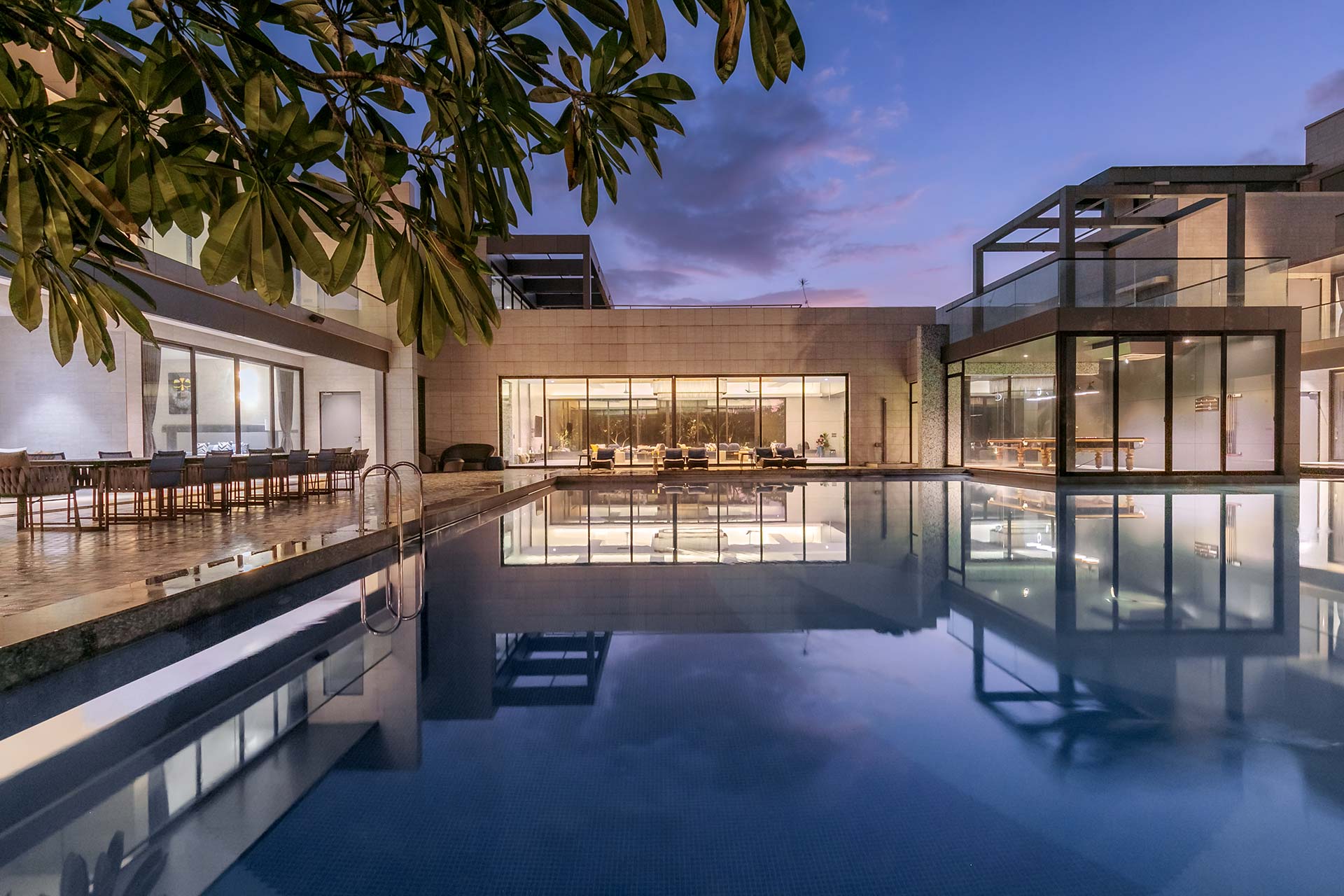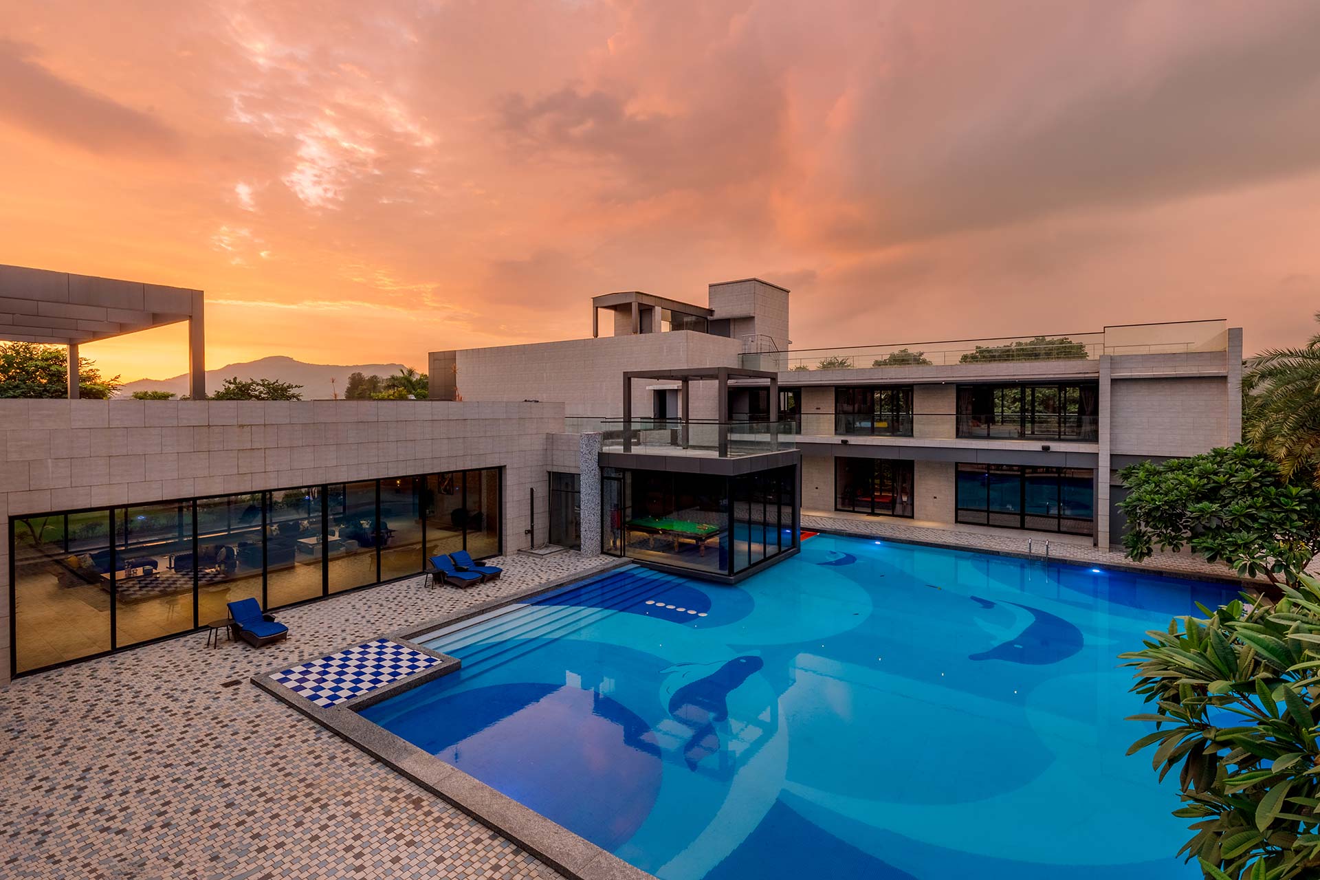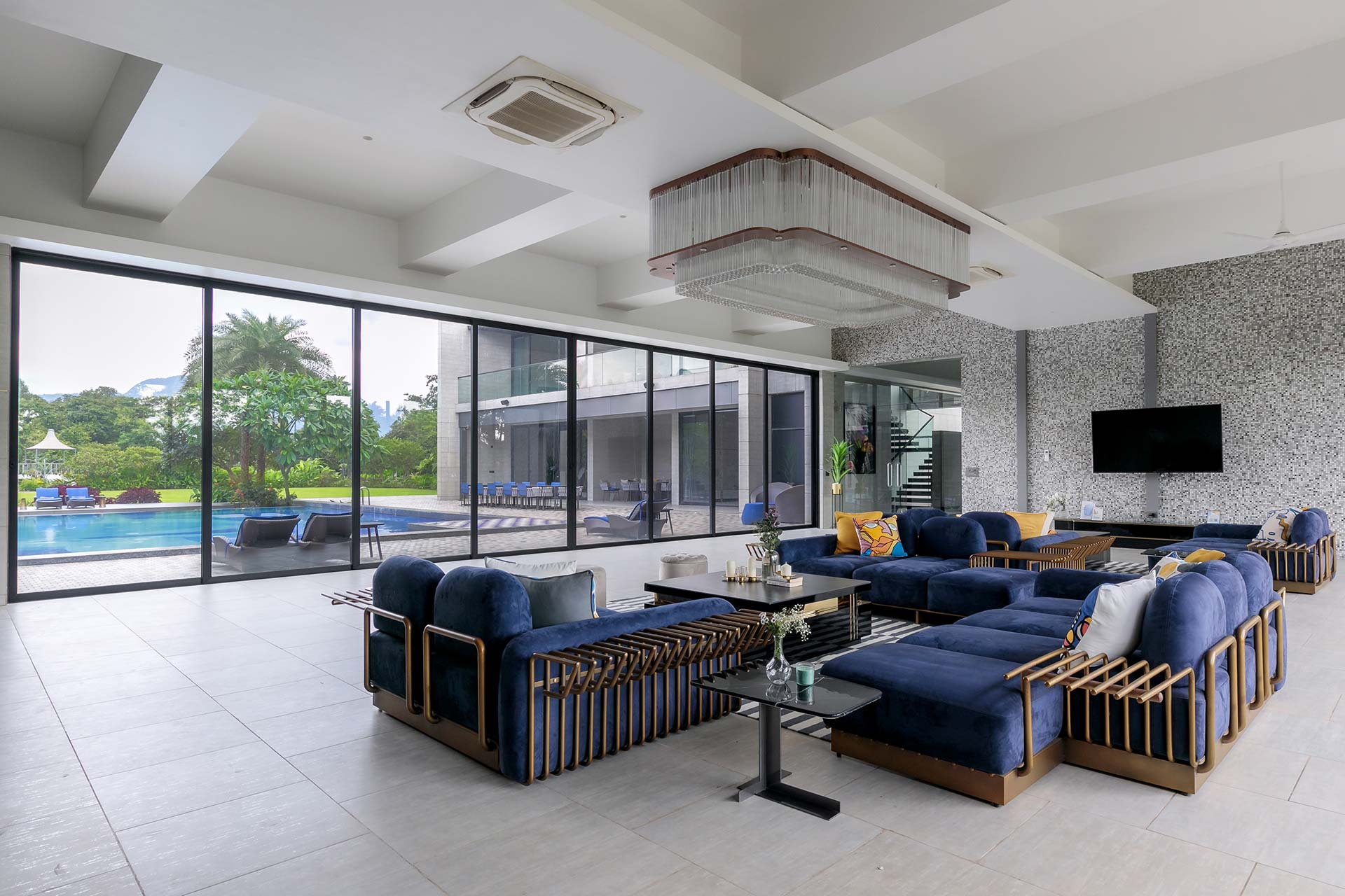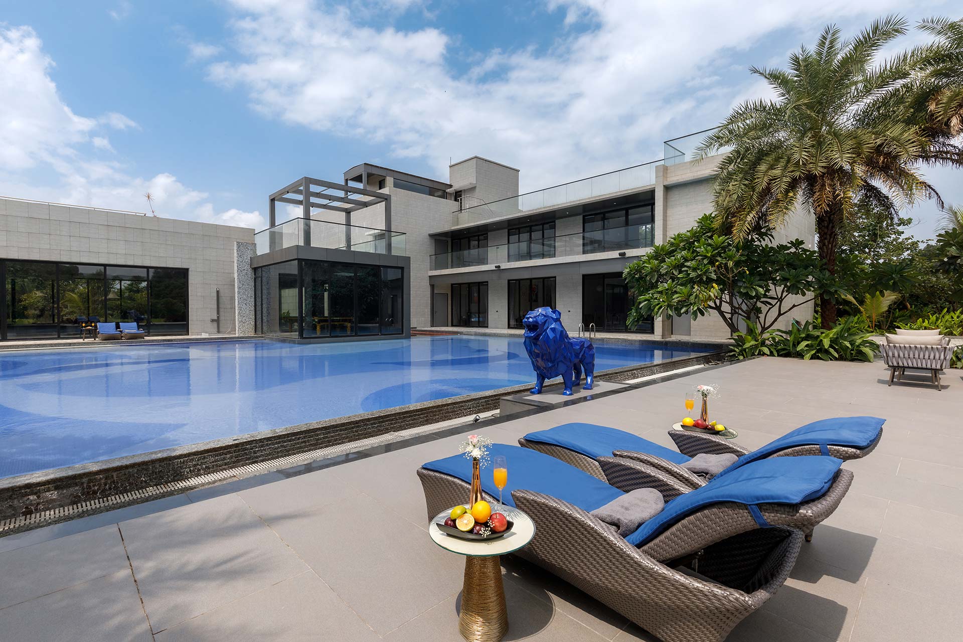 Redefining the epitome of luxury living, this massive opulent abode set amidst a picturesque lush backdrop is sure to guarantee you a memorable trip; whether it be with your large family or group of friends. It’s the kind of space that offers a wonderful glimpse into the luxe life – inviting you to savour the joy of being together in a beautiful setting. This home makes the most of its stunning environs with an enormous glass façade and bright, airy interiors that reflect the soothing sunlight, the endless cool blues of the pool, and much more! As you gather together to reconnect with loved ones, soak in the scenic beauty of the evergreen vistas, swim under the open sky, kick back in the jacuzzi, and raise a glass to good times. The exteriors are just as extravagant as the interiors and offer an assortment of amenities to suit every taste. It doesn’t matter if it’s the magnificent promenade, a cosy machan with a view of the cascading rivulet, or a huge garden for your kids, there’s something for everyone here.