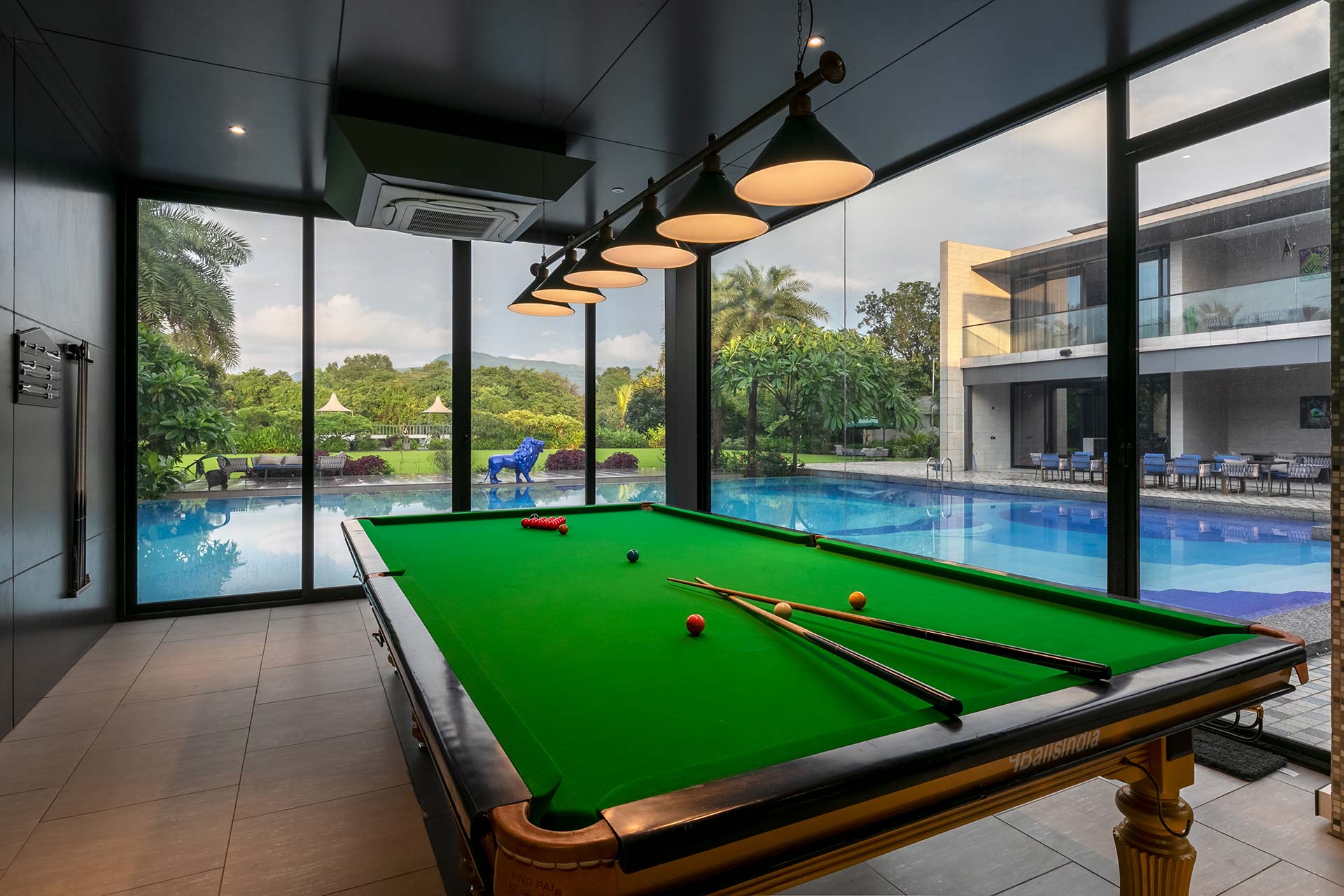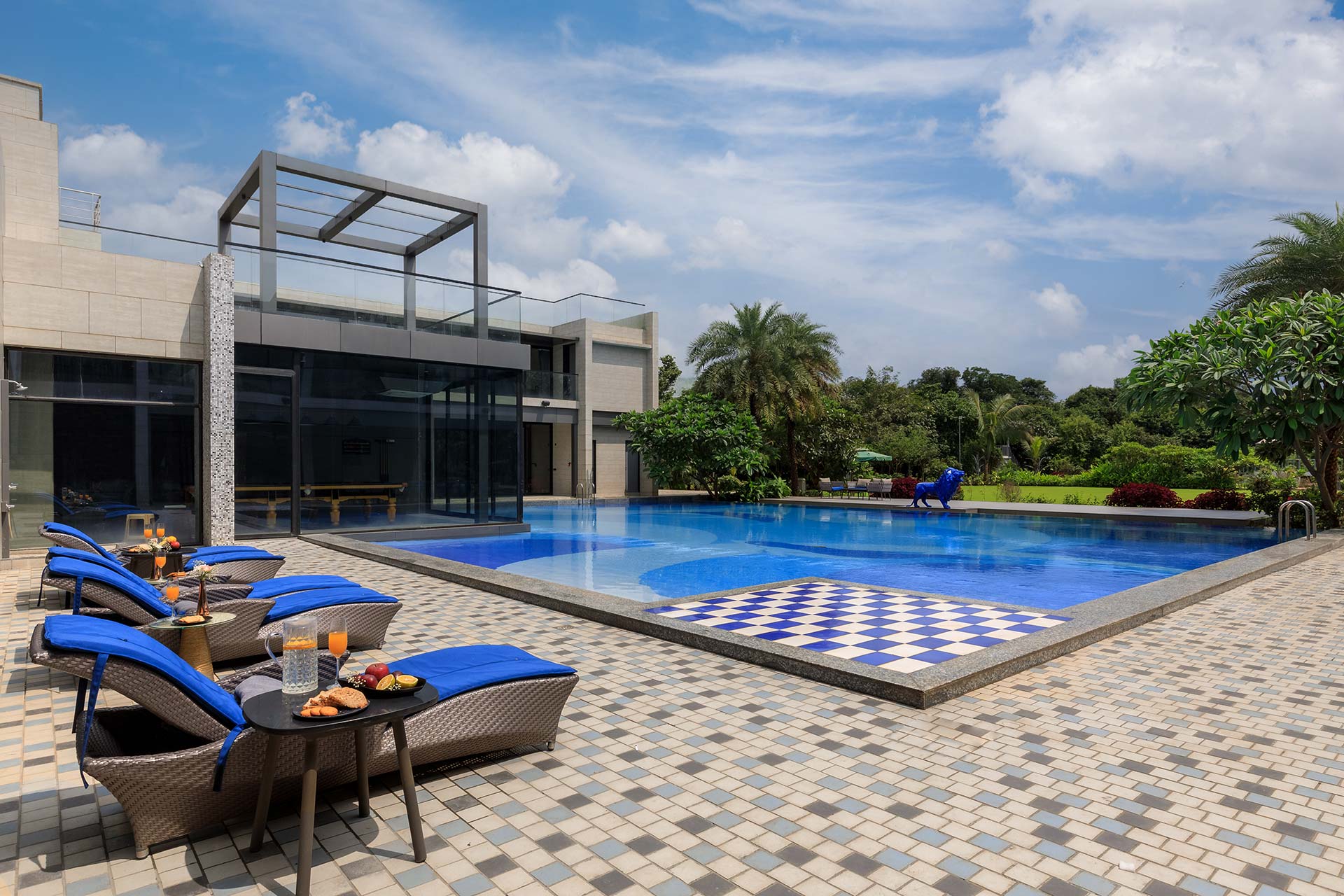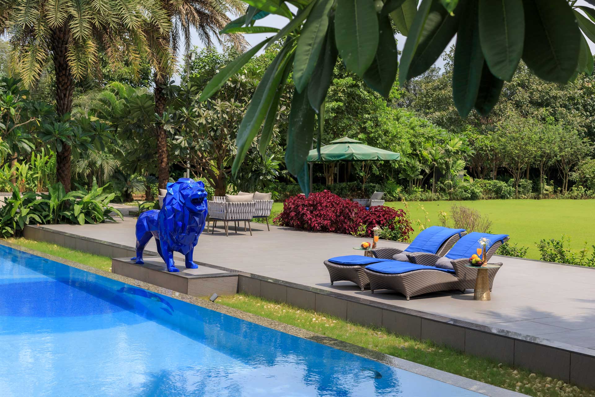 Redefining the epitome of luxury living, this massive opulent abode set amidst a picturesque lush backdrop is sure to guarantee you a memorable trip; whether it be with your large family or group of friends. It’s the kind of space that offers a wonderful glimpse into the luxe life – inviting you to savour the joy of being together in a beautiful setting. This home makes the most of its stunning environs with an enormous glass façade and bright, airy interiors that reflect the soothing sunlight, the endless cool blues of the pool, and much more! As you gather together to reconnect with loved ones, soak in the scenic beauty of the evergreen vistas, swim under the open sky, kick back in the jacuzzi, and raise a glass to good times. The exteriors are just as extravagant as the interiors and offer an assortment of amenities to suit every taste. It doesn’t matter if it’s the magnificent promenade, a cosy machan with a view of the cascading rivulet, or a huge garden for your kids, there’s something for everyone here.