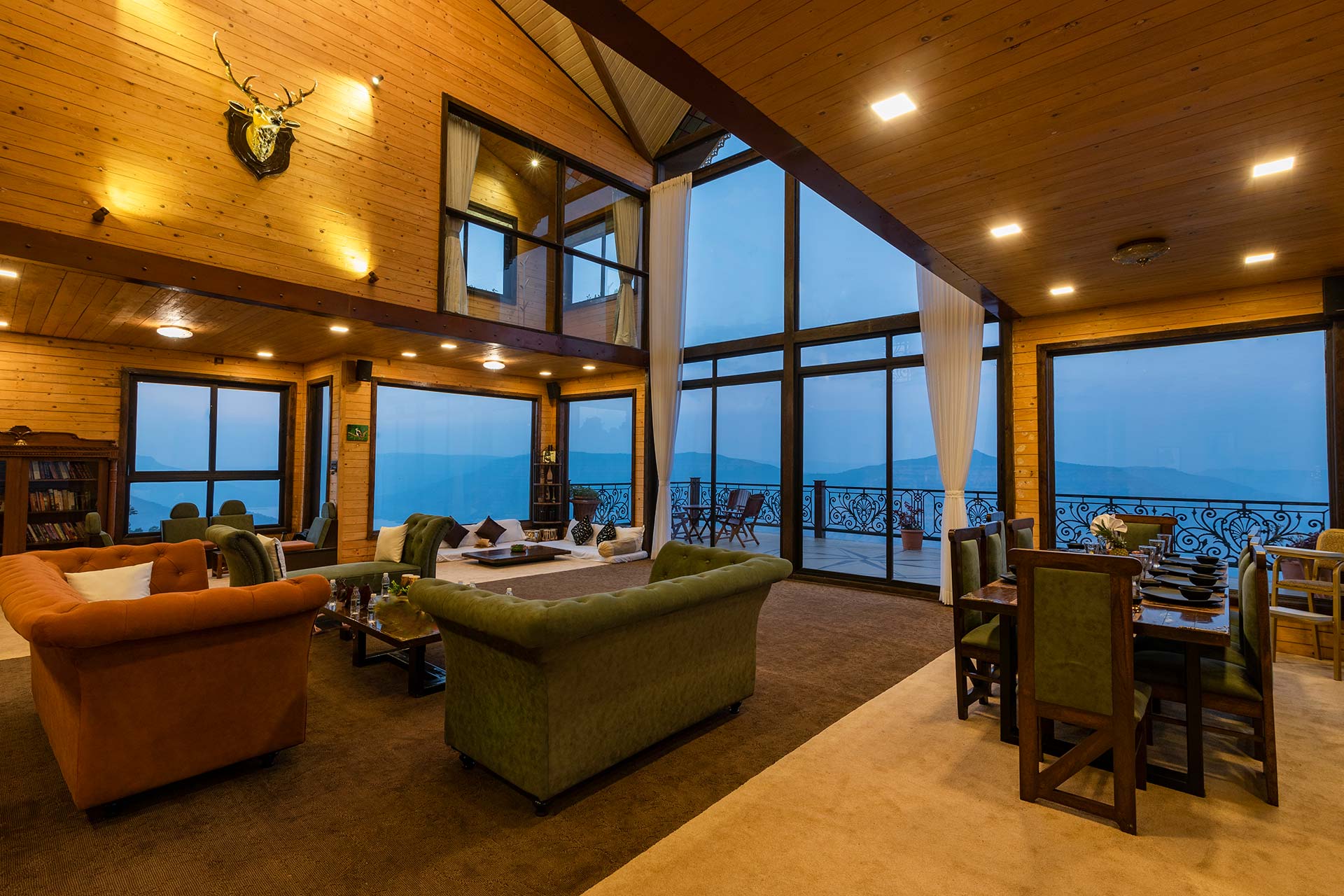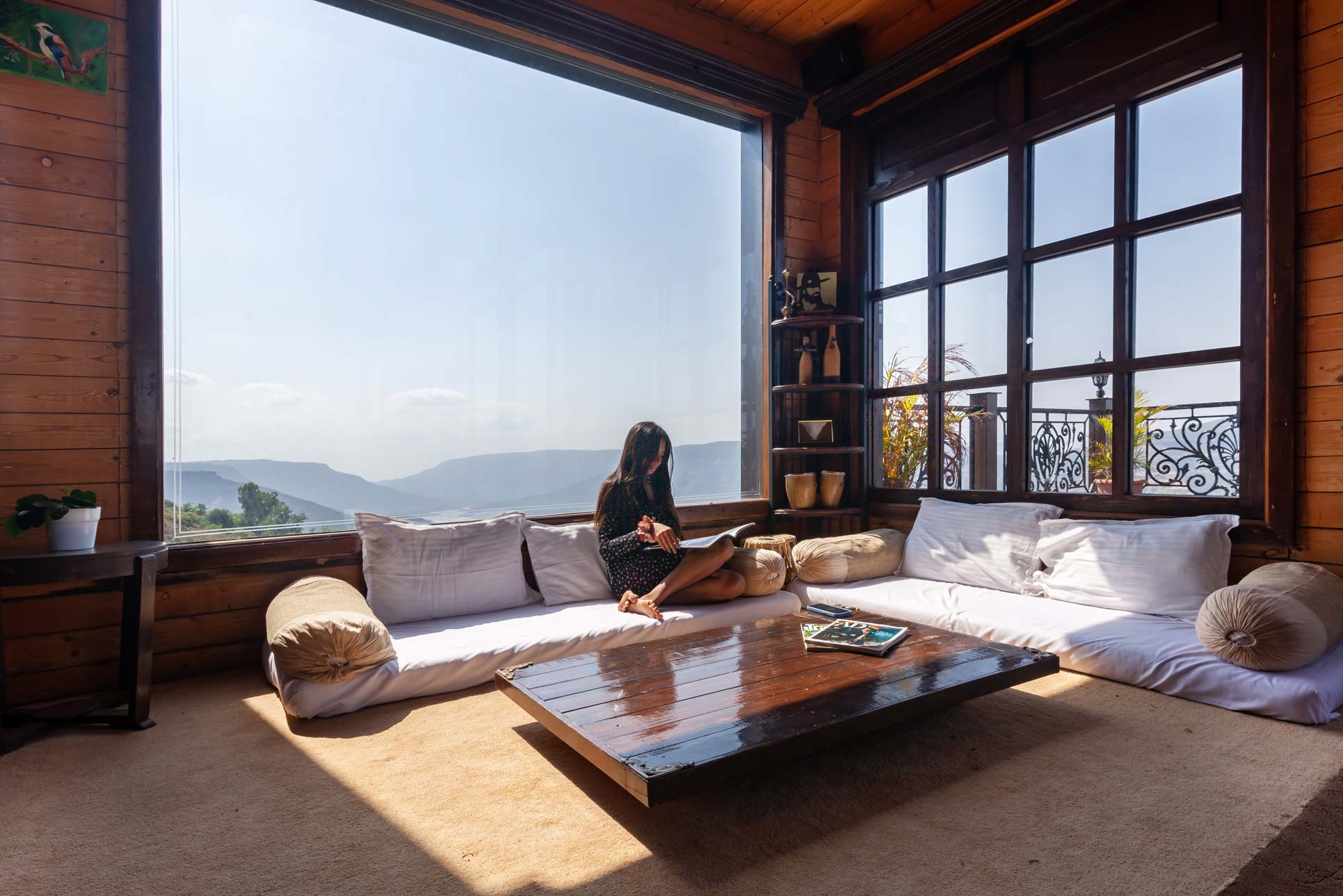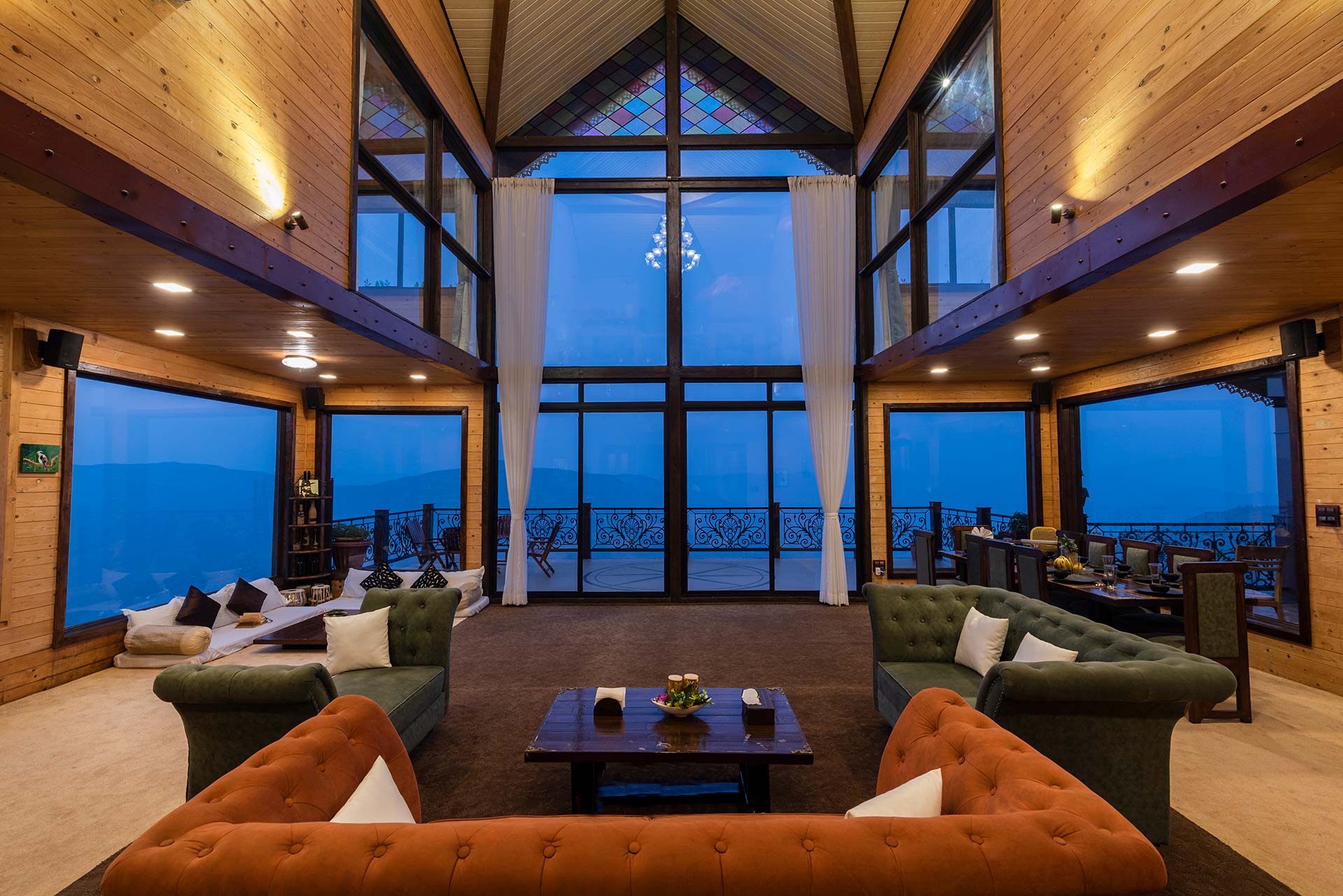 – It offers sofa-style seating, and mattresses for up to 15 people and is equipped with a music system and an attached balcony overlooking the surrounding hills.