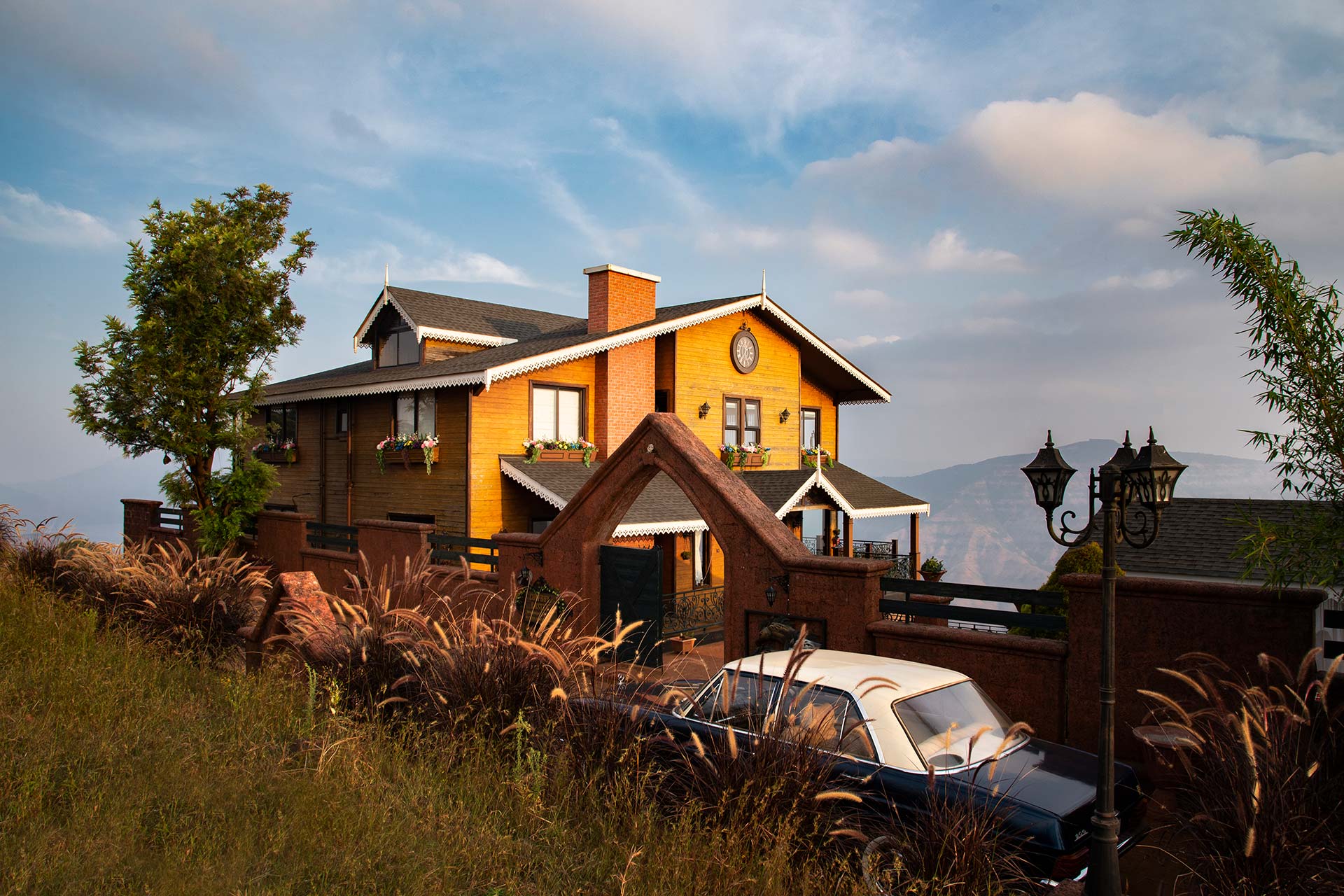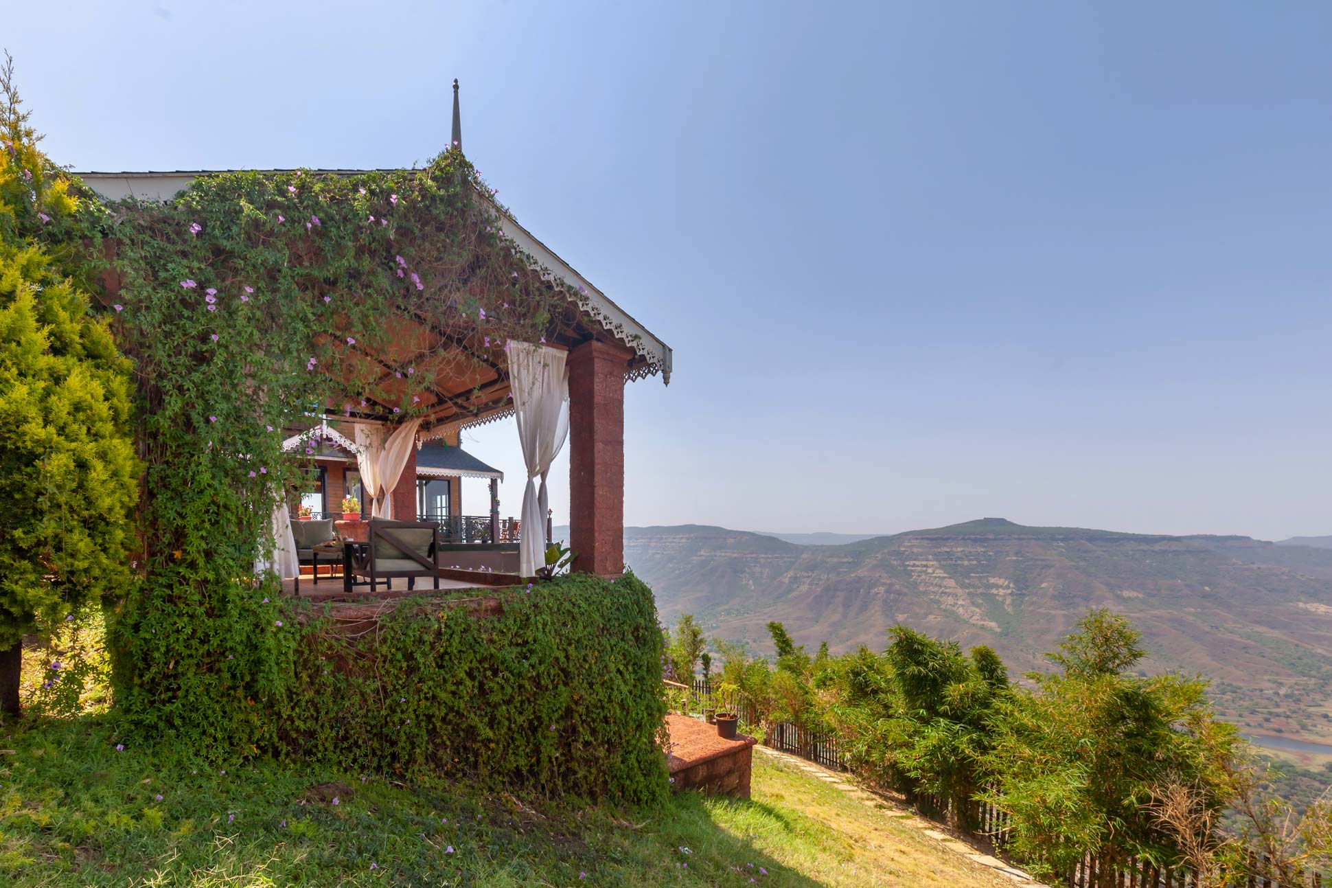 – The exteriors of the villa feature a 5000 sq. ft. sloping lawn, with an attached gazebo, complete with a sofas, a coffee table and blissful views.