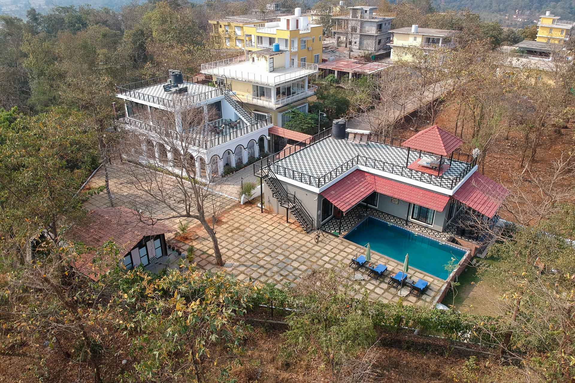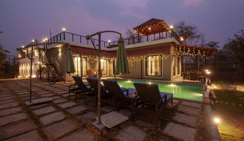 Perched upon a quaint hillock of Karjat, this serene holiday home promises the finest of nature. Dew Drops is strategically located in the heart of the town, yet nestled in the unending expanses of lush greenery, offering the absolute best of both worlds. Whilst being extremely accessible, the getaway lies in absolute quietude, solace and tranquillity. Walk down the hills, and you will find yourself on the foothills of a pristine lake, making for an ideal backdrop to unwind. With not a vehicle in sight, whilst here, we encourage you to disconnect from the outside world and reconnect with your loved ones and yourself. The spacious indoor spaces are ornamented with lavish furnishings and plush conveniences. With a private swimming pool and 2 private terraces overlooking the surrounding greenery, we promise this getaway would serve as the perfect break from the chaos. Brimming with a spectrum of amenities, this holiday home is everything you would want and more!