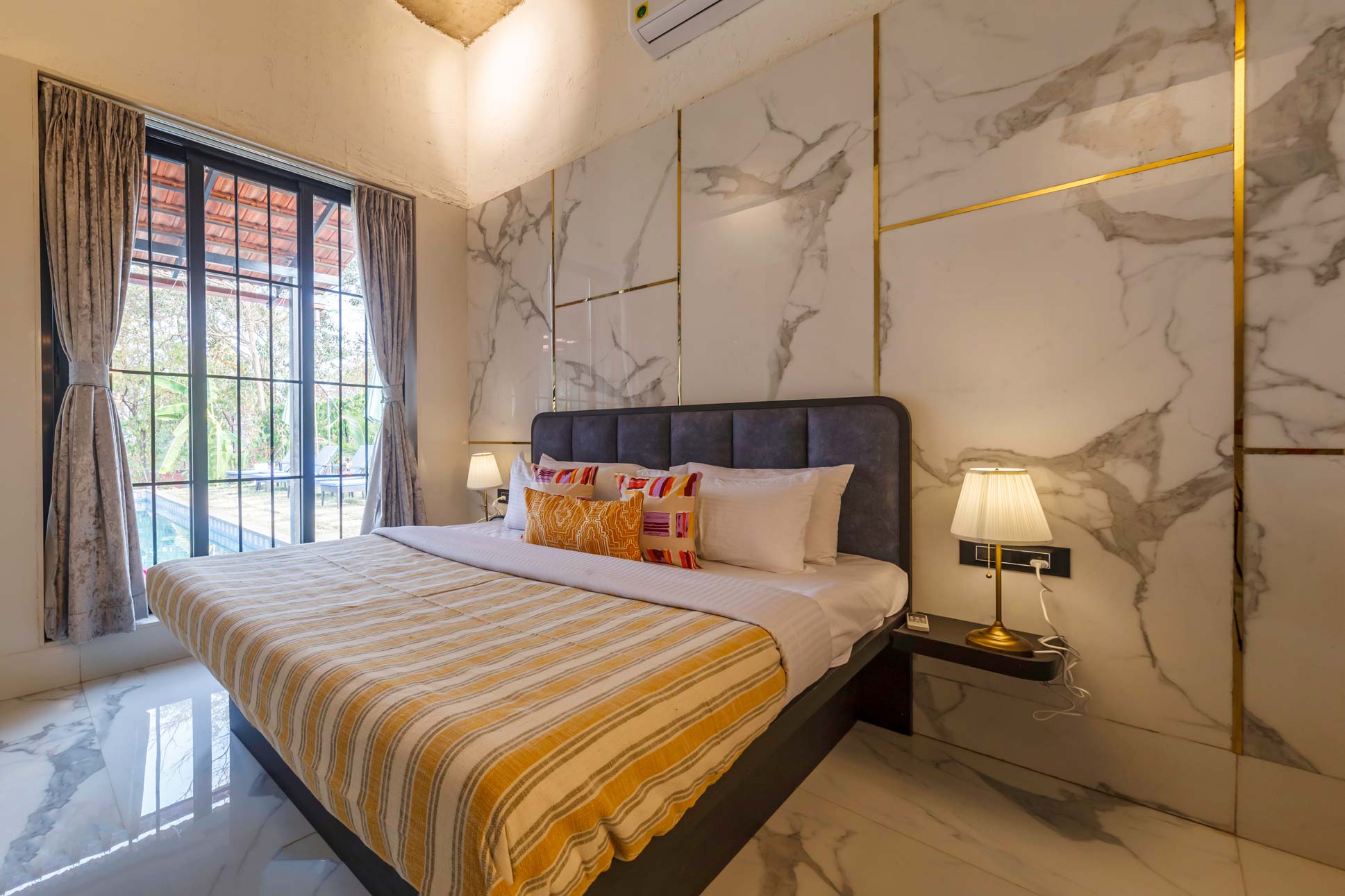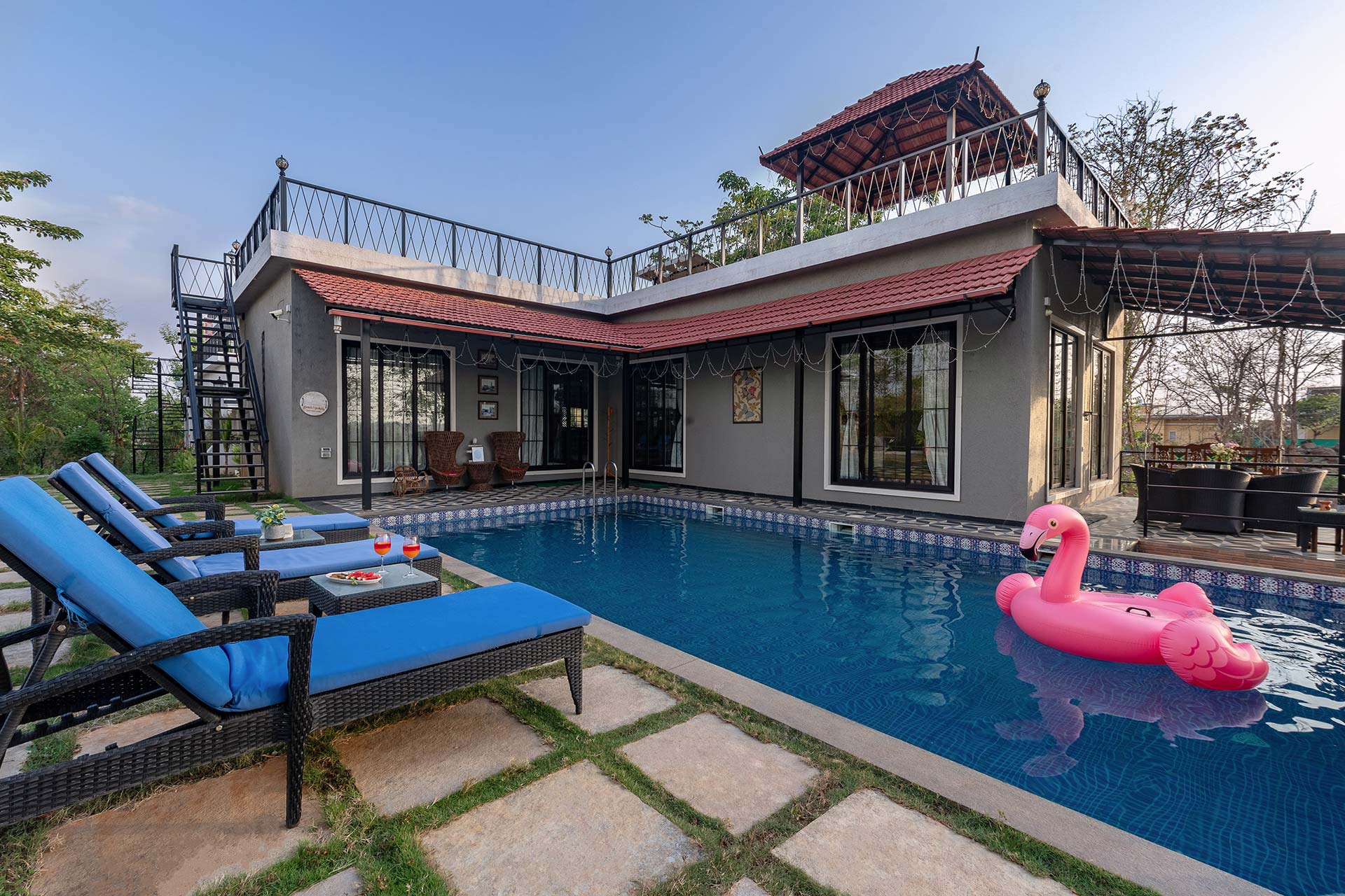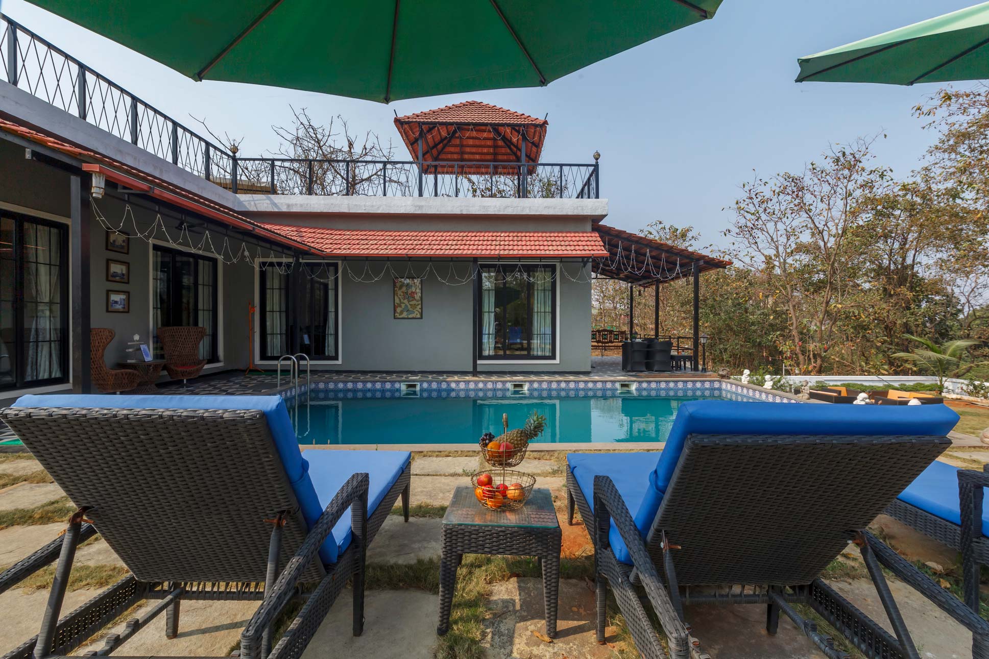 Promising to be a blissful getaway, a few hours away from the city, this holiday home boasts a host of experiences. Begin your days with a brisk morning walk in the serene gardens. Relish an elaborate breakfast in the company of chirping birds and sweet birdsongs. As the day progresses, head over to the gym and games room and spend quality time with your loved ones indoors playing pool. Come evening, head over to the private swimming pool for de-stressing dip and bask in the sun. The sky cabana makes for an ideal hangout spot. Unwind and relax on the pool loungers. Relish your favourite cocktails by the bar and enjoy meals in the alfresco dining space. Seek blessings in the in-house temple. End the day on the terrace, under a sky full of stars.