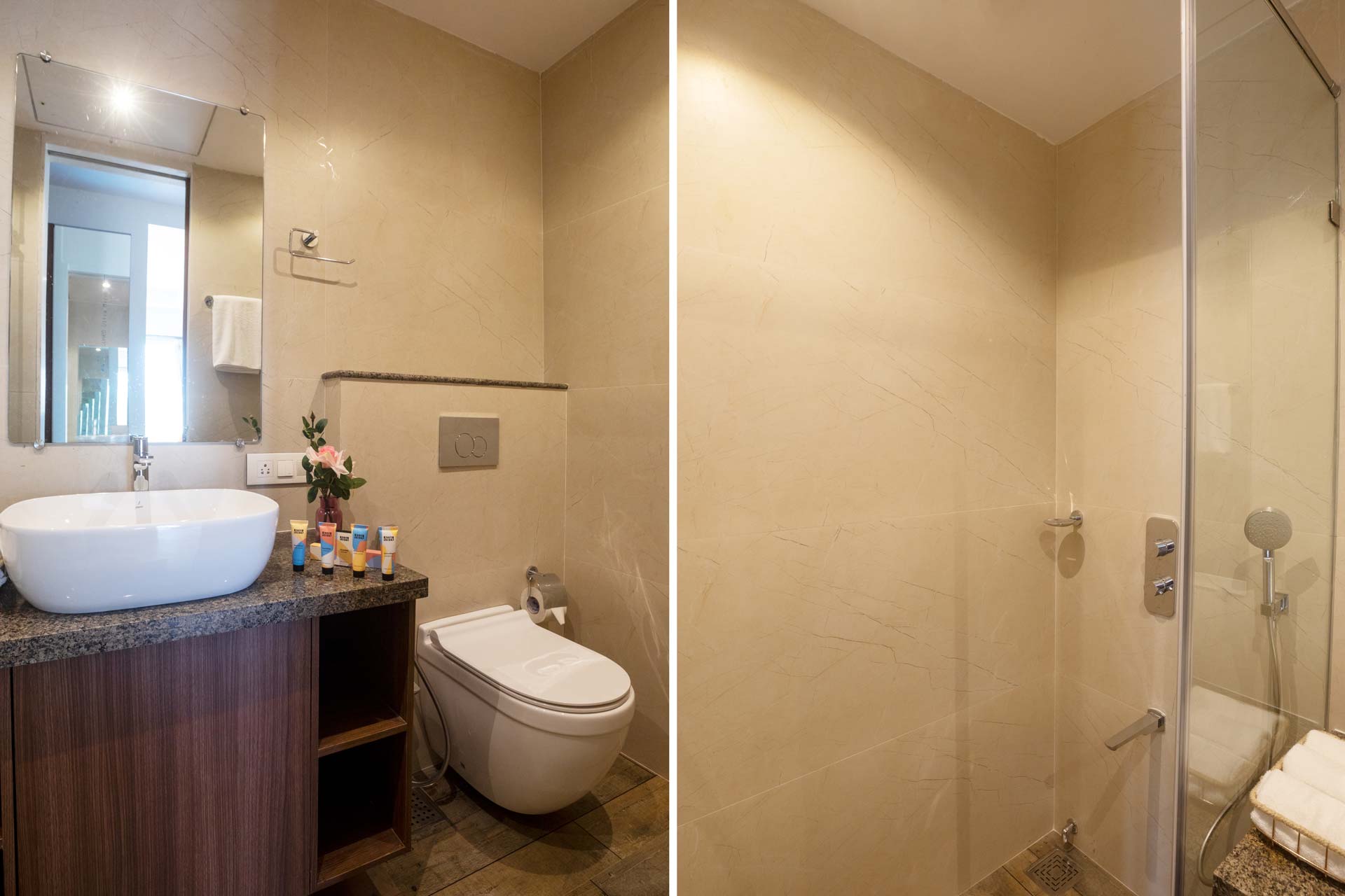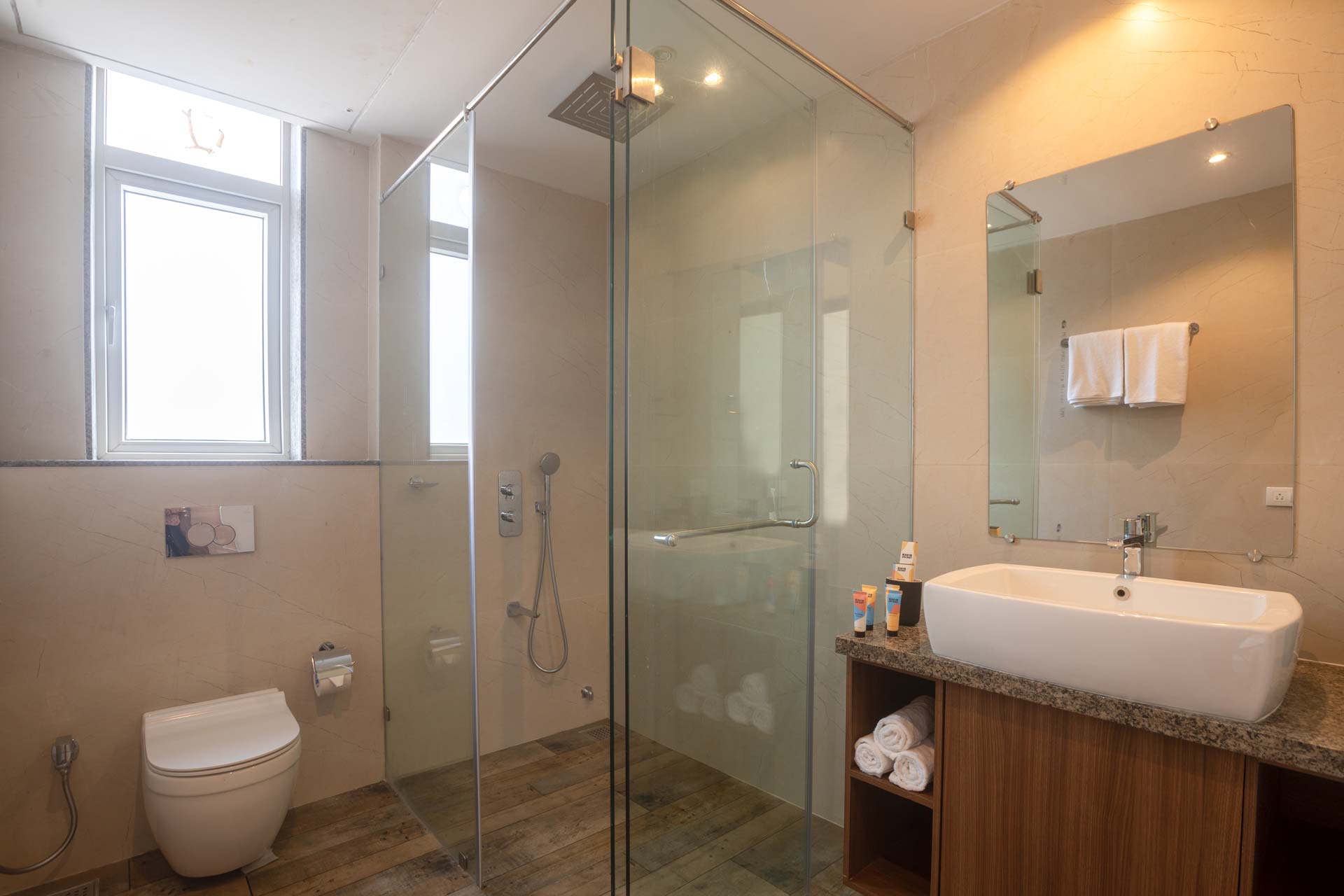– Each attached bathroom offers geysers, towels, and basic toiletries.