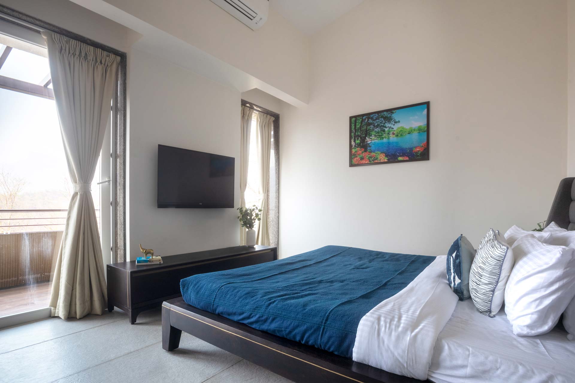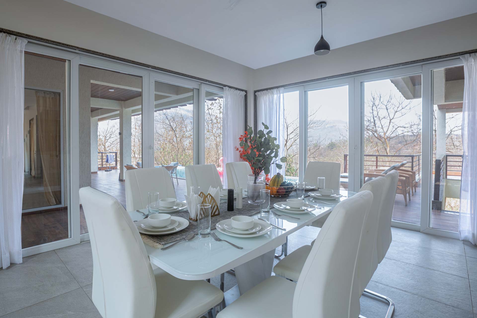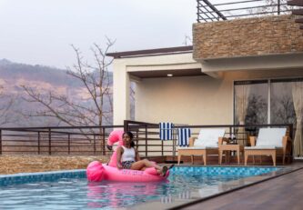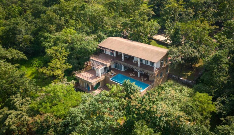 Just miles away from Mumbai’s unending clamour, this soothing getaway is the perfect home to enjoy the best of the serene, calming outdoors and the luxurious and cosy indoors – it’s the perfect leisurely escape. Inside, the muted palette exudes tranquillity, and the elegant decor along with the breezy windows make the whole space feel bright and airy. After relaxing with your morning coffee in the light-filled living area, head out to the pool to catch some rays and cool off from the midday sun. Walk to the spacious deck area only to realise you are surrounded by greenery. Sheer opulence and solace. This home has something for everyone, whether you want to play around in the pool overlooking nothing but greens, take long afternoon naps by the balconies, or just explore the walking trails around the home as you witness some mesmerising vistas.