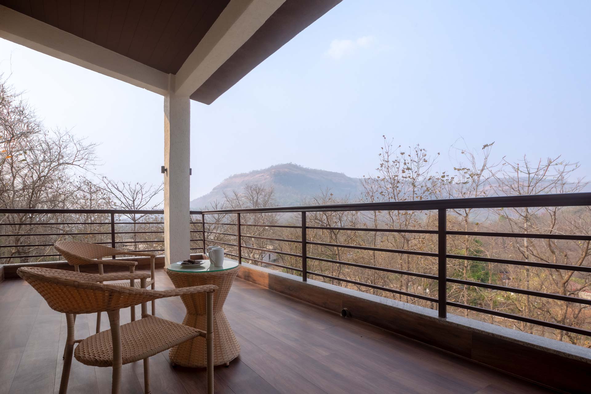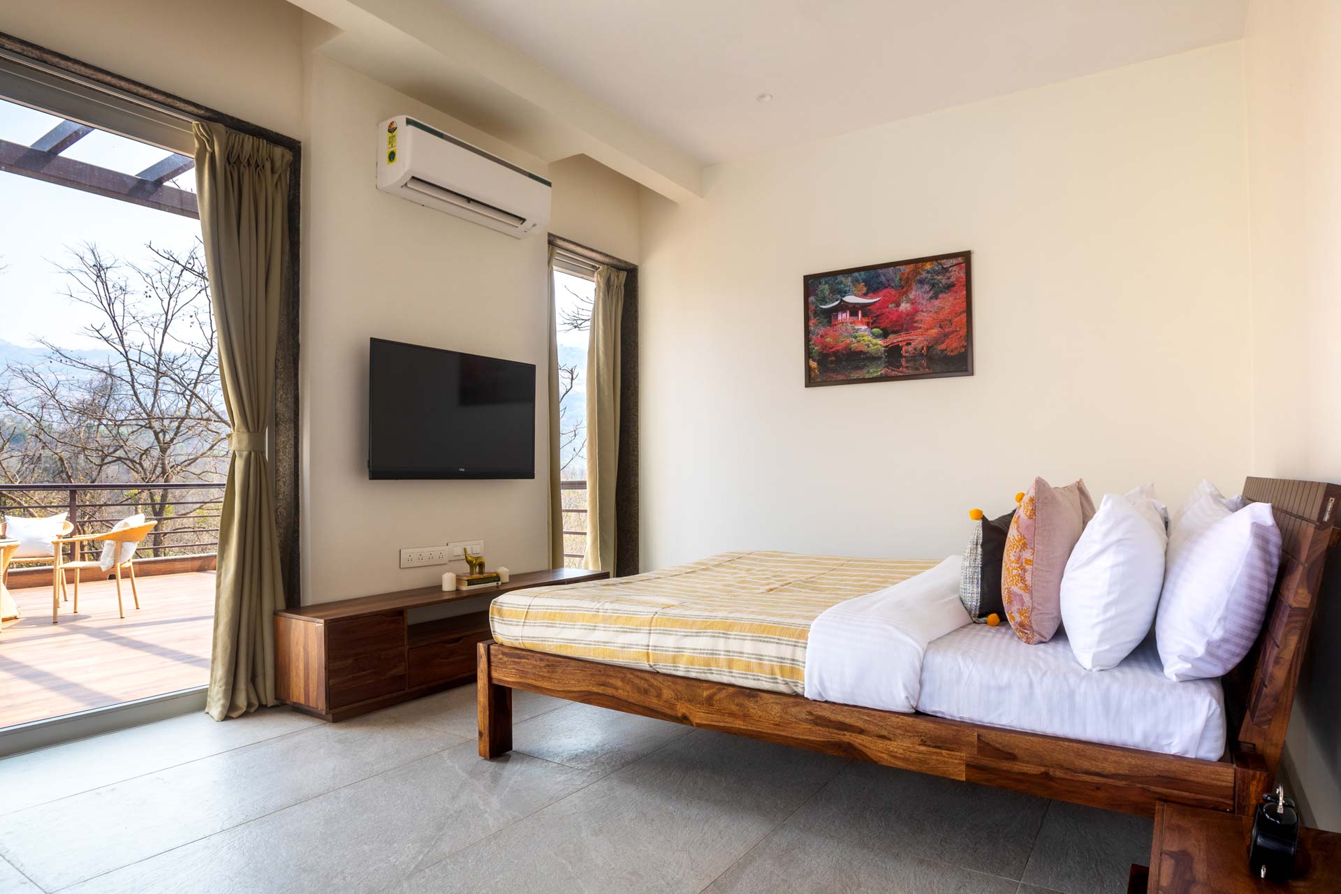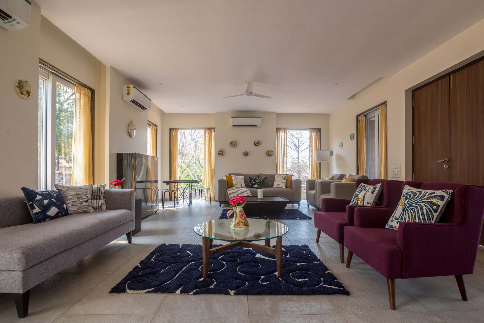 Just miles away from Mumbai’s unending clamour, this soothing getaway is the perfect home to enjoy the best of the serene, calming outdoors and the luxurious and cosy indoors – it’s the perfect leisurely escape. Inside, the muted palette exudes tranquillity, and the elegant decor along with the breezy windows make the whole space feel bright and airy. After relaxing with your morning coffee in the light-filled living area, head out to the pool to catch some rays and cool off from the midday sun. Walk to the spacious deck area only to realise you are surrounded by greenery. Sheer opulence and solace. This home has something for everyone, whether you want to play around in the pool overlooking nothing but greens, take long afternoon naps by the balconies, or just explore the walking trails around the home as you witness some mesmerising vistas.
