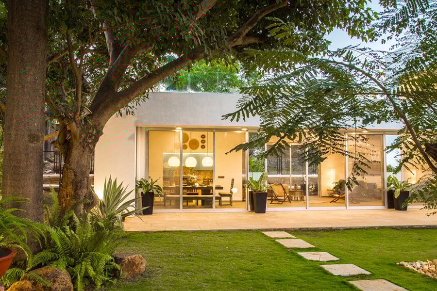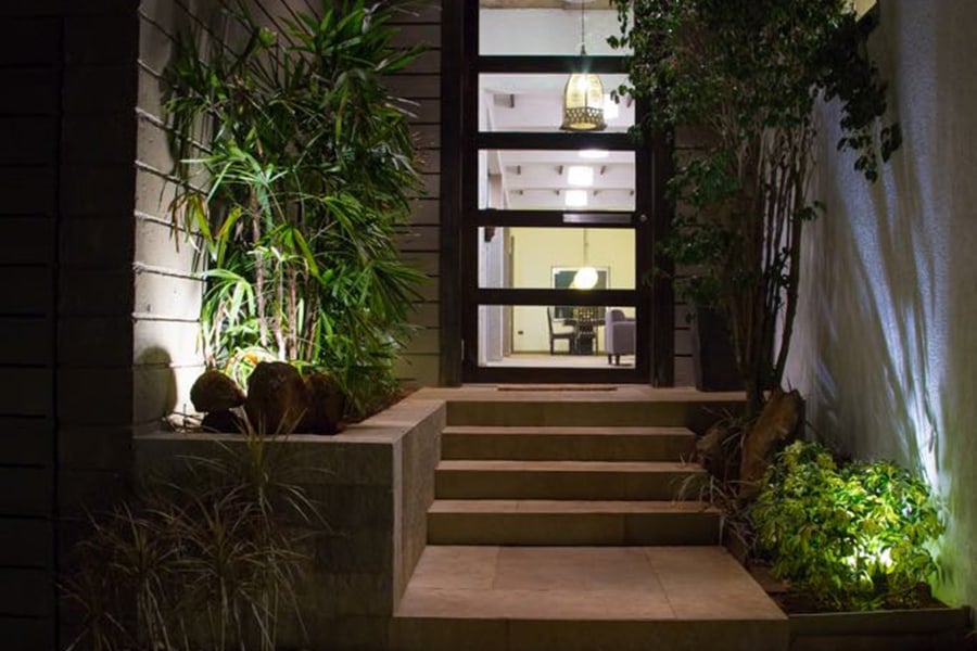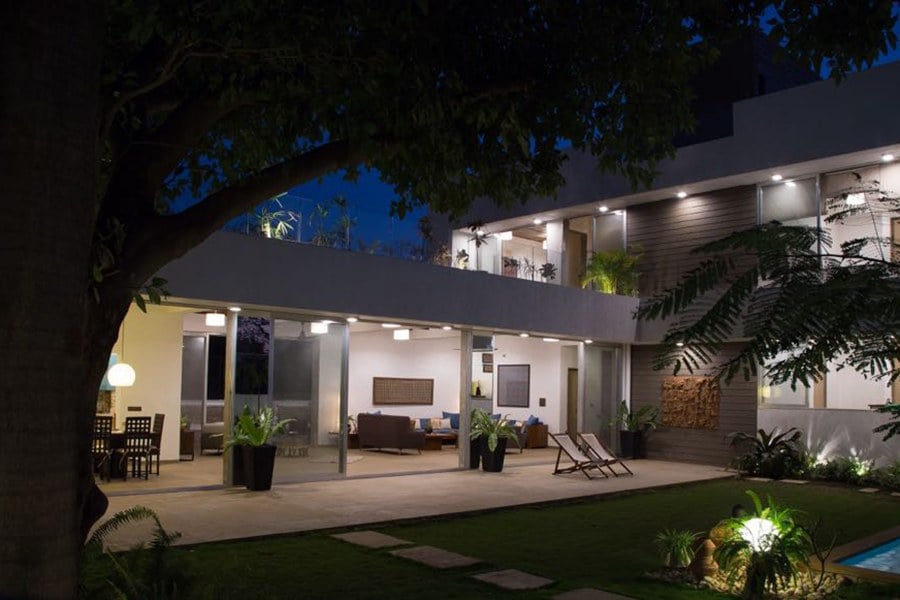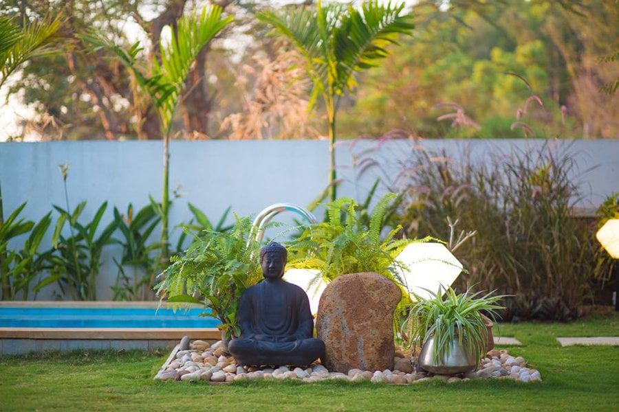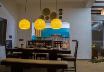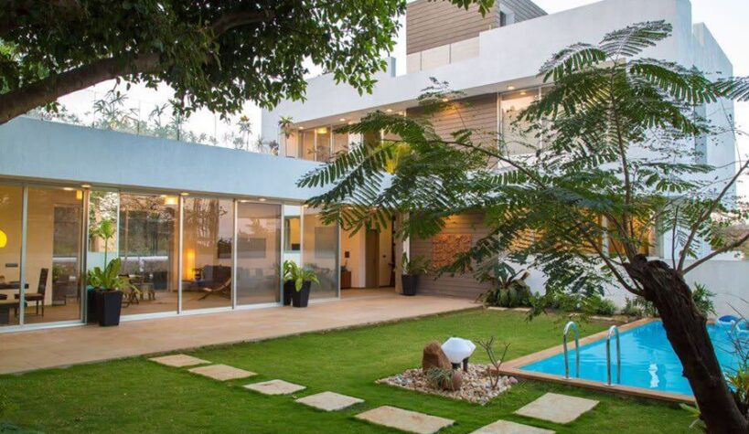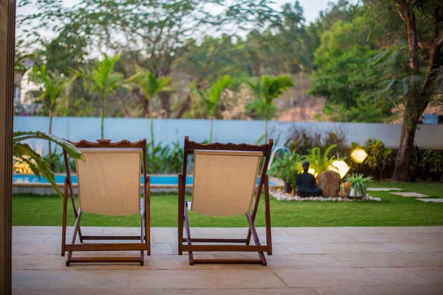 A front lush emerald garden is lined with blooming flora and a magnificent private pool, perfect to detach you from the city’s chaos and spend a laid-back, relaxing weekend with friends and family. The roomy interiors and vast poolside lawn is designed to host age-old vintage style get-togethers, so party big and make the most of it!