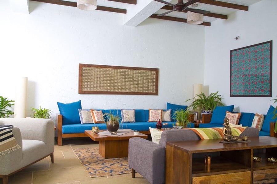 – This boho-chic home opens up to a spacious living room on the ground floor, furnished with plush seating arrangements for up to 10 people.