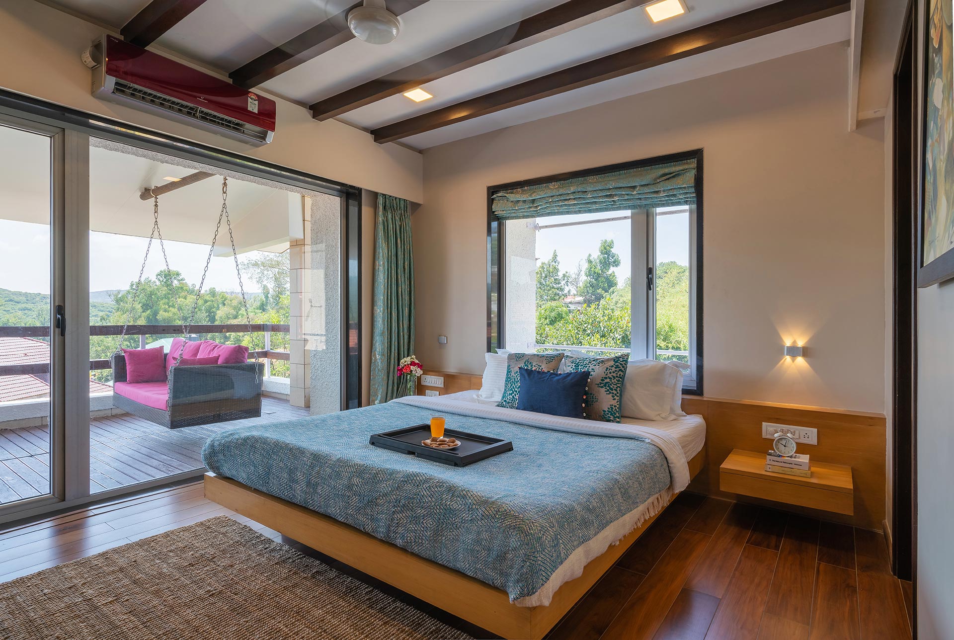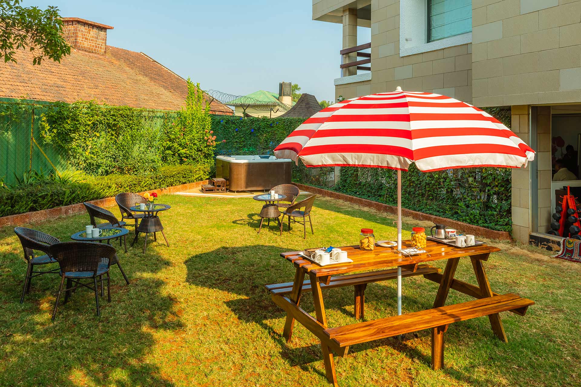 Explore the cosy corners of this giant villa where you can find swings, hammocks and various nooks to unwind and relax. Don’t forget to take advantage of the gym that features many equipment for workouts. Unwind yourself by soaking in the warm waters of the jacuzzi, a perfect way to soothe your soul and rejuvenate your body. End your day by sitting in the patio or the sit-out in the garden and top it with a bonfire with your friends and family. Emilia Villa, arelaxful retreat in the arms of nature awaits your presence.