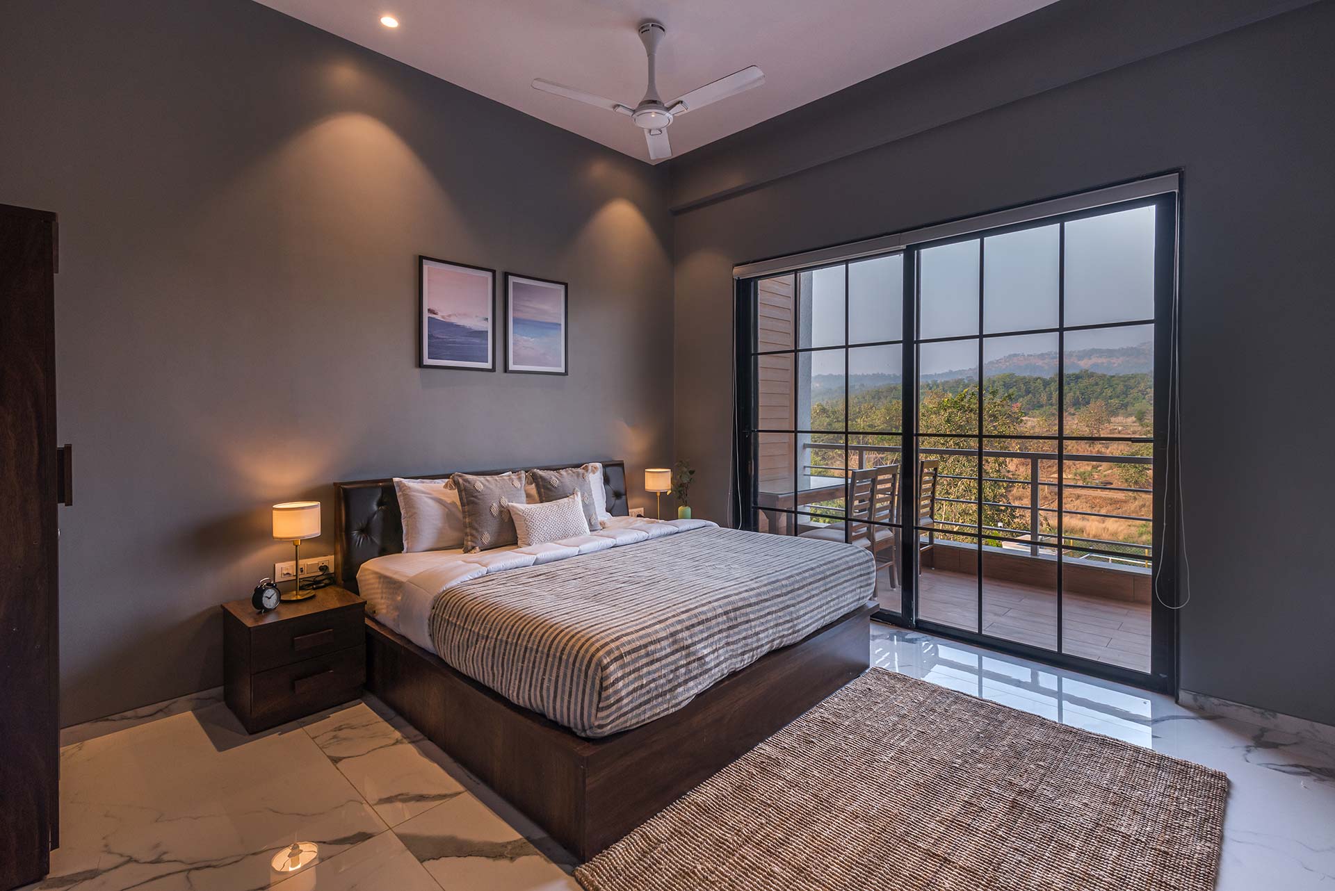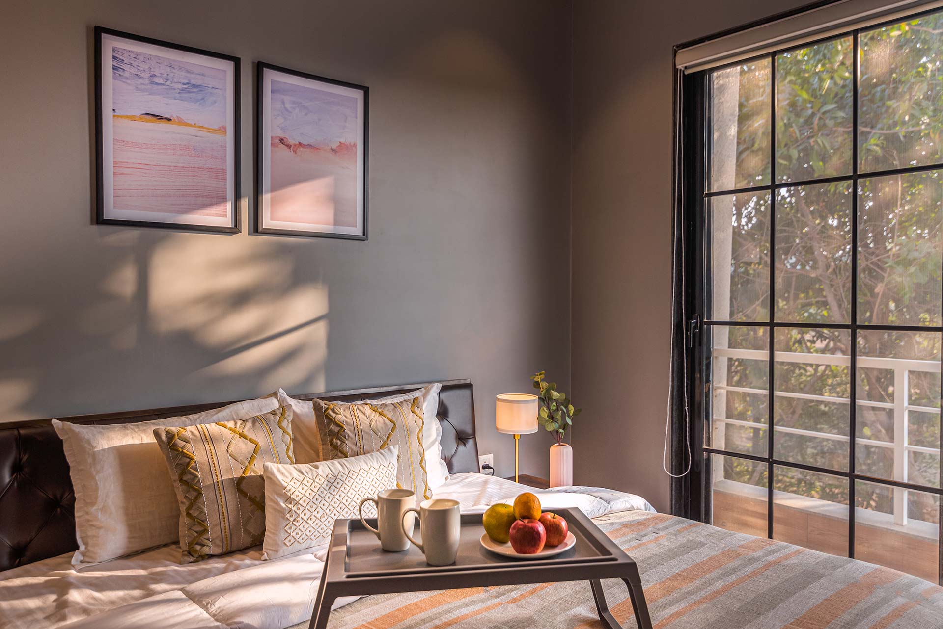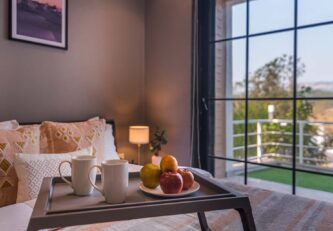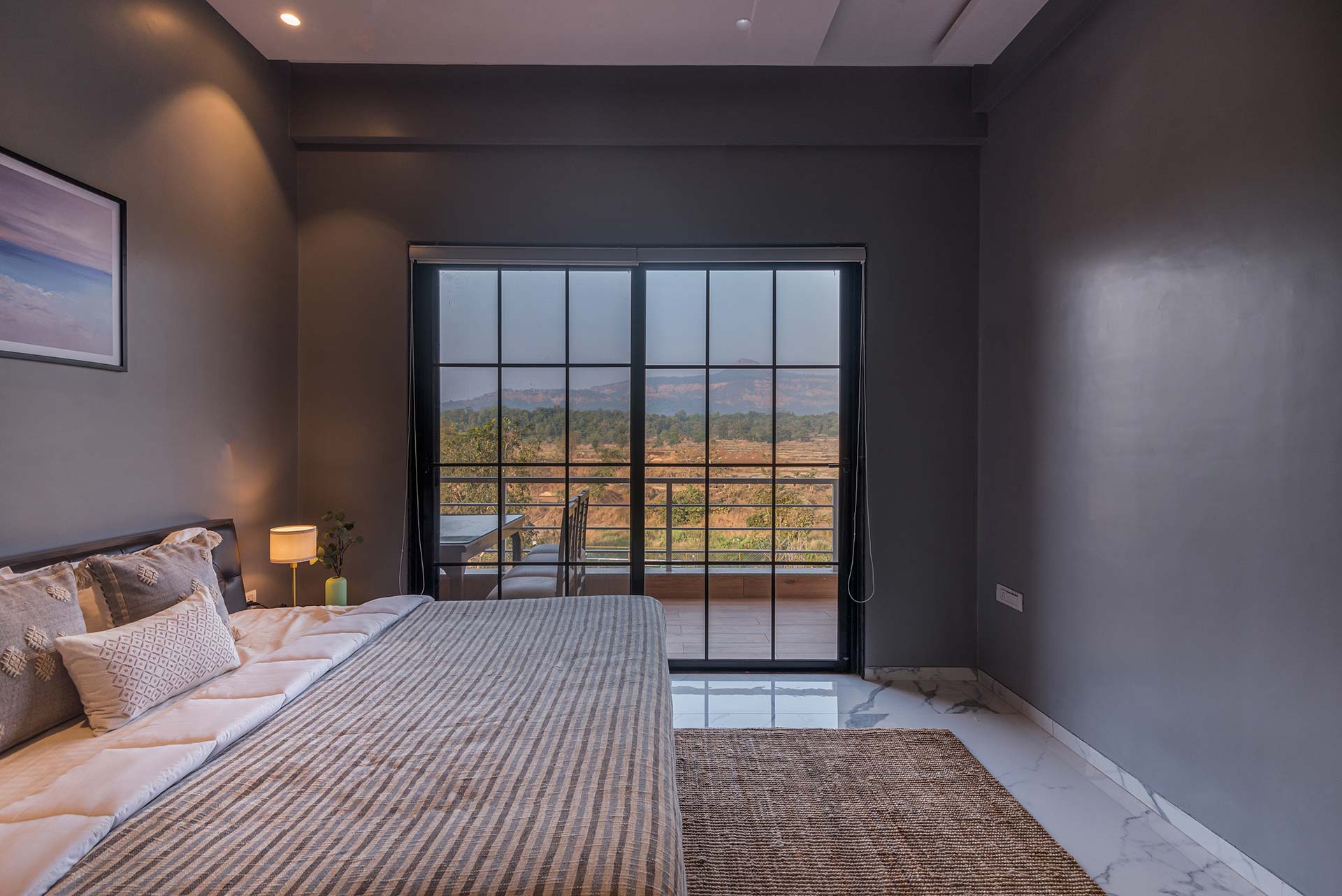 – One of the rooms on the first floor, offers a huge expanse and a wrap-around balcony, with a view of the mountains on one side and fields on the other.