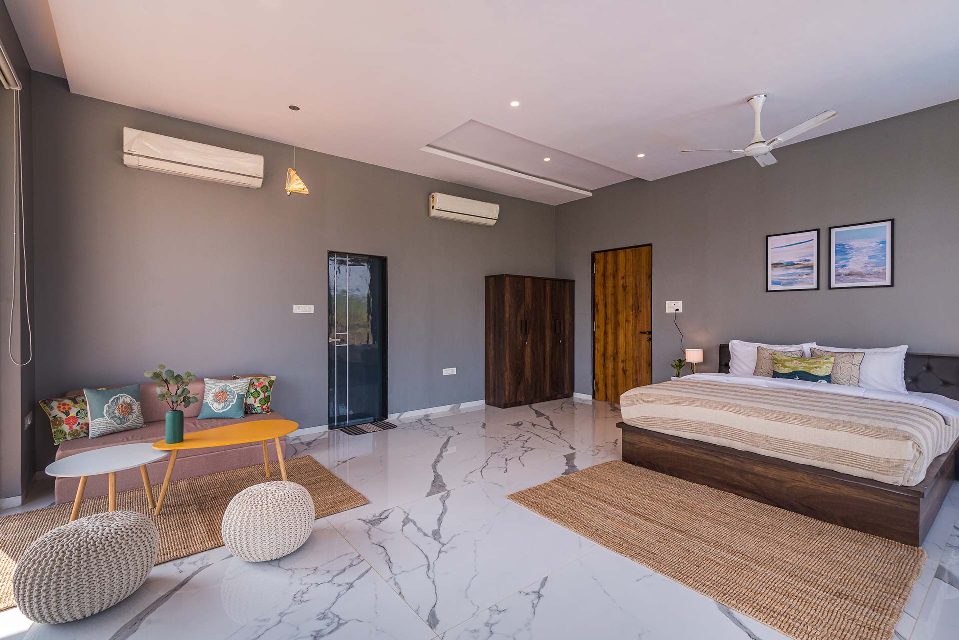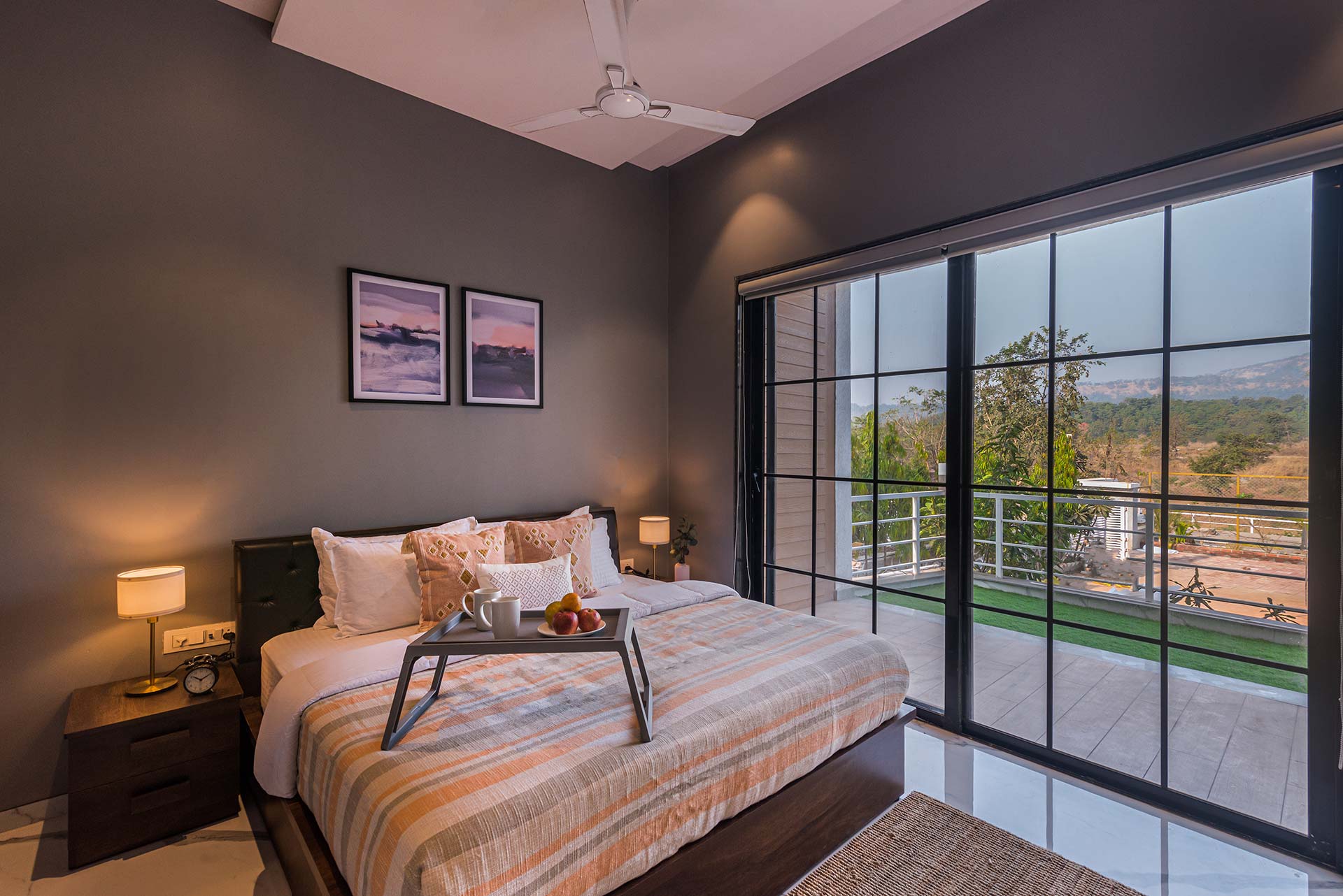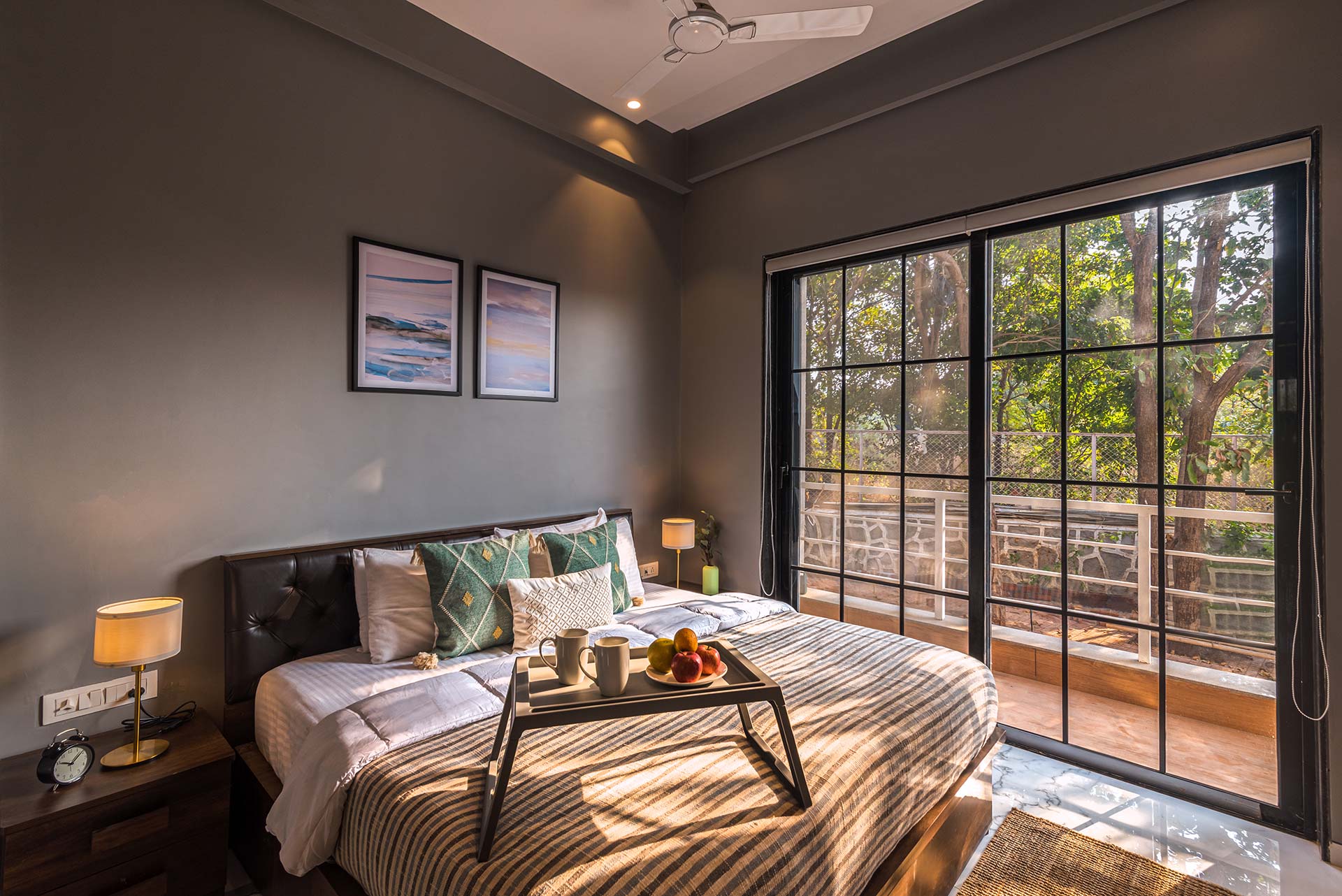 – One of the rooms on the first floor, offers a huge expanse and a wrap-around balcony, with a view of the mountains on one side and fields on the other.