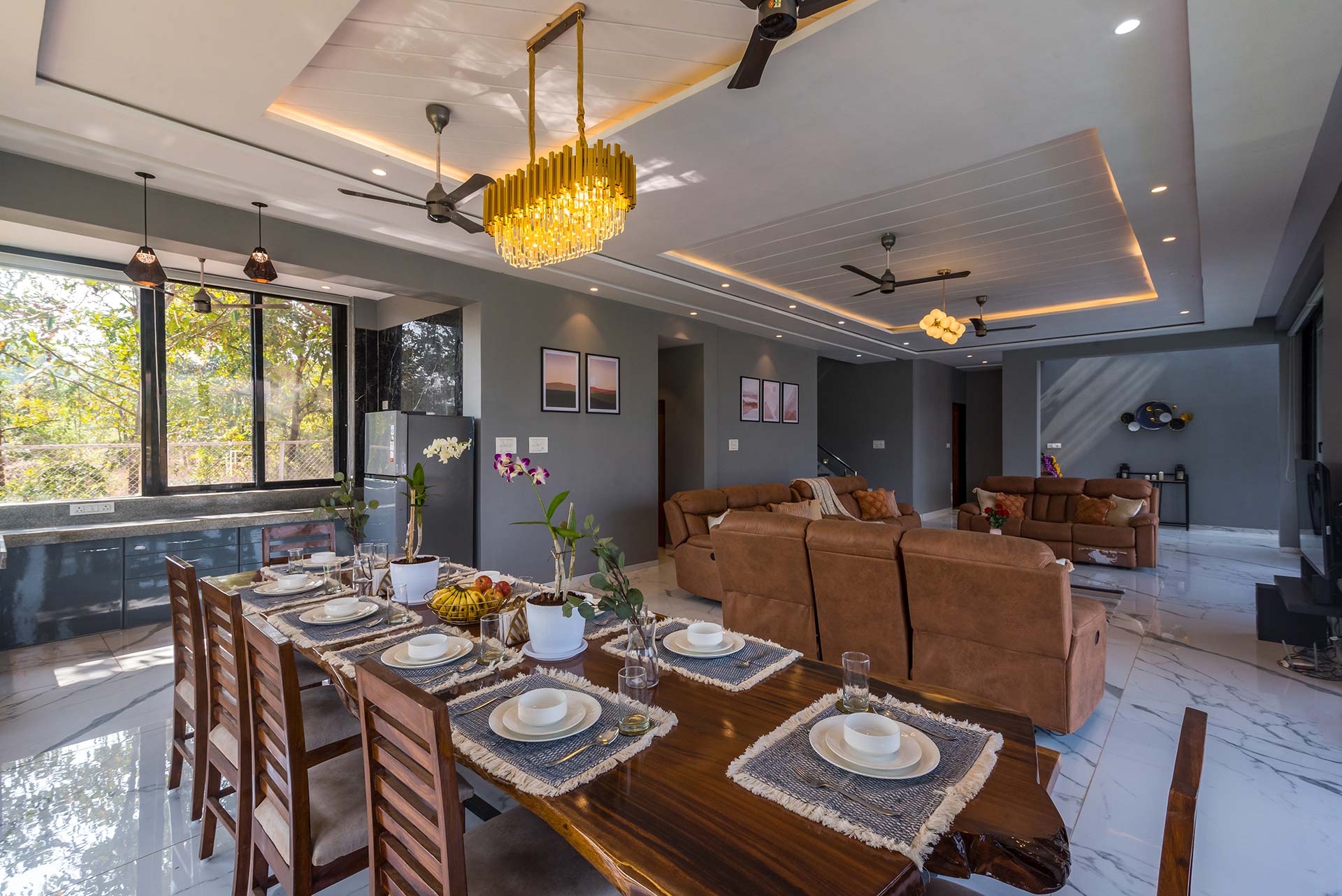 – With the melodies of the rippling waters of the river echoing through the expanse of this uber-luxe abode, a walk through the stunning interiors will lead you to a spacious living room on the ground floor.