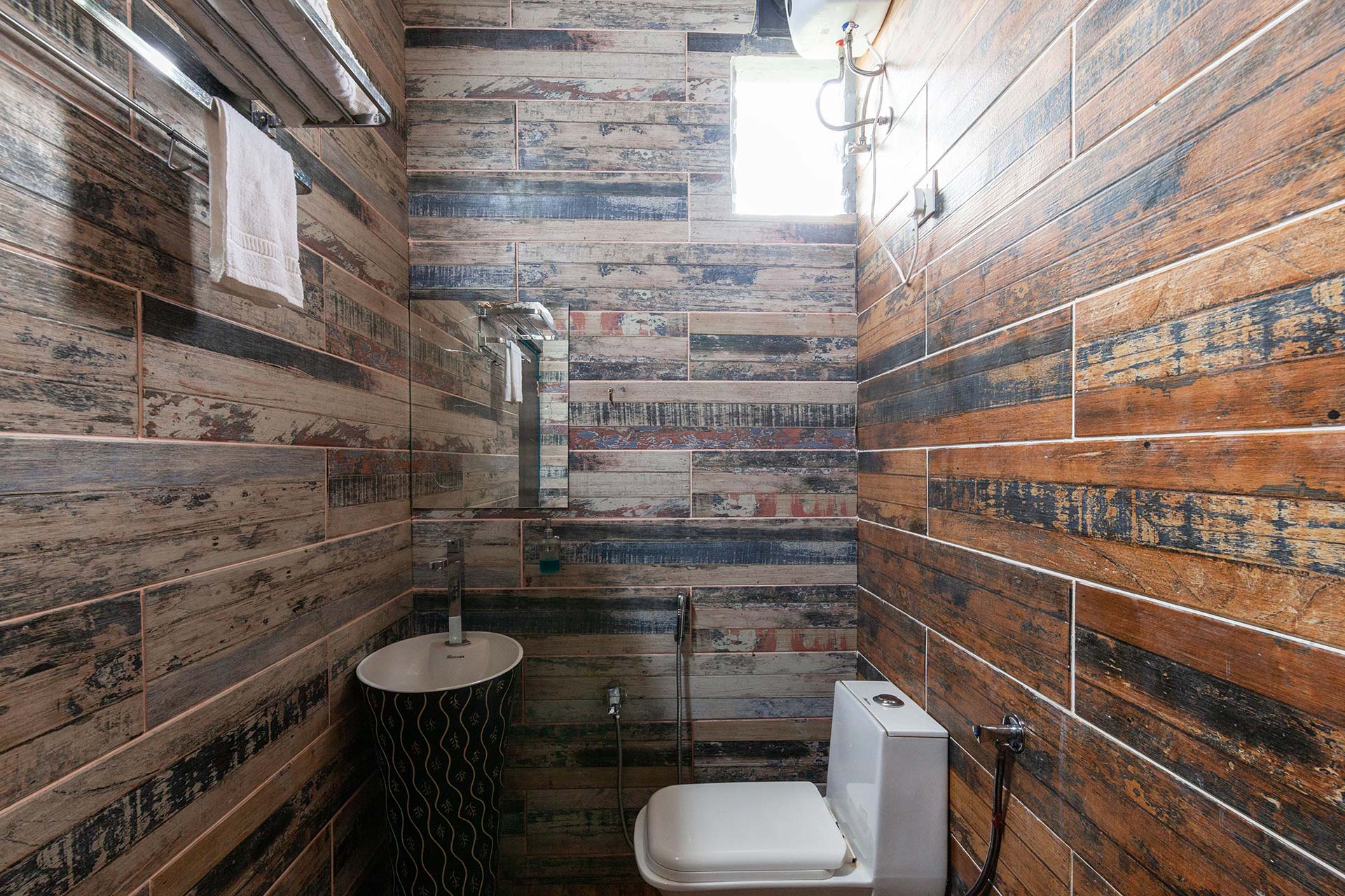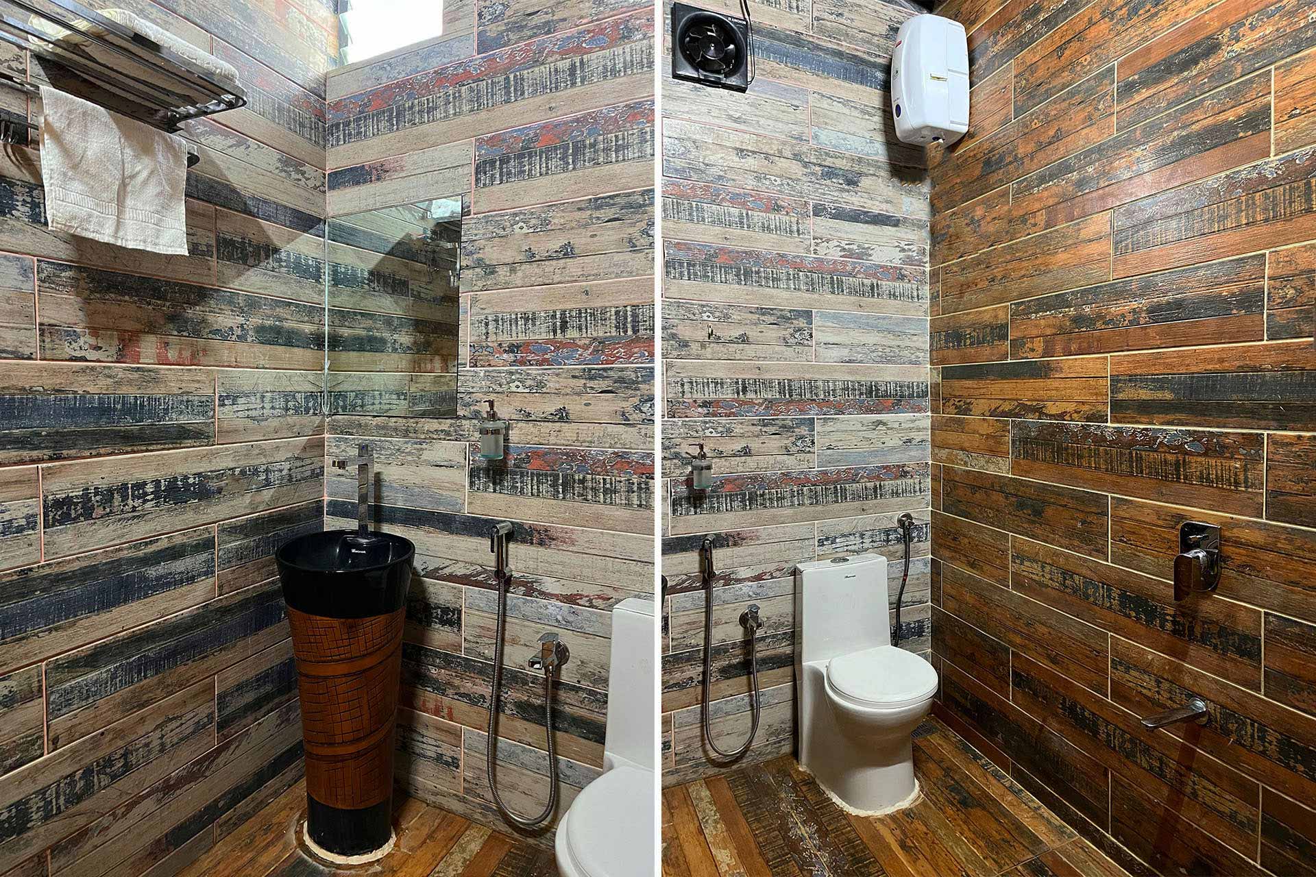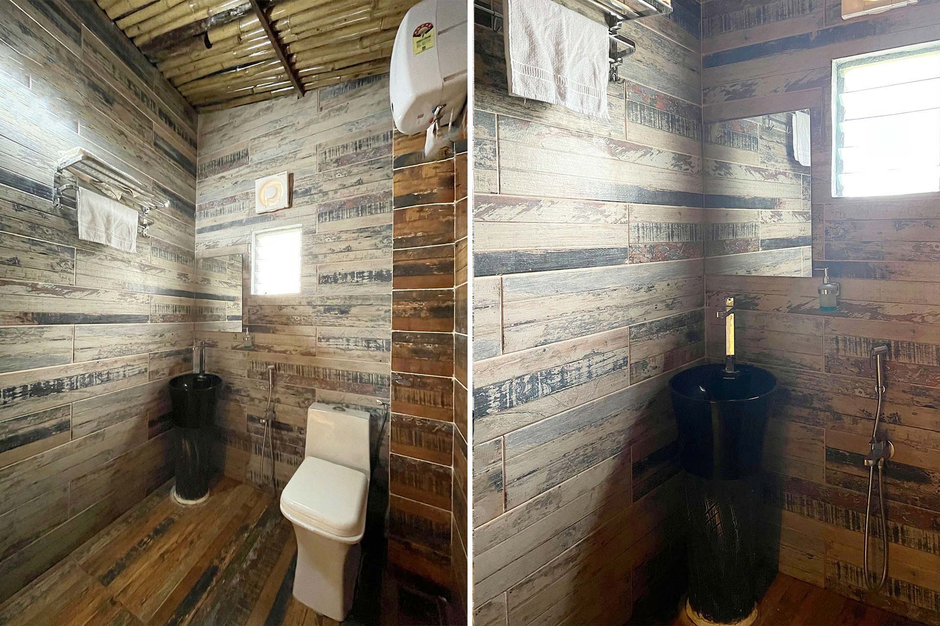 – All attached bathrooms have geysers, towels, basic toiletries, and a rustic bamboo shower area.