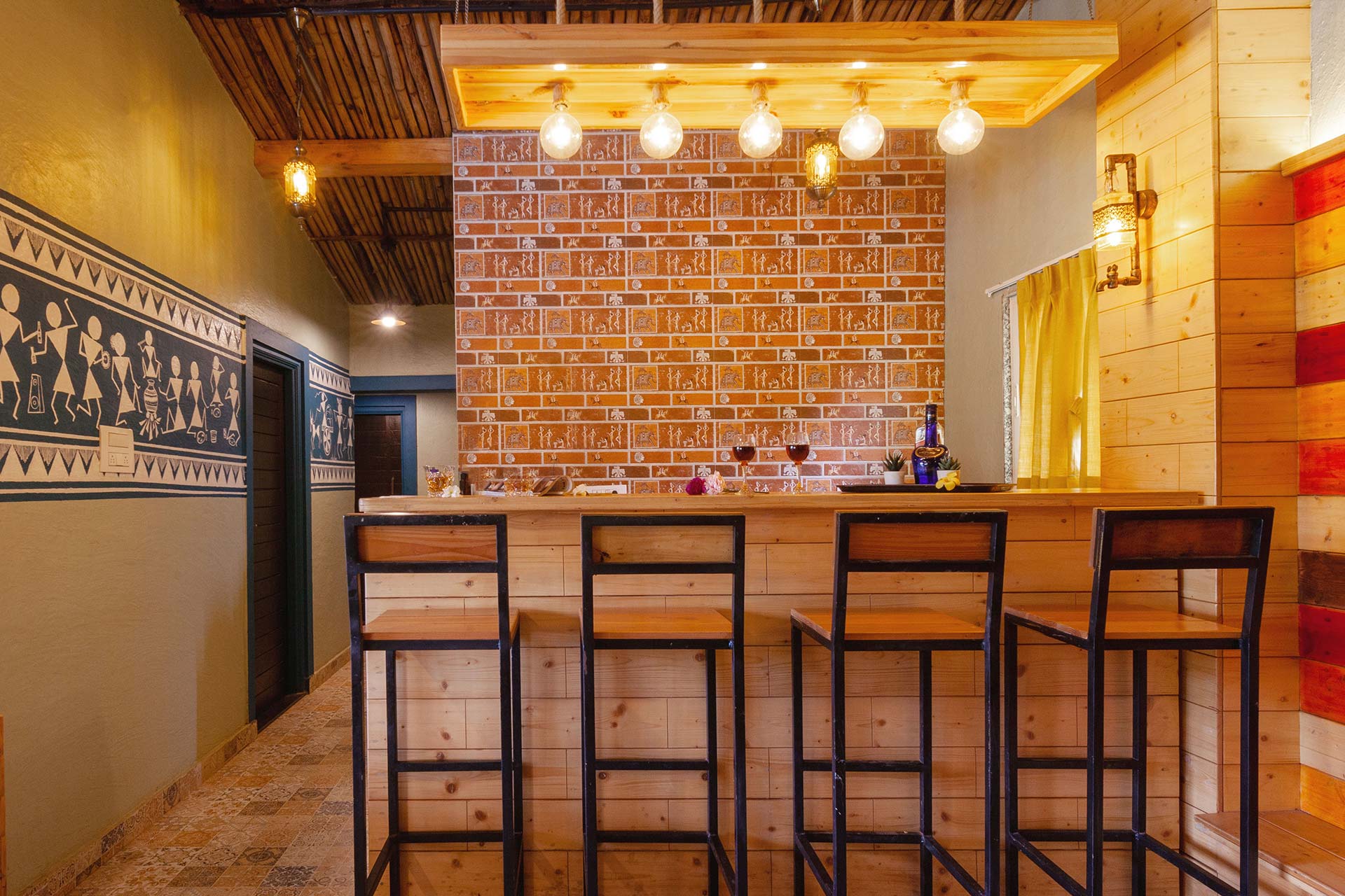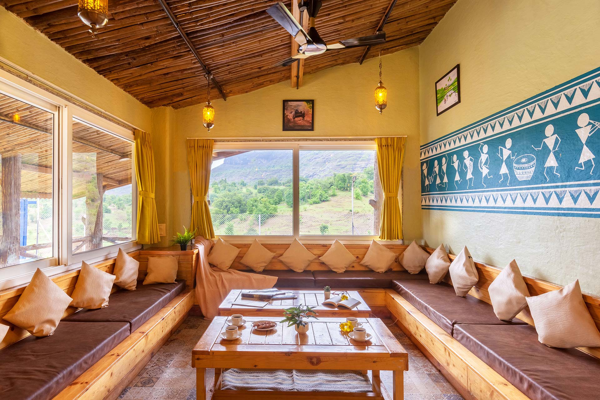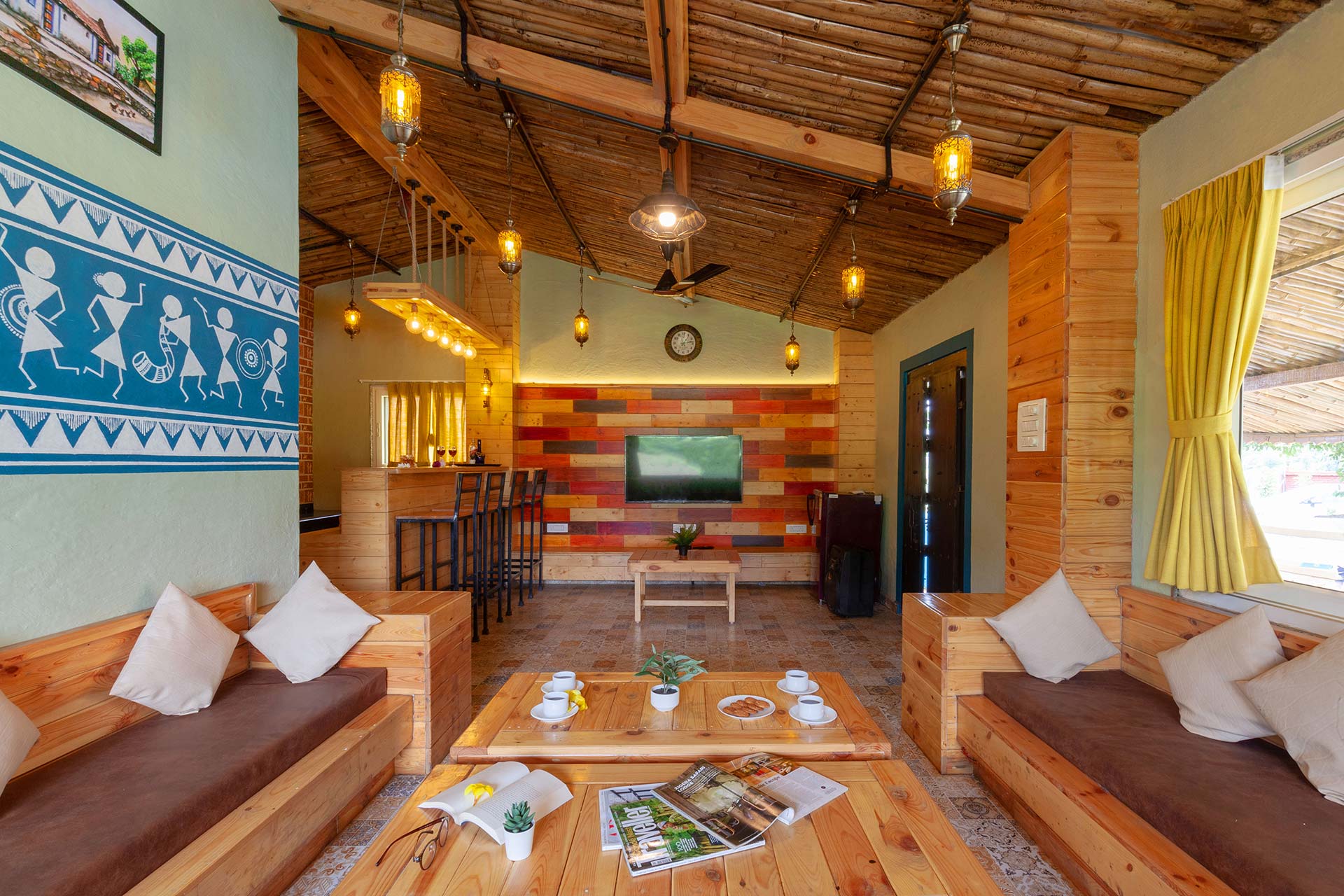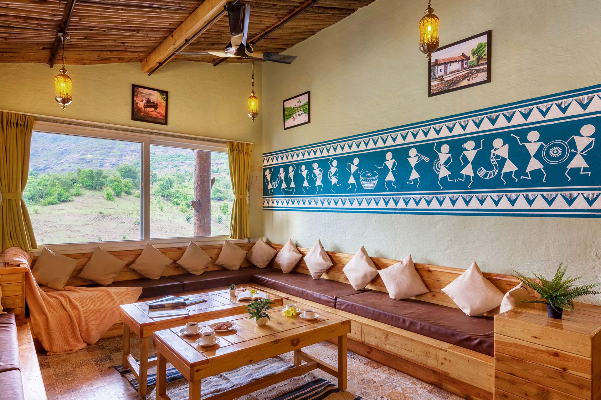 – Adorned in mellow pastels, Warli paintings and eloquent lamps, this room also features a wooden sofa that can seat up to 12 people.
