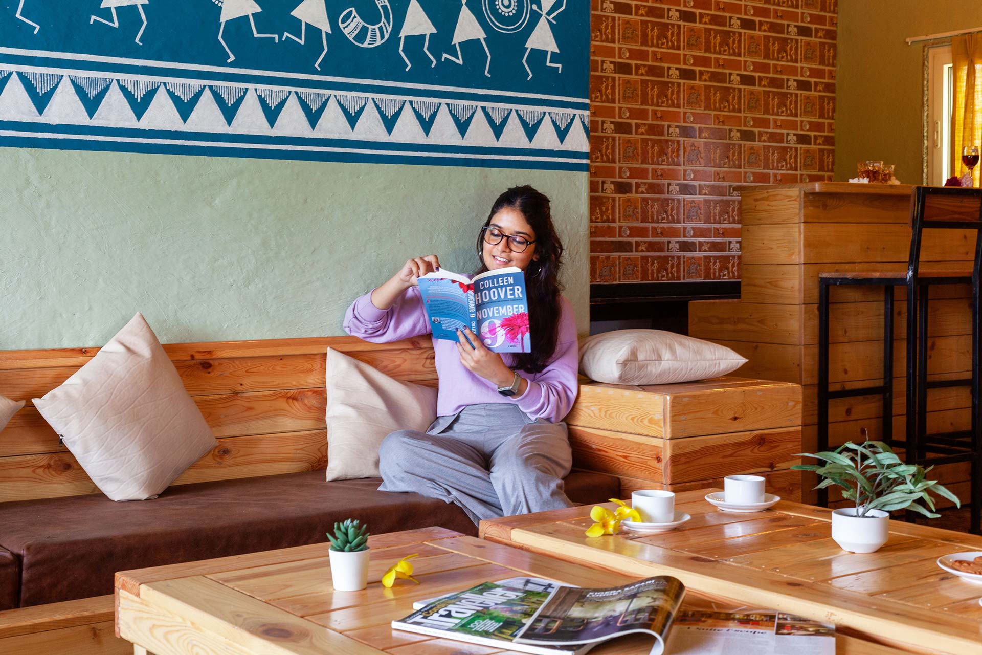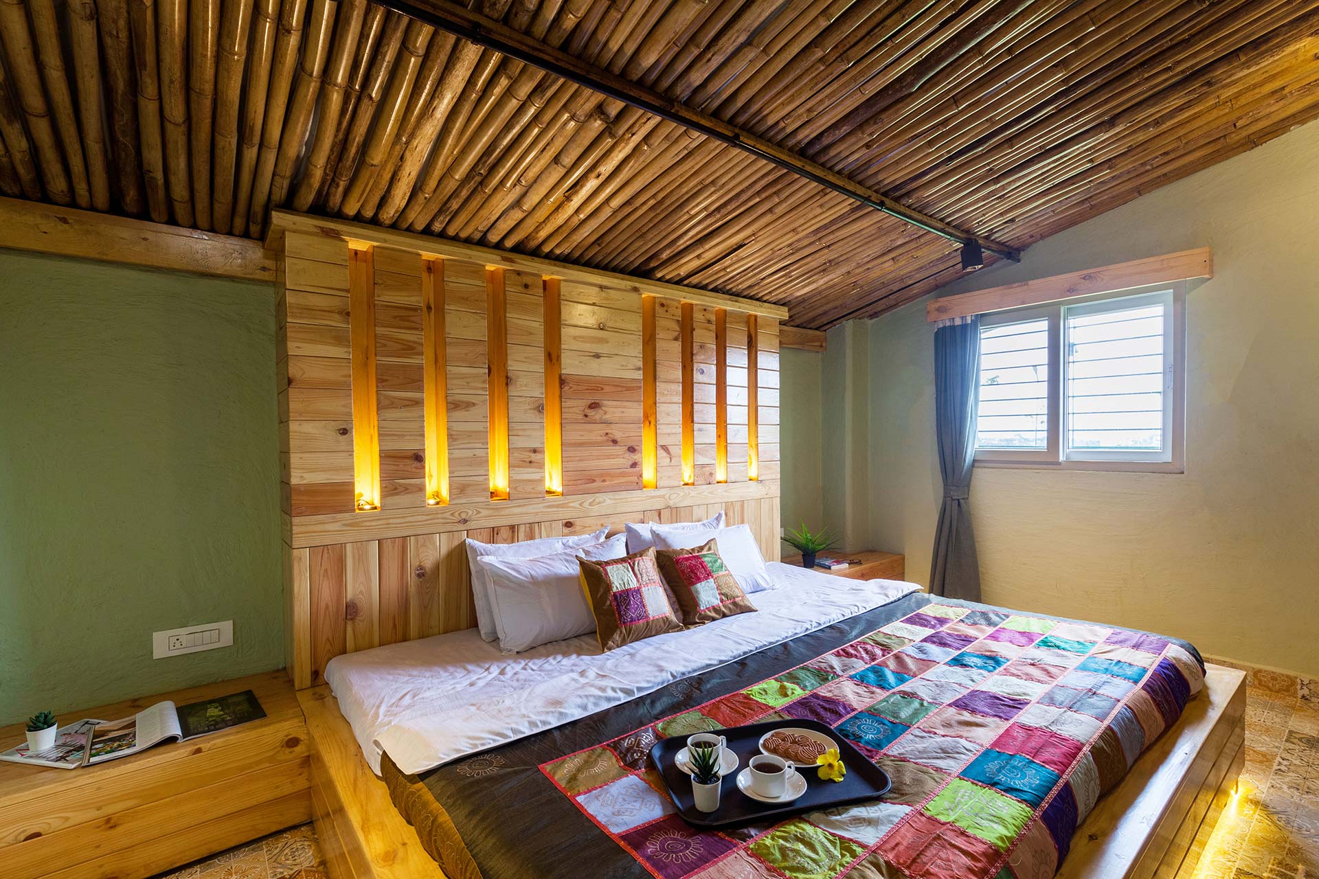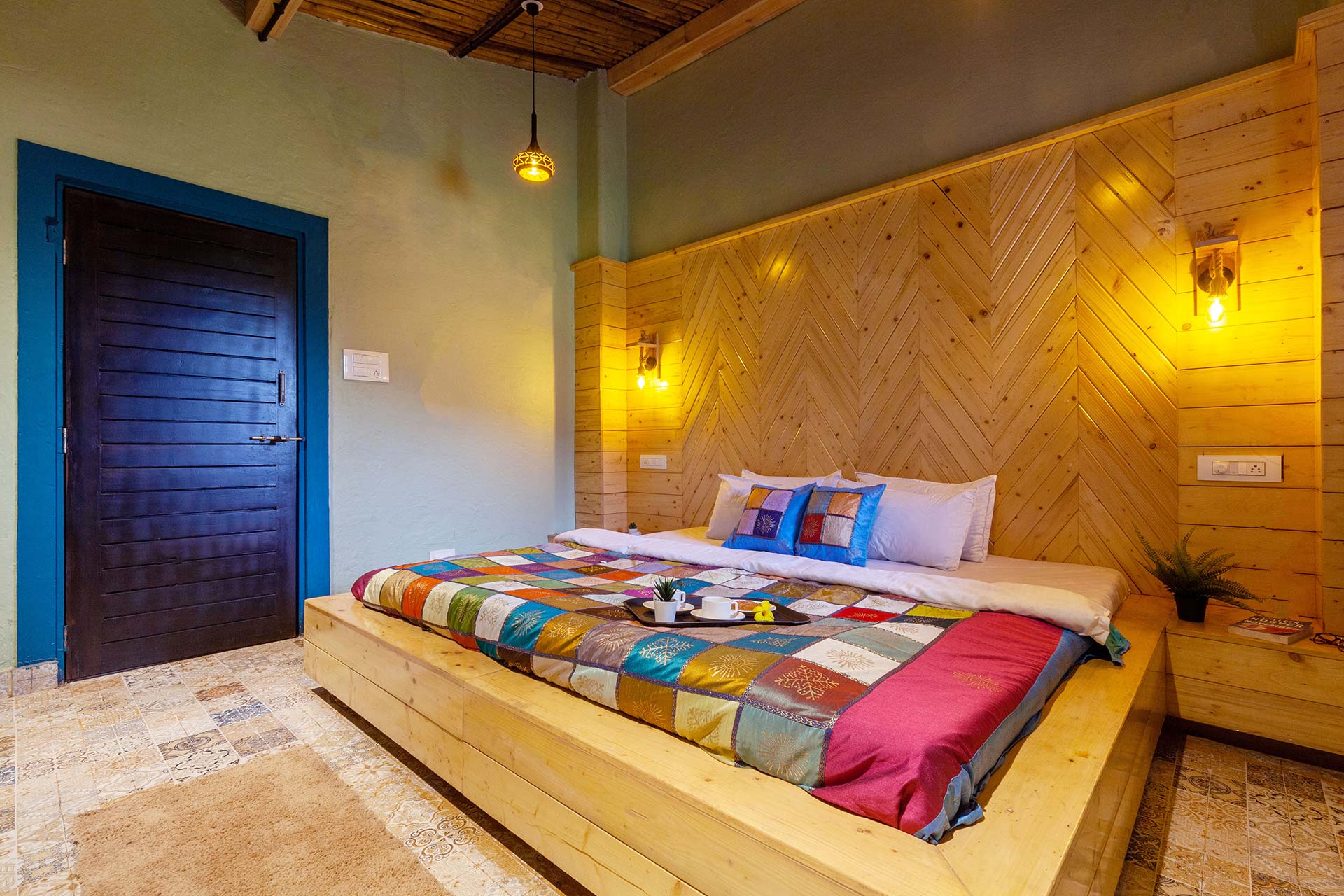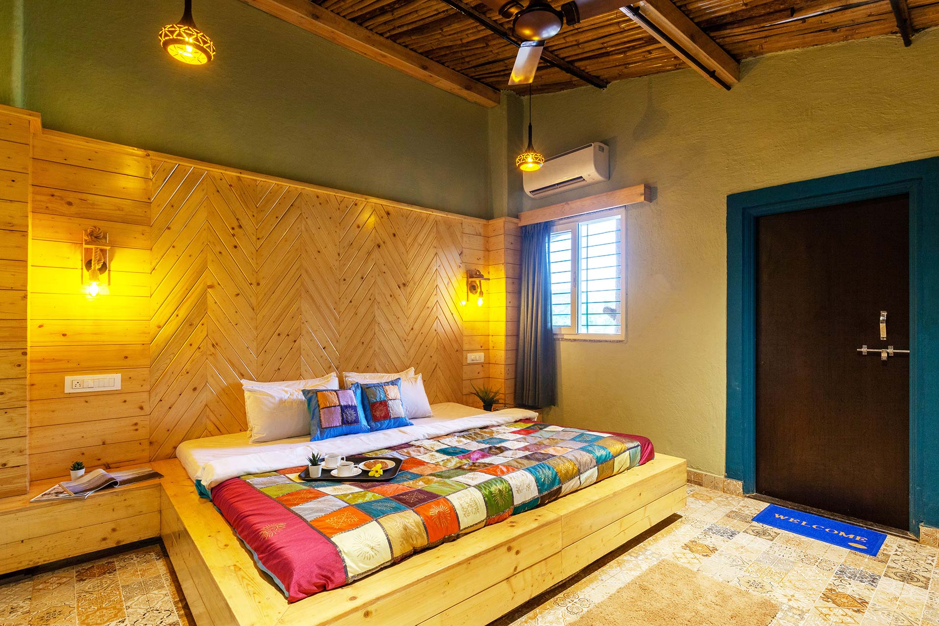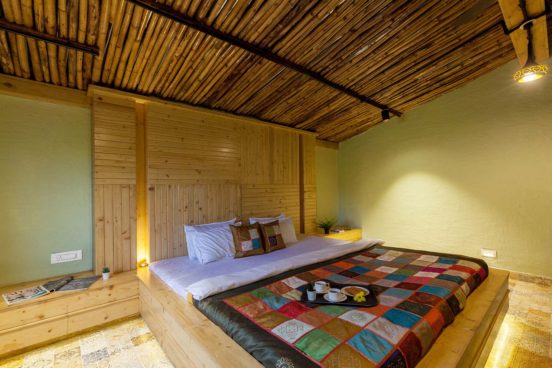 – Adorned in mellow pastels, Warli paintings and eloquent lamps, this room also features a wooden sofa that can seat up to 12 people.