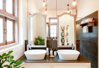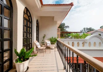 Villa A is a three-bedroom home, part of Fonteira, inspired by traditional Goan Vaddos. It is located in Assagaon, also known as “the Beverly hills of Goa.” The interiors feature natural tones and rustic finishes like wrought iron and jute chandeliers and earthy upholstery. Worth special mention are the various types of flooring used in different spaces: there are vitrified tiles in the living room, vintage-style, colourful cement tiles in the bedrooms and dramatic, black and-white Indian marble laid in the powder room.