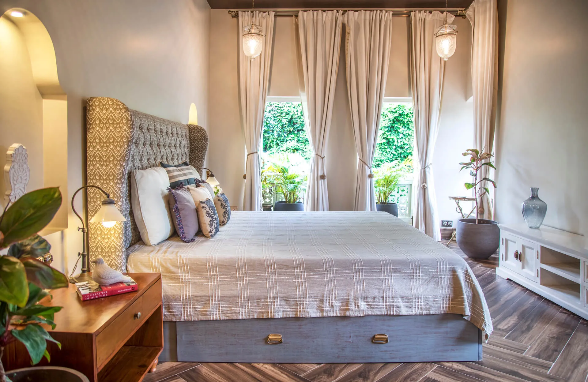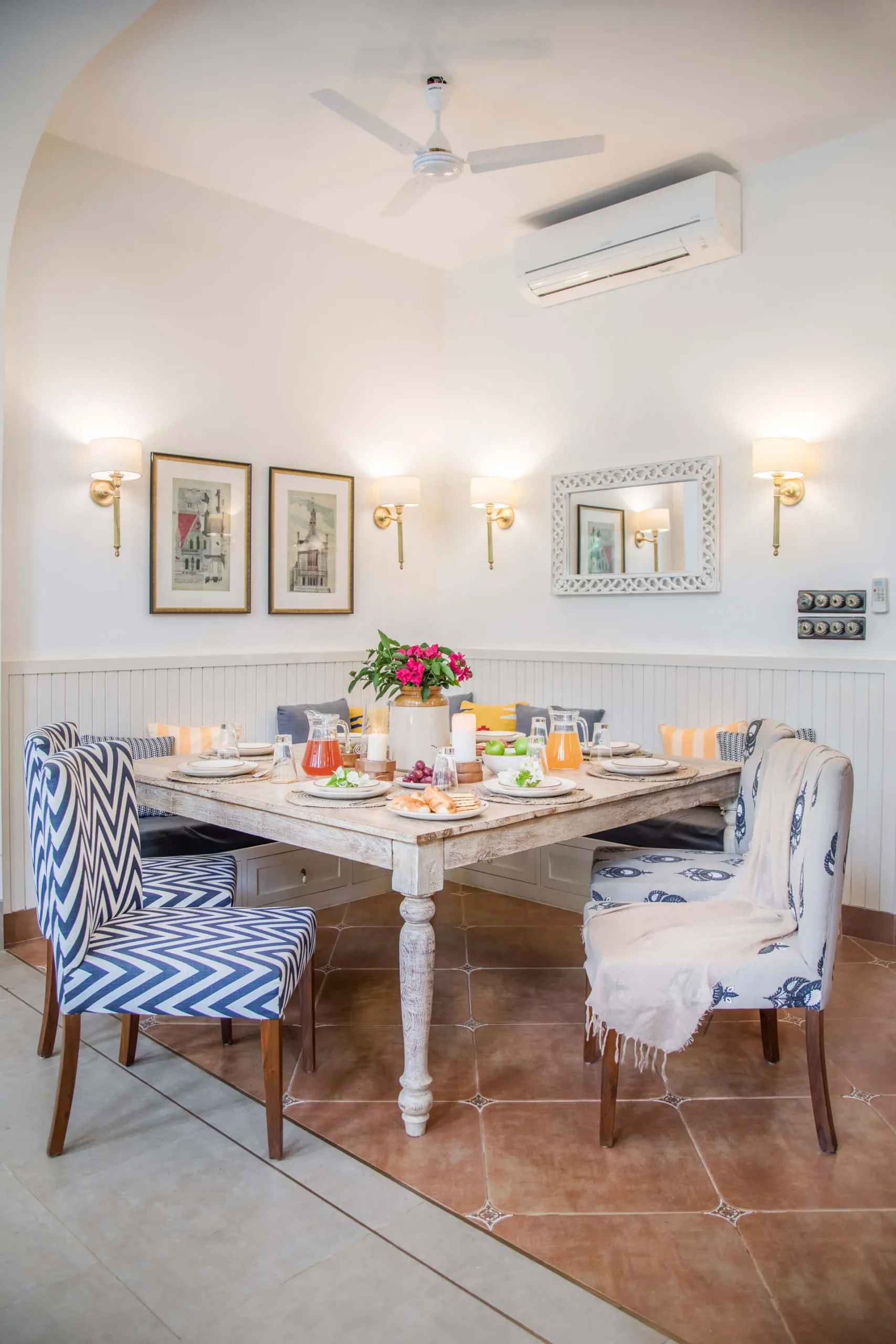 Villa H is a part of Fonteira, a gated community inspired by traditional Goan Vaddos. Located in the quaint town of Assagaon, also known as the “Beverly Hills of Goa”, the home is surrounded by lush greenery and adorned with luxury at every nook and corner. This 3-storey home features a naturally lit living and dining area, 3 ensuite bedrooms, a study, a gazebo and a self-sufficient kitchen for you to cook up a storm in. The home opens up into a beautiful pool area on the ground floor and a cozy terrace on the second floor, perfect for fun times with the kids and your partner or an exclusive evening soirée with your best pals.