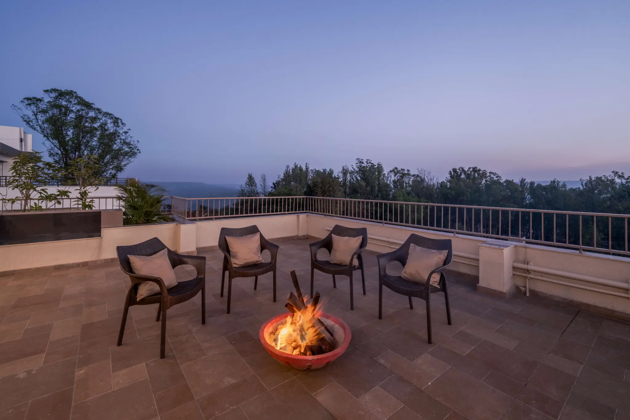 • Head up to the rooftop, where 360° panoramic views of the Panchgani valley make every sunrise magical and every sunset unforgettable. Enjoy bonfires, stargazing, golden-hour chai, or simply unwind in the cool mountain air.