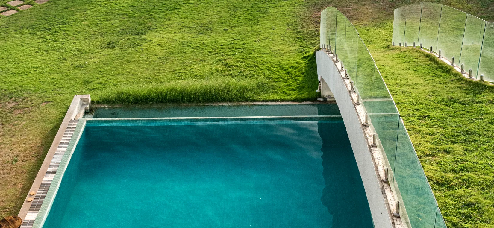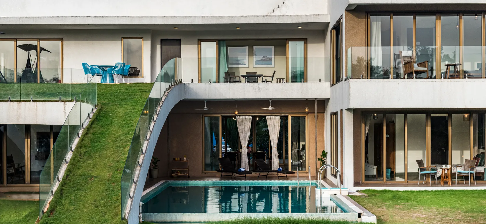 - The first floor of the main house opens up into a balcony that meets the seamless garden through lush green slopes and offers an aerial view of the infinity pool. It is just the perfect spot to click frame-worthy photos.