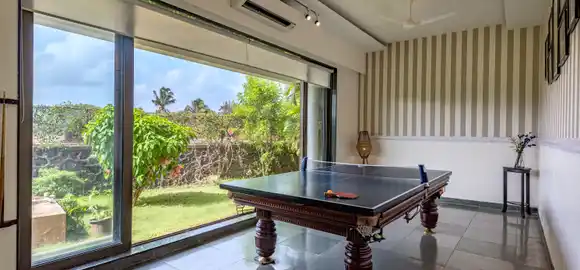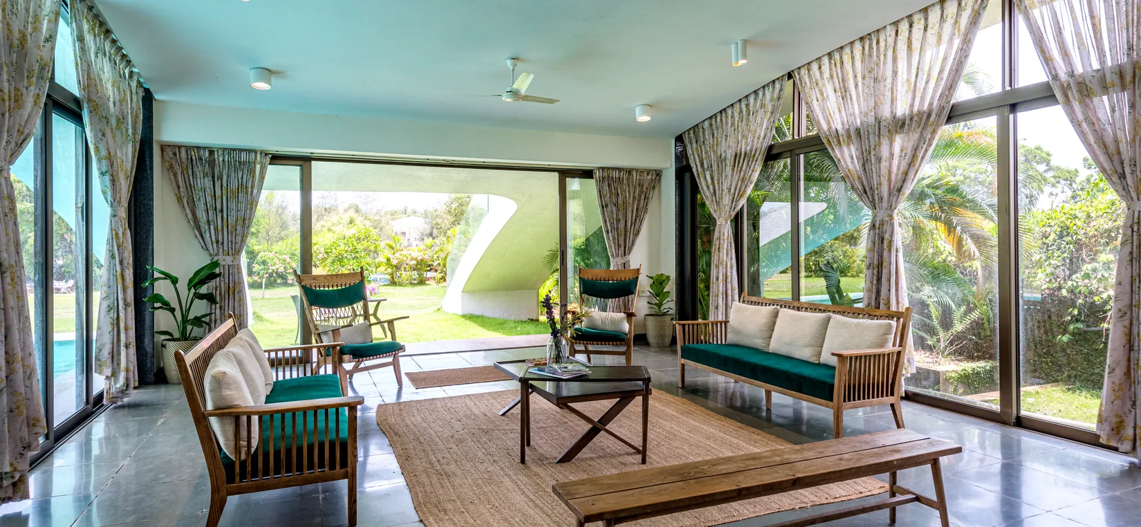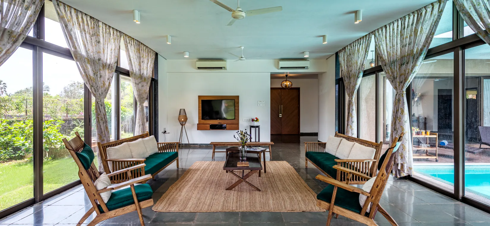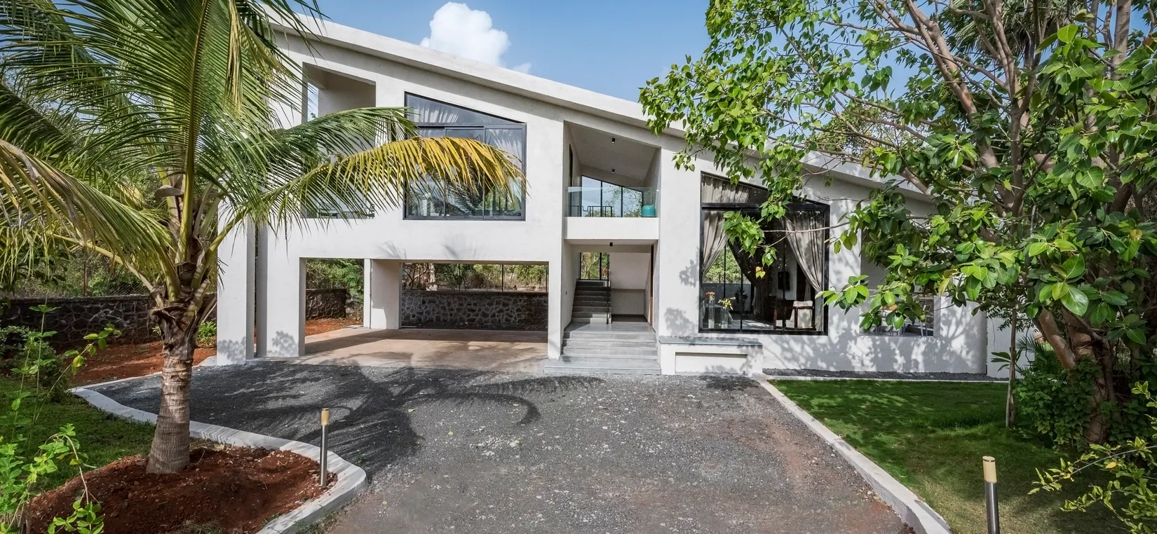 A luxurious 6-bedroom infinity pool villa, where the garden stretches up to the first floor through slopes. Enliven your celebration by the pool, taste Alibaug seafood delicacies, experience sparkling bonfire nights with BBQ, watch adorable birds, etc., 20 mins from Mandwa Jetty