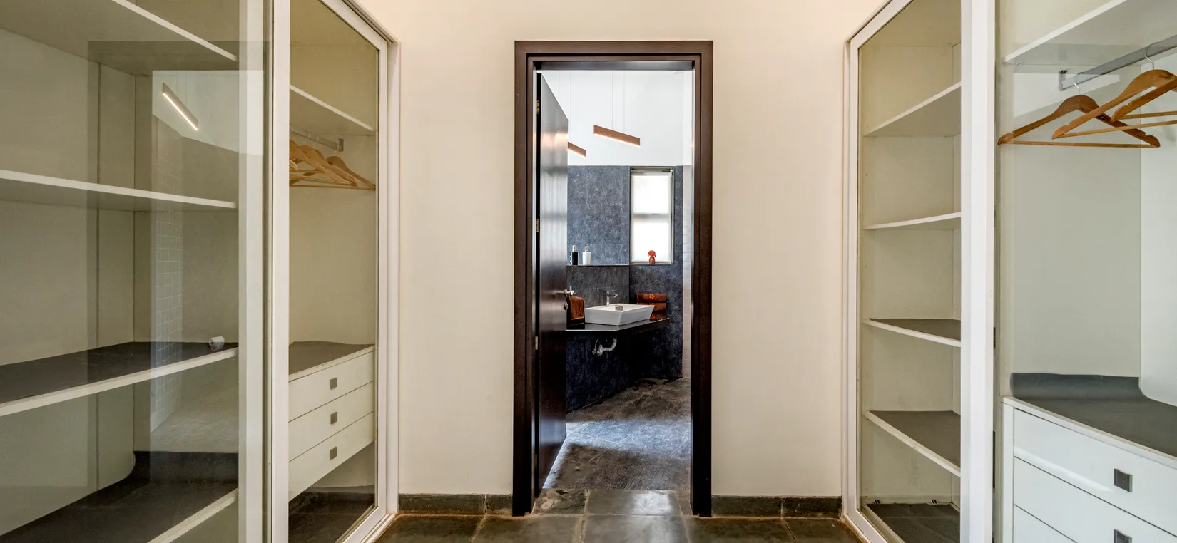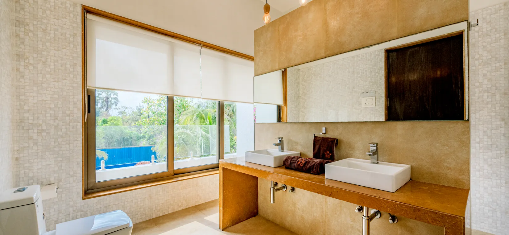 - This villa in Alibaug has 2 structures. Structure 1 comprises one bedroom (with an ensuite bathroom) on the ground floor and three bedrooms (with ensuite bathrooms) on the first floor – each with a view of its own. The pool-facing living room consists of the dining area, a sit-out patio with a swing and the powder room. Structure 2 comprises one bedroom (with an ensuite bathroom) on the ground floor and one bedroom (with an ensuite bathroom) on the first floor.