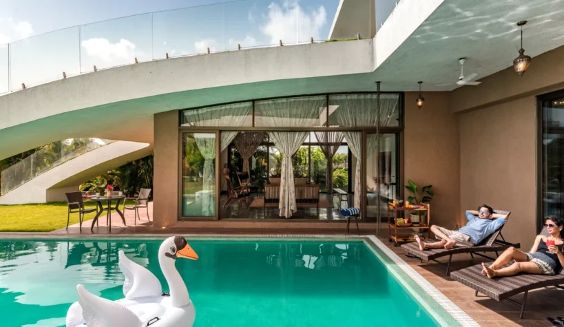 - Inspired by the seamless garden that rolls right up to the first floor, is a 6-bedroom pet friendly villa with an infinity pool near Kihim Beach, Alibaug. Featured by India Food Network, News18, Condé Nast Traveller, ET Hospitality World,Grazia and overlooking lush green views and uninterrupted skies, this multi-structure villa in Alibaug is 20 minutes from the Mandwa Jetty and only an hour away from the Mumbai Port by the RoRo.