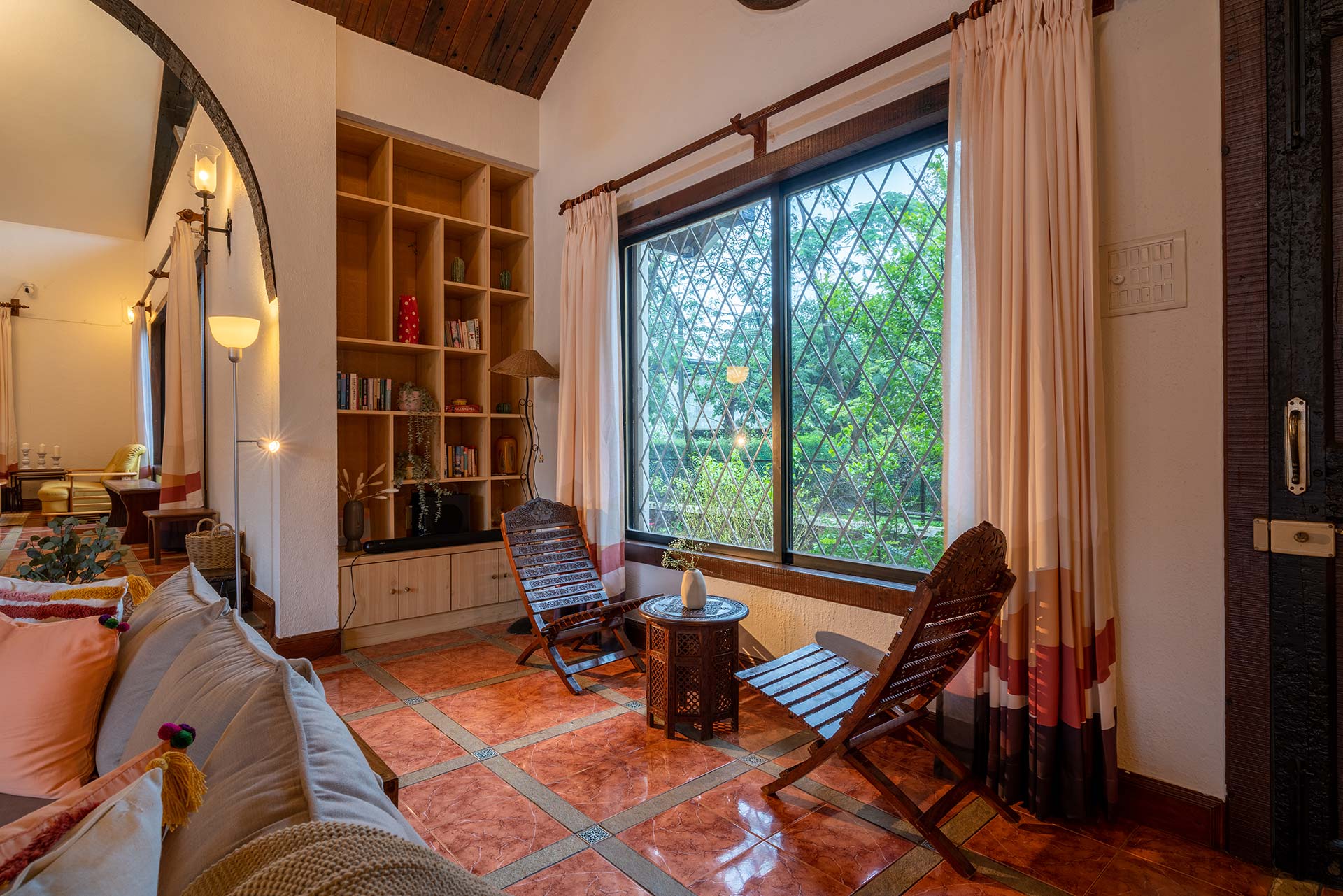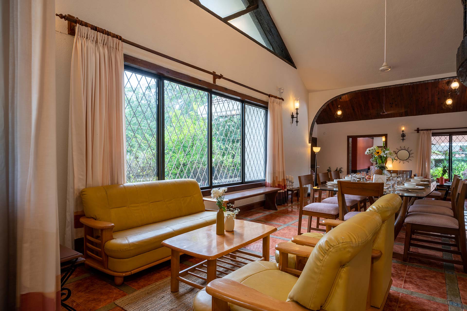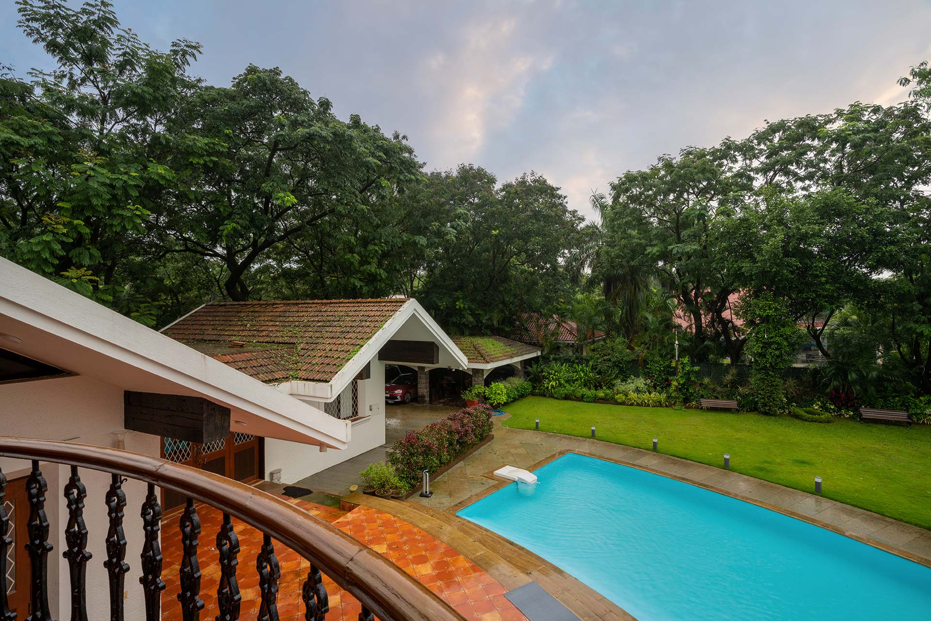 The charming house resting in the majestic mountains of Lonavala is the perfect location for a cosy country getaway. This house was fabricated in a modern style, but it has a vintage feel about it. It has a contemporary twist that adds just the proper amount of luxury to be snug and pleasantly sumptuous for that perfect getaway. A delightful outdoor heated pool adds to the ambience of comfort and relaxation, and the home’s traditional suburban exteriors blend with the surrounding bright green and brown surroundings. This property is the ideal refuge for people who want to escape their hectic everyday life and rejuvenate in the peace of nature.