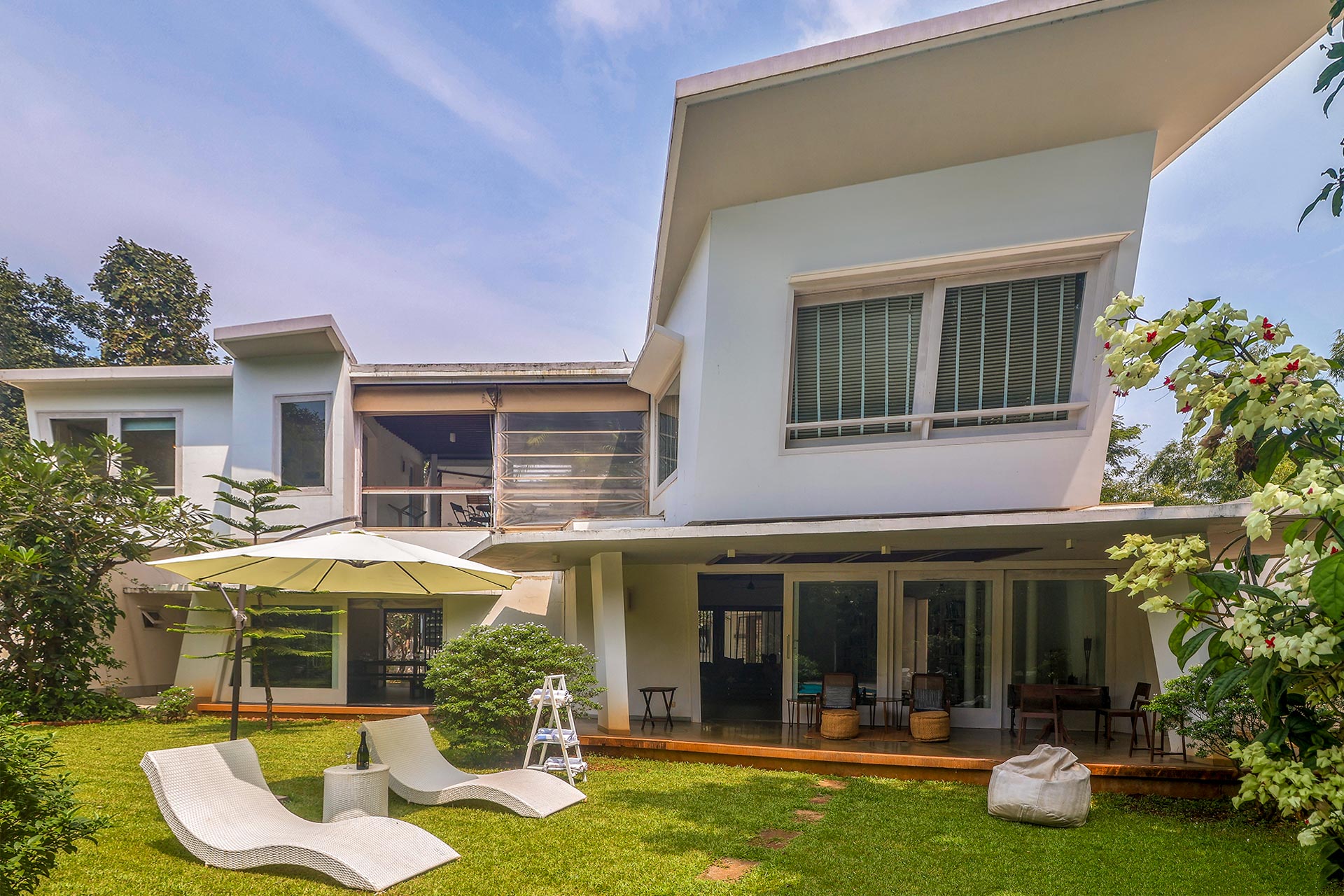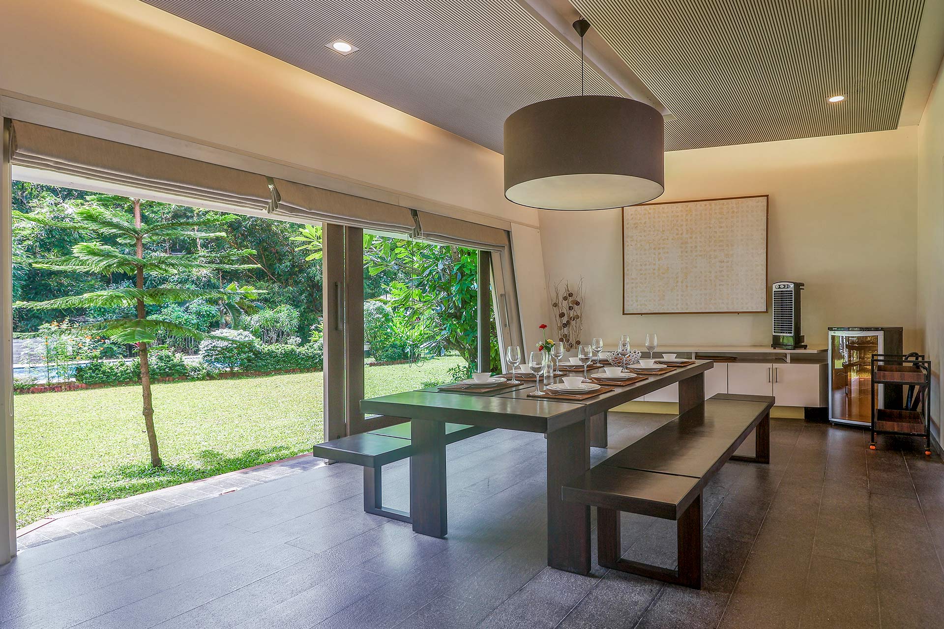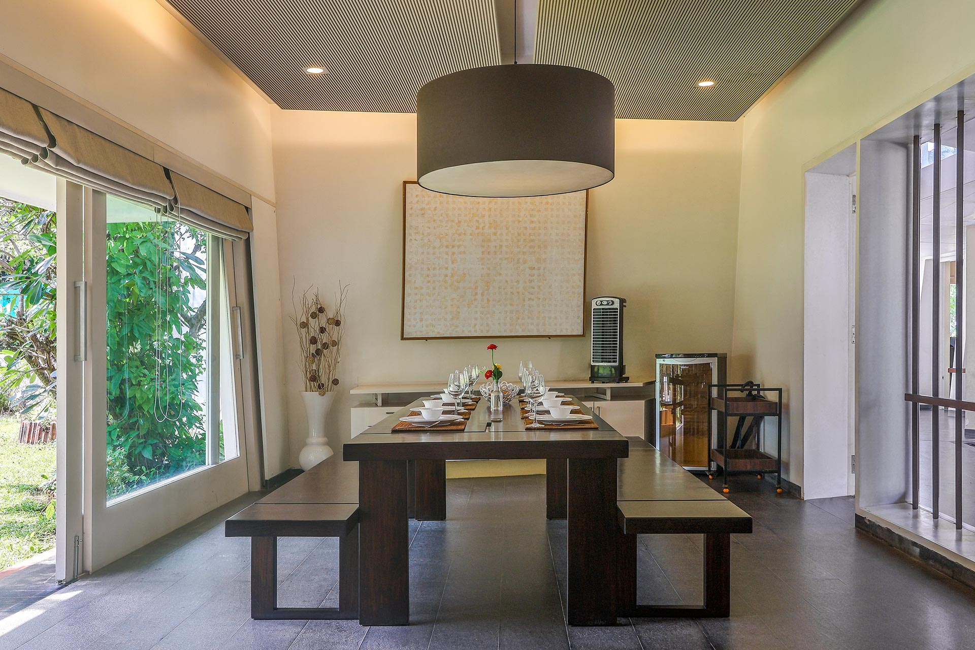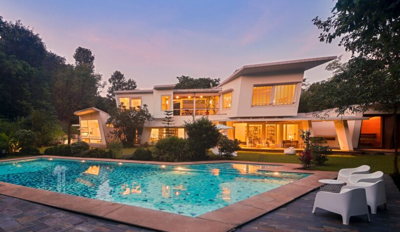 Beautifully appointed, this calming home combines Japanese-inspired design, natural materials and tranquil recreational nooks to create a sanctuary of zen and calm along the Arabian coast. In complete isolation and privacy, this home blurs the boundaries between indoor-outdoor living. Find a breezy spot to unwind with a good book in the dotted sunrooms, or kick back on the front porch while soaking up the glistening sunshine. You can’t help but notice the art pieces and furniture that make the passages of this peaceful nest look no less than an art gallery in the bylanes of Tokyo. The lack of TVs means the stage is set to unplug from the virtual world and reconnect with the physical one. Beyond this luxurious home, you’ll find ducks to feed at the Dhokawade Pond a five-minute drive away. Spend afternoons moseying around the quaint streets of Alibaug, finding delicious authentic culinary spots or dine at Boardwalk by Flamboyante which is a dreamy spot to spend the evening with the beautiful view as your background.