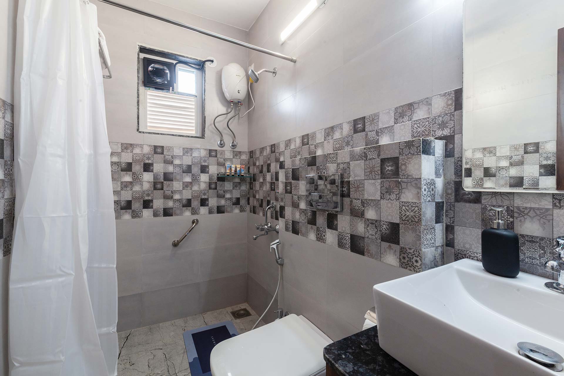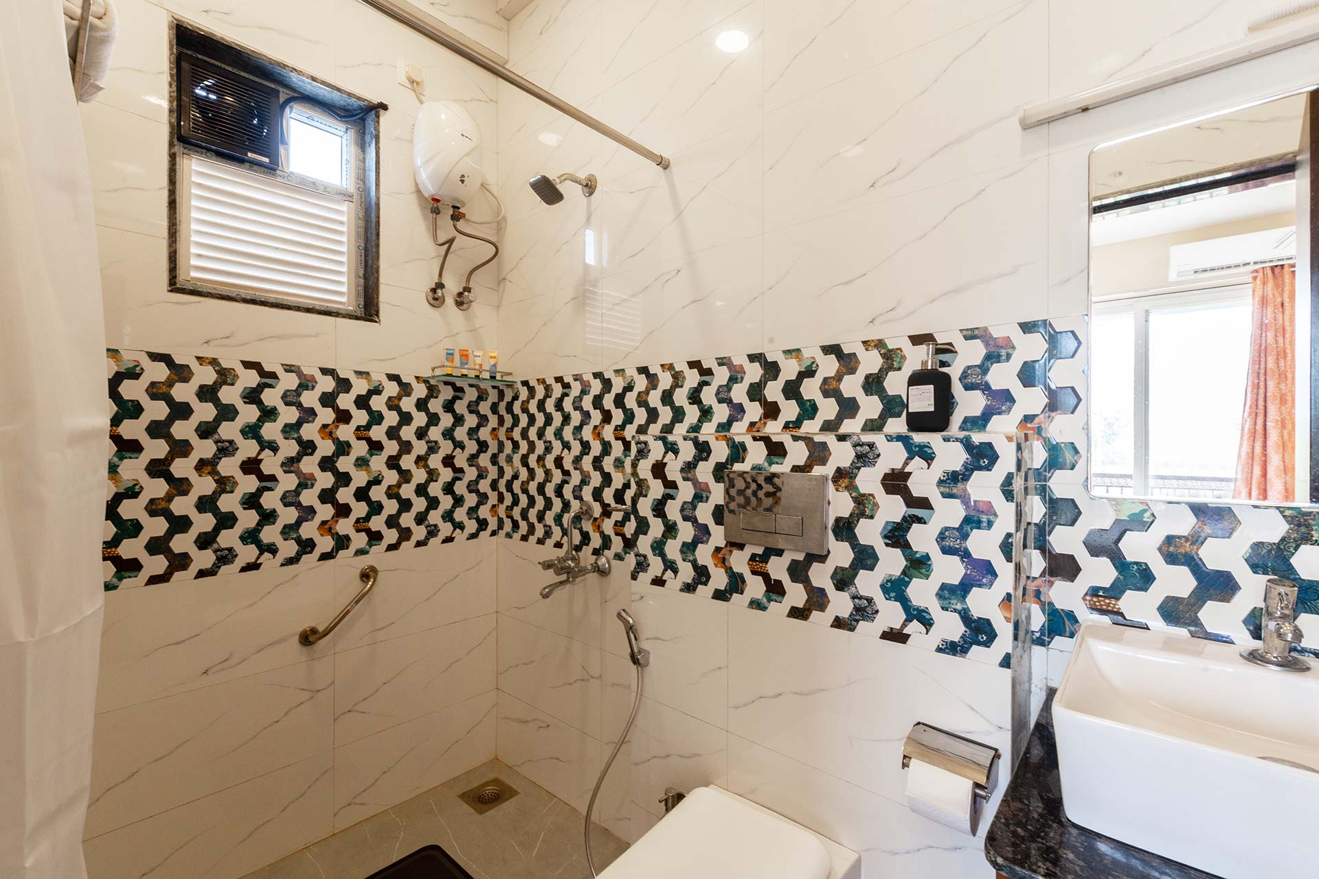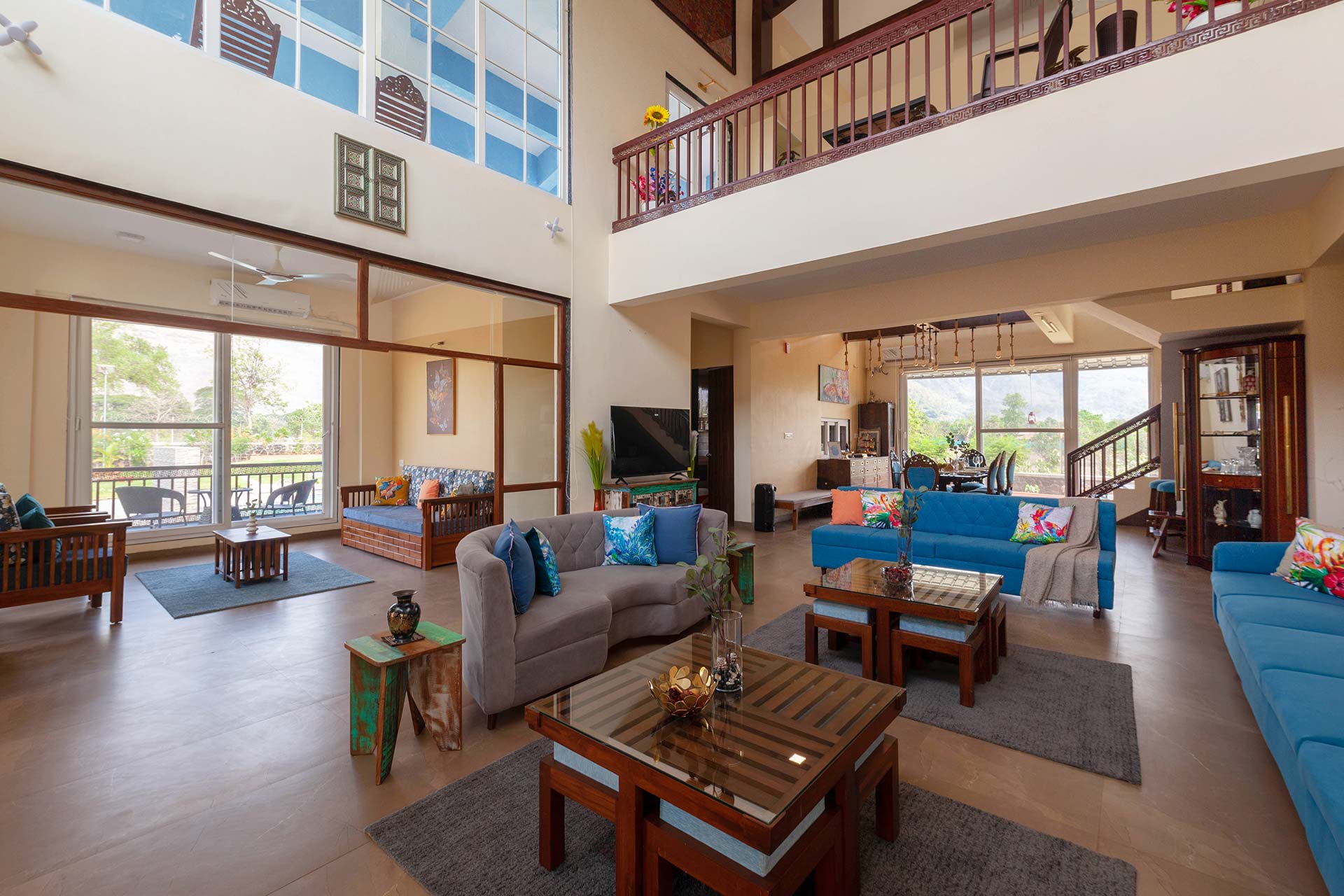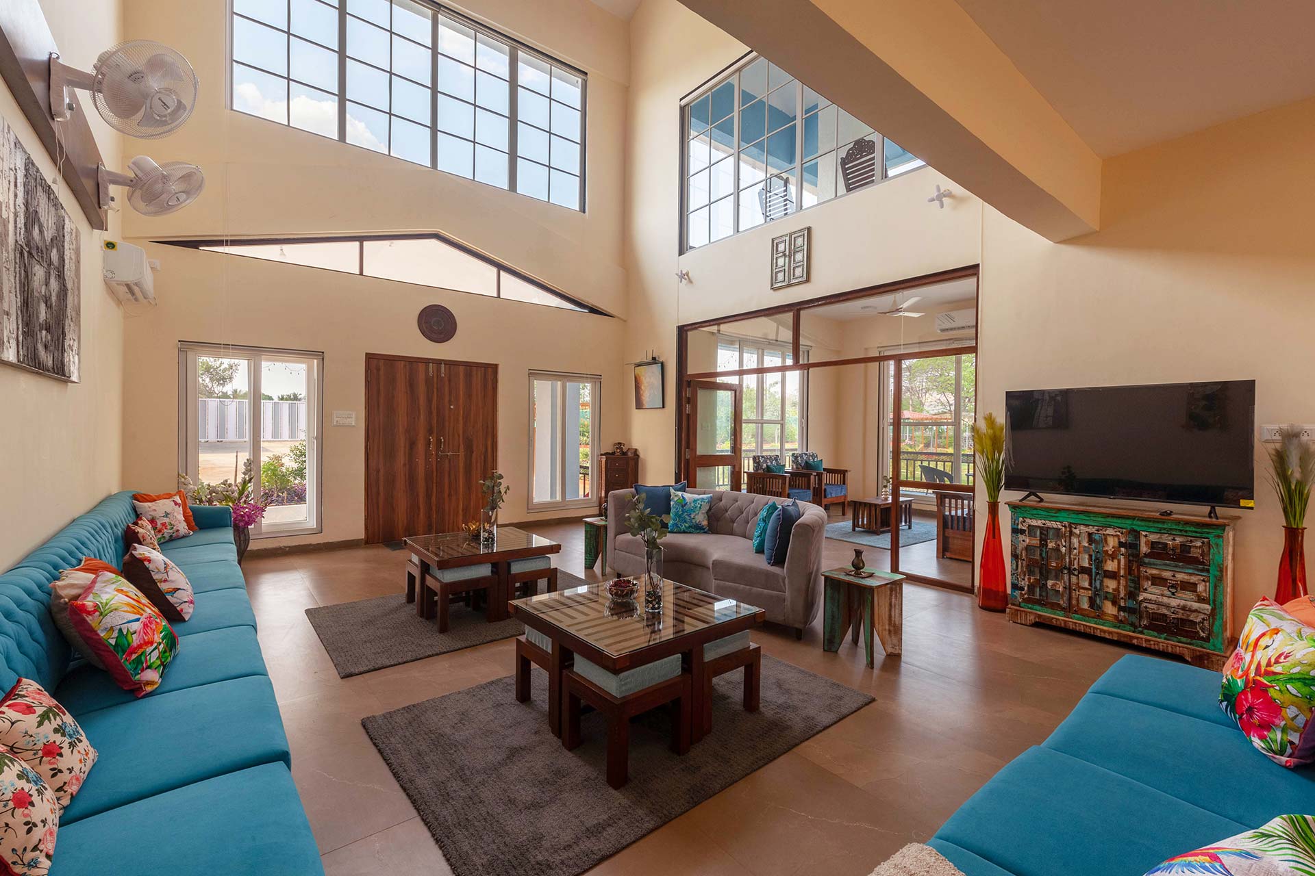- Please note that the living room has an extended covered area with a sofa-cum-bed and bathroom where extra guests can be accommodated.