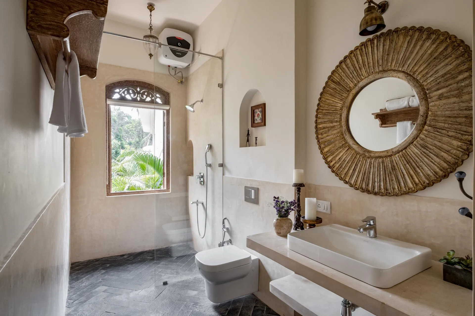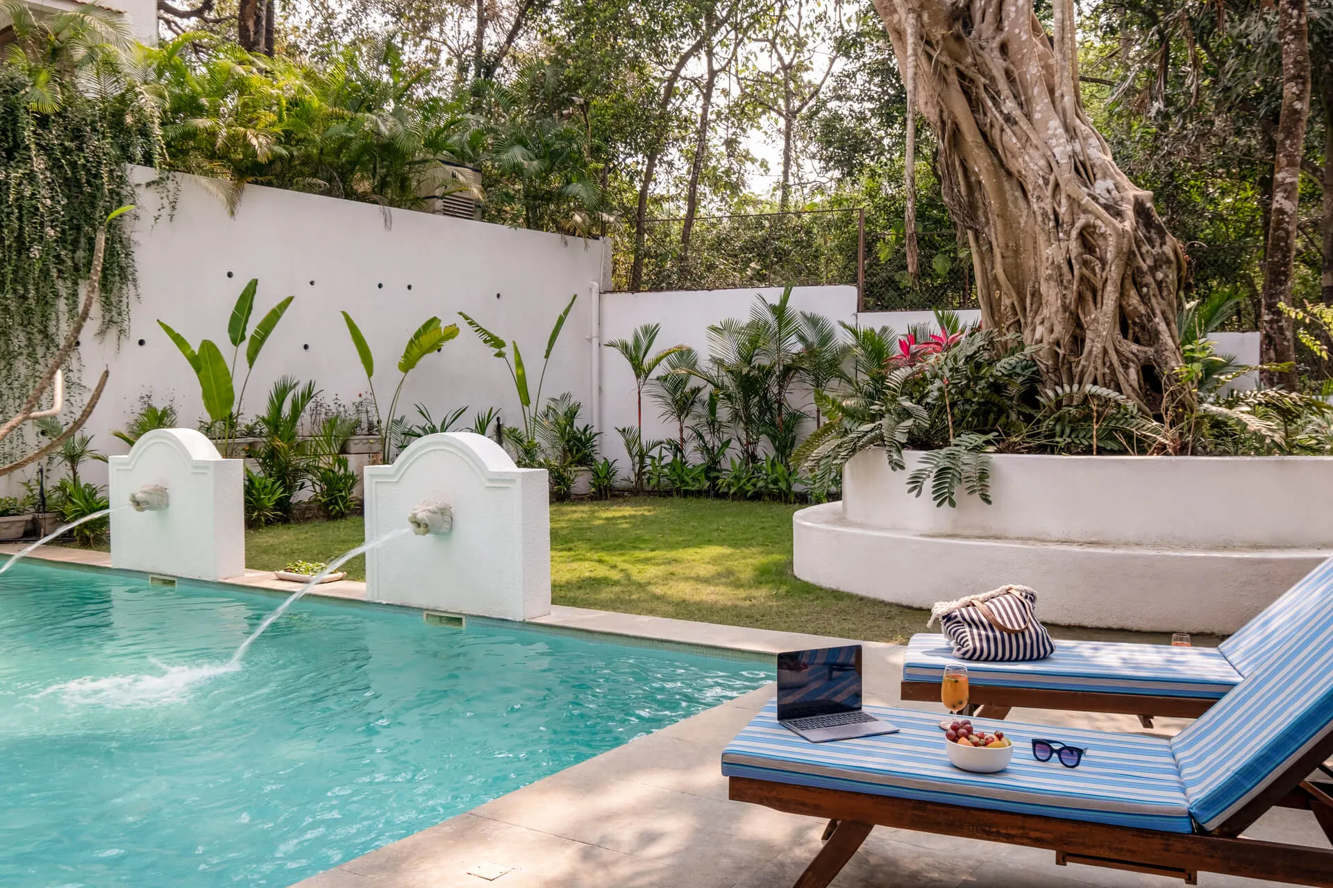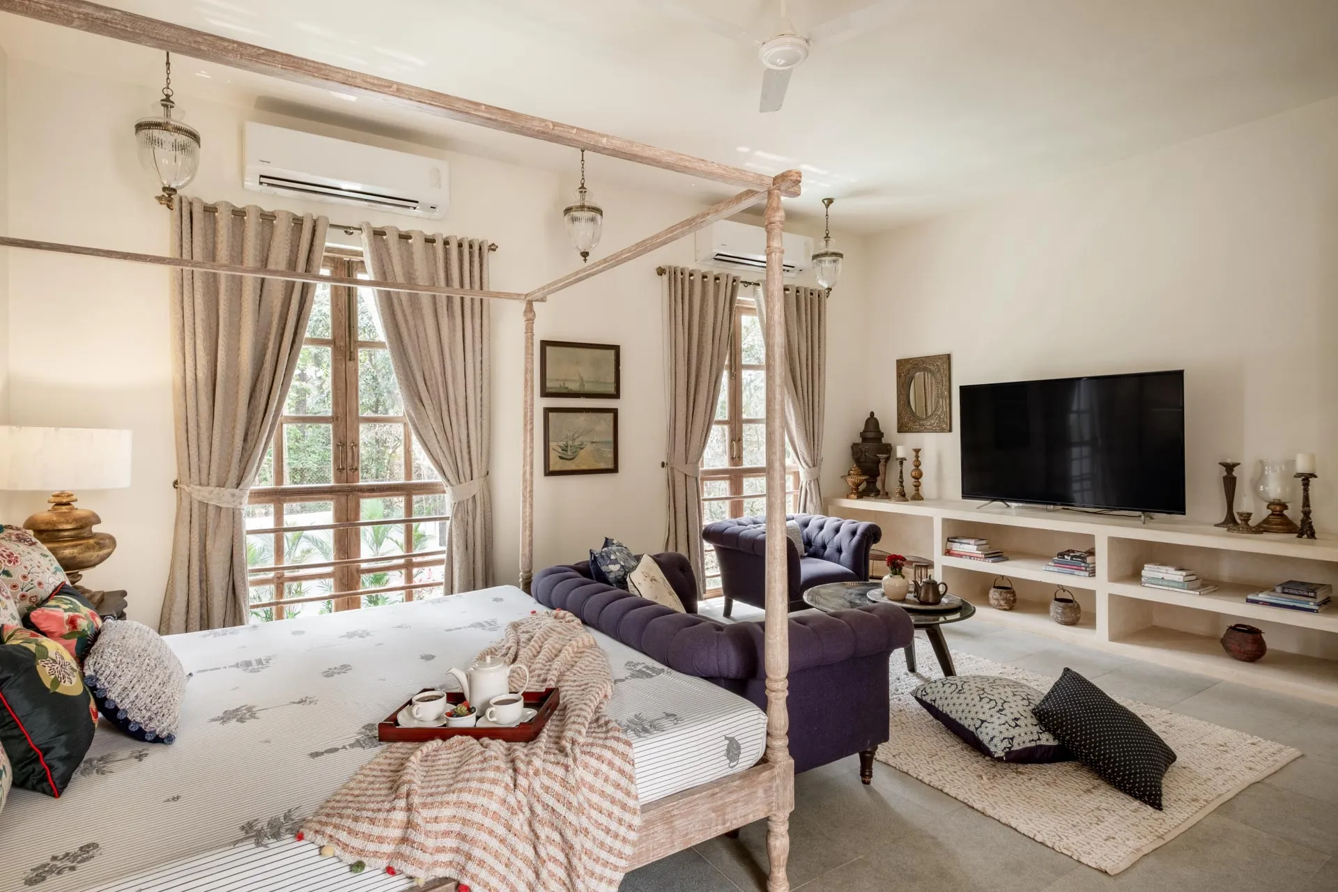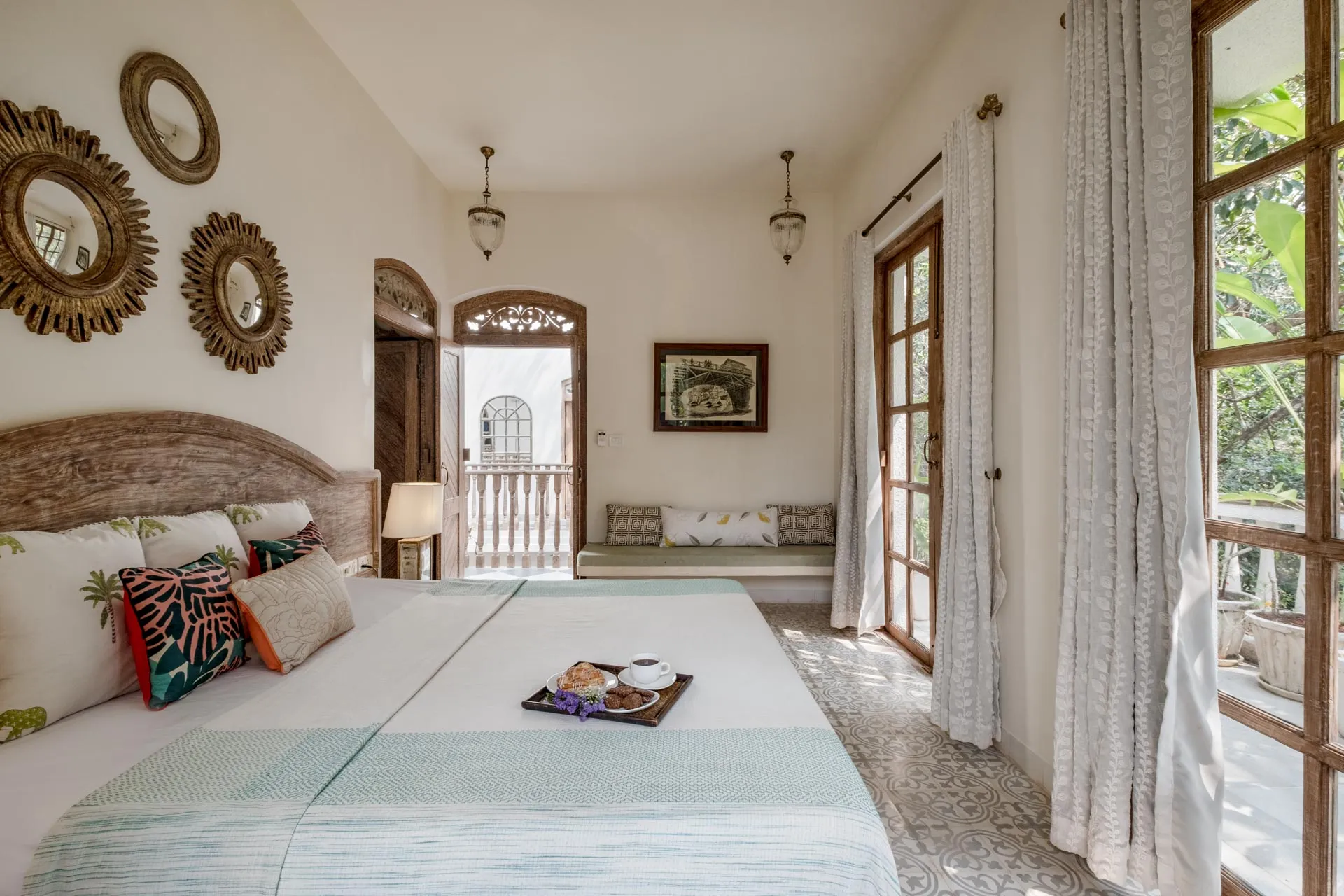 Igreha’s Villa F is surrounded by lush foliage which feels deeply restorative. During summers, you can see the tempting vermilion and golden hues of ripened mangoes dangling from the trees. In the spring, you can smell the aroma of fermenting cashew fruit on its way to becoming the locally made urak (also known as Goa’s Jungle Juice).