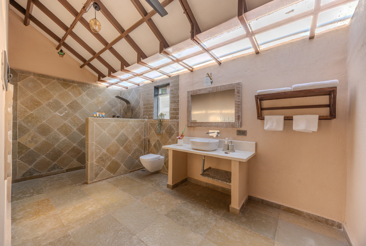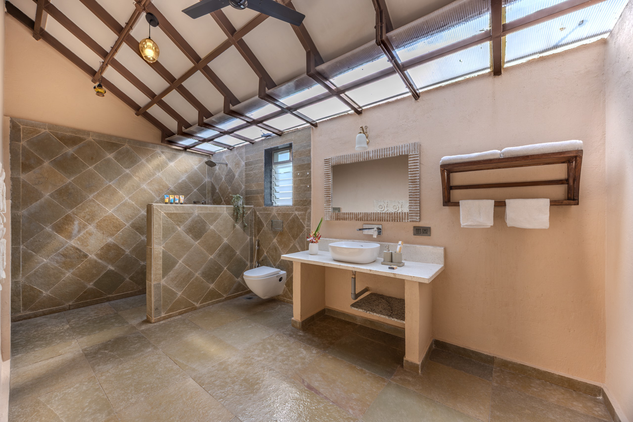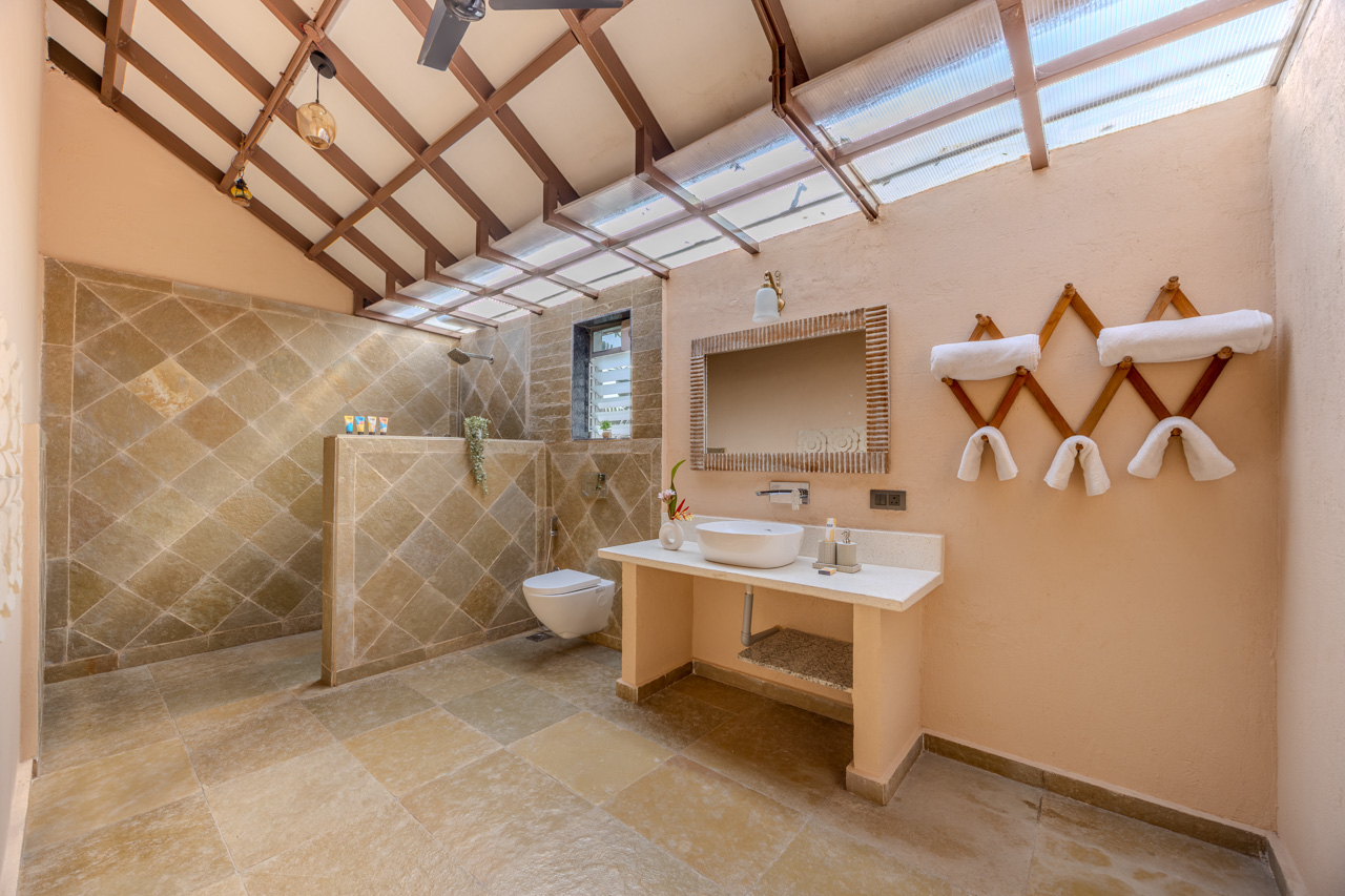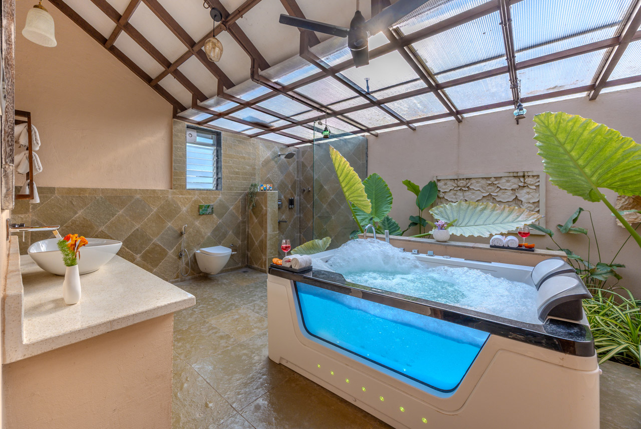 Lush open-air bathrooms, surrounded by greenery, where bathtubs and jacuzzi turn relaxation into ritual