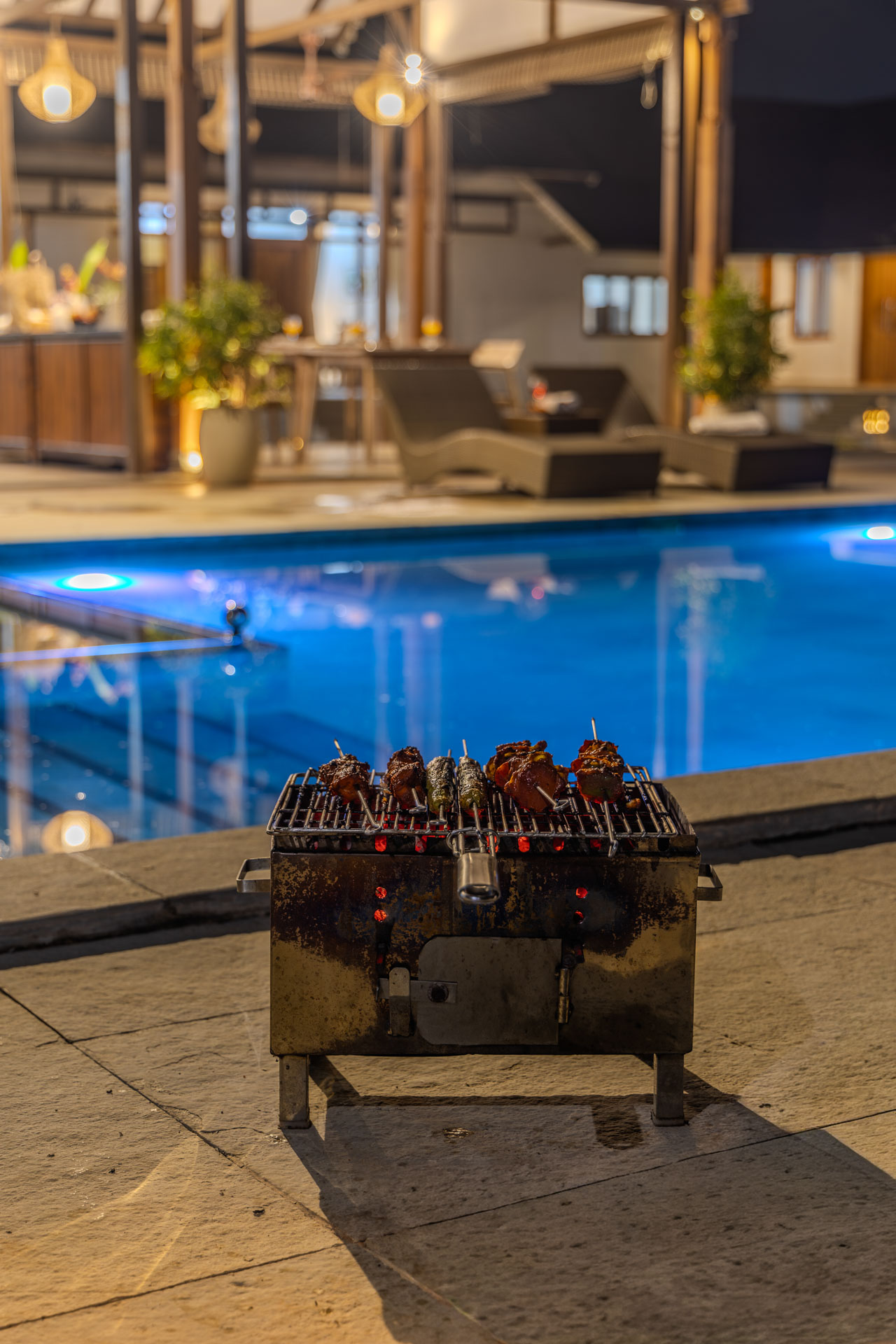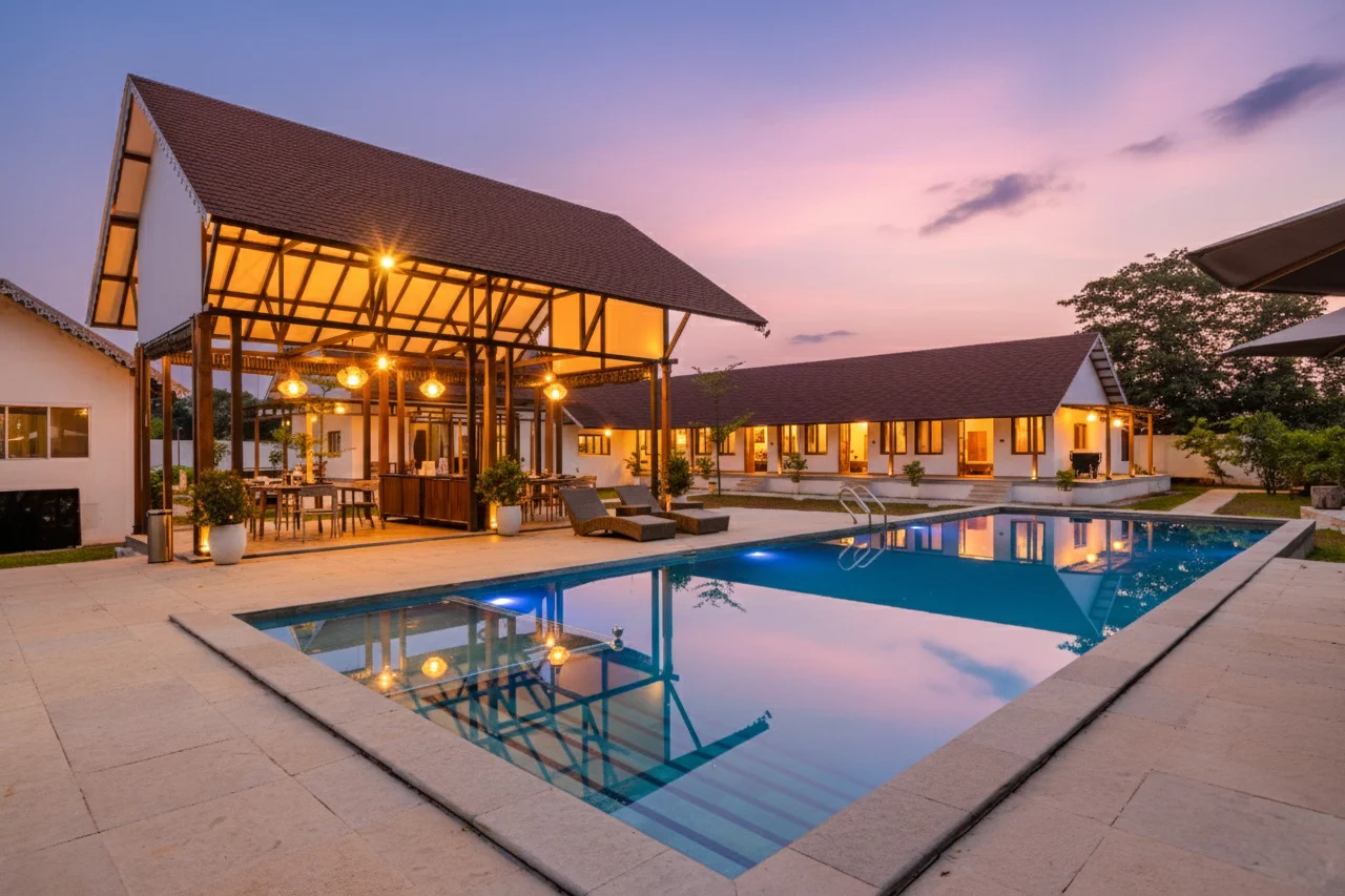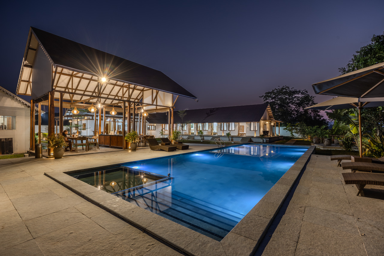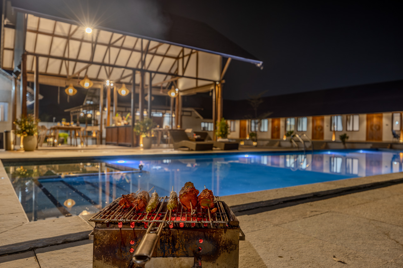 Your day at Impiana unfolds gently, like a slow dream. Wake up to the soft glow of sunlight spilling into your cottage and the sound of birds greeting the morning. Begin with a leisurely swim in the pool or sip your coffee on the verandah, surrounded by the earthy calm of Bali-inspired architecture. After breakfast, unwind with a long soak in your open-to-sky bathtub or jacuzzi, where the fragrance of tropical greens lingers in the air. By afternoon, stretch out on the lawn, read under the shade, or enjoy an indulgent meal in the gazebo overlooking the water. As the day eases into evening, step out to explore Karjat’s scenic trails, hidden waterfalls, and ancient caves—each corner offering a glimpse of nature’s artistry. Return just in time for sunset, with lanterns flickering softly and the sky mirrored in the pool, closing your day in a hush of quiet contentment.