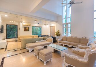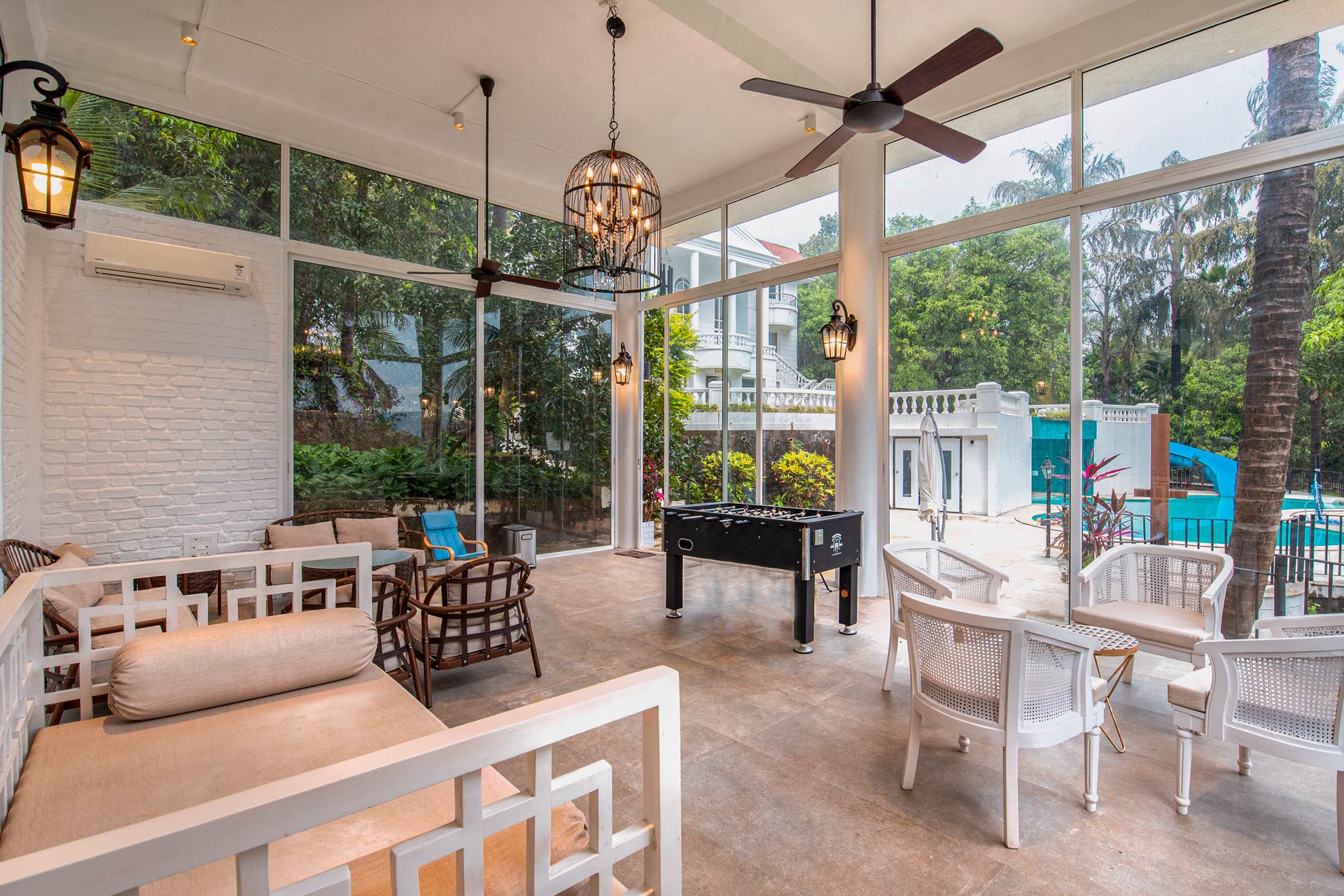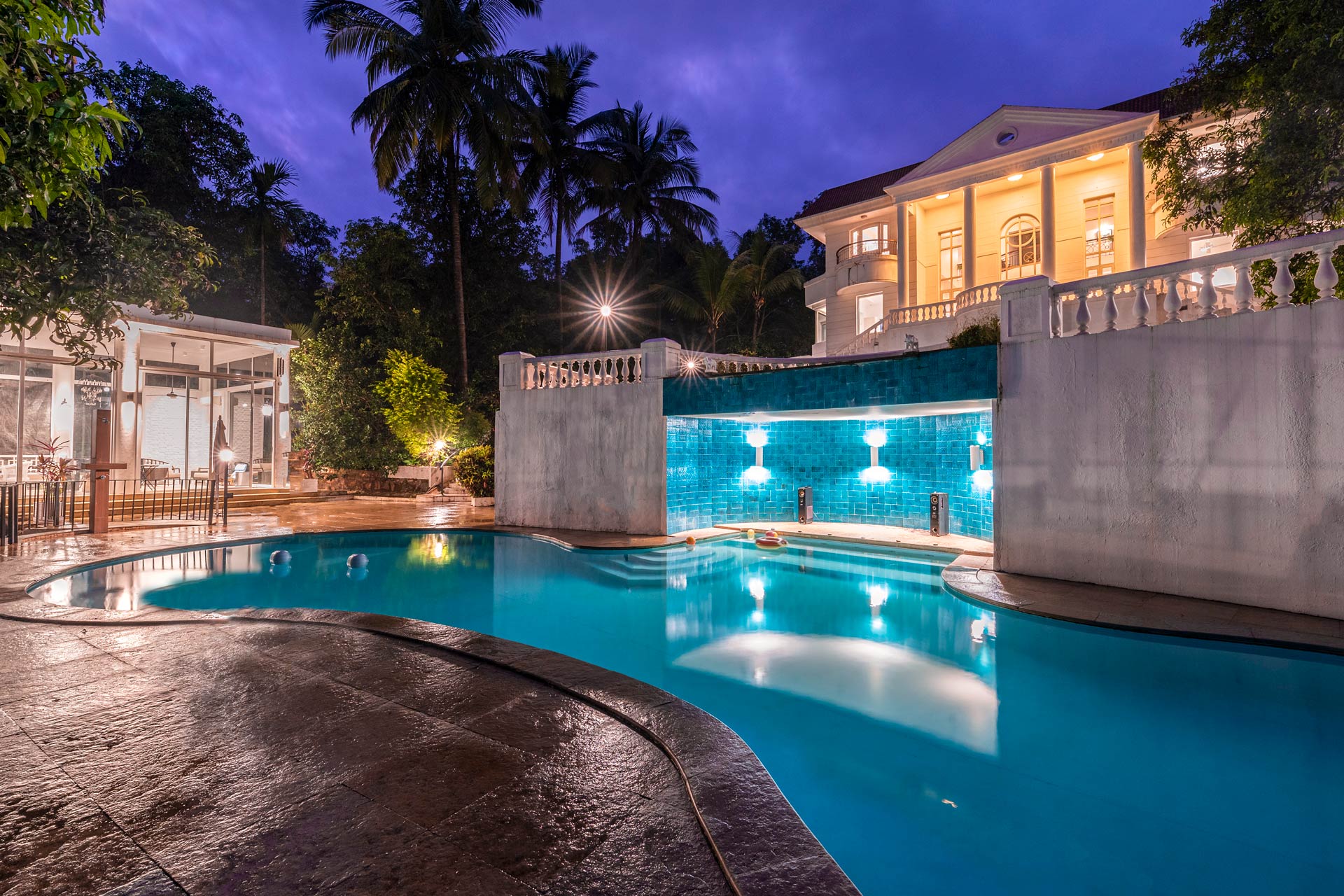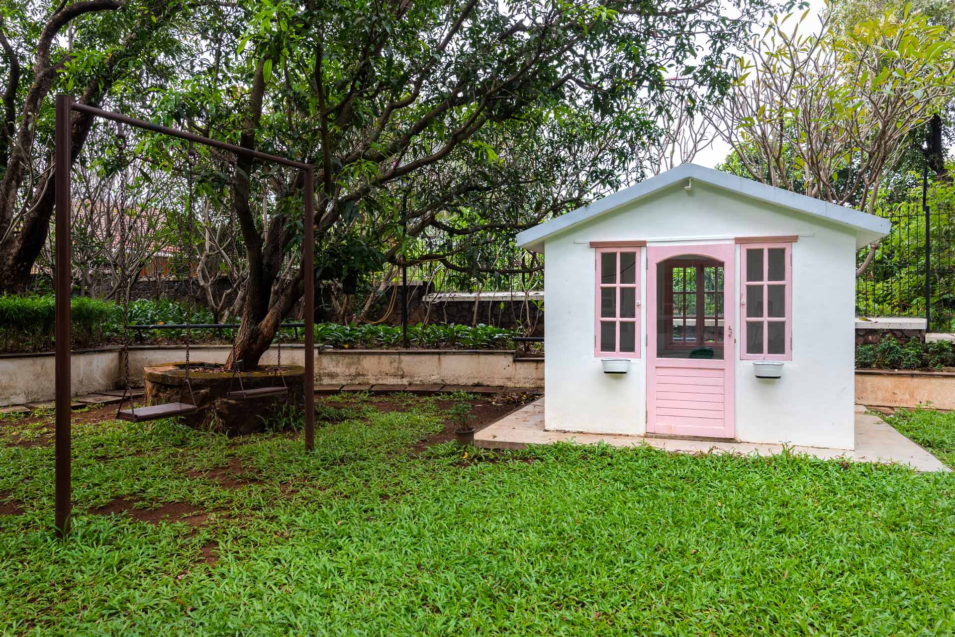 Ivory Crest is a palatial 7BHK villa that exudes grandeur with its tall pillars, spacious interiors and roomy corridors. What will particularly catch your attention is the massive private pool with a waterfall, which is perfect for family stays with kids. The hall and lawn area has ample seating arrangement for a large group gathering. There is a children play area at the back lawn, overlooking the lake, which comprises swings. And, don’t miss the banyan tree for a great photo-op!